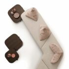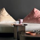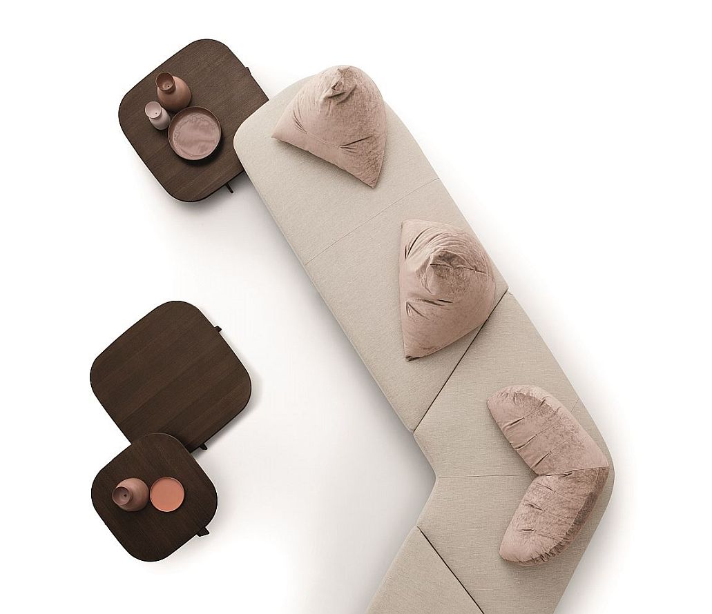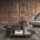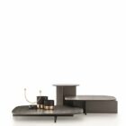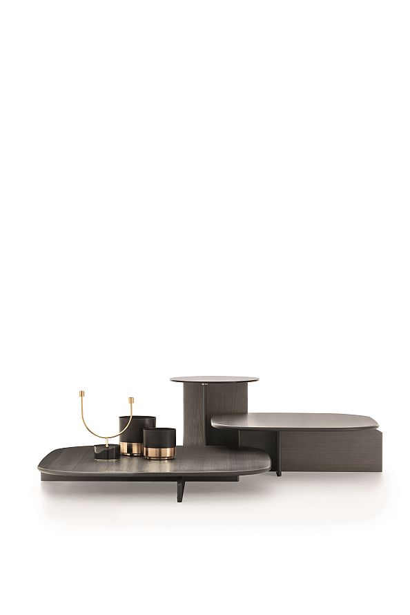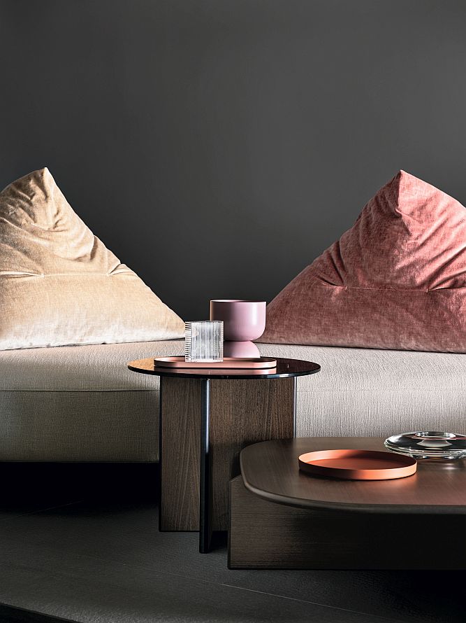 The three Polyura coffee tables are inspired by the Papilo sofa which they complement in an organic way. In an ideal arrangement, the largest tabletop emerges from under the sofa like a platform/coffee table. Nevertheless, it can of course be used in different ways. The shape of the tops and legs coherently complements its minimalist design. It’s available in three finishes: Eucalyptus, Grey wood and lacquered glass for the round table, three sizes and three heights.