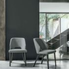 A chair with a strong personality that loves drawing attention to itself: its sloping back legs, its backrest with round, flared sides, its prestigious upholstery. No matter whether furniture for homes or contract furniture, design is always a style choice.