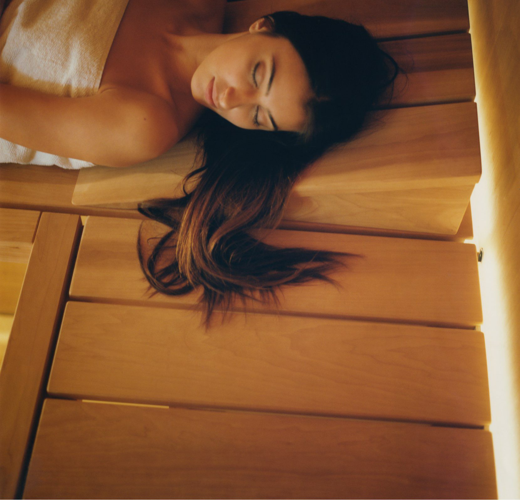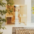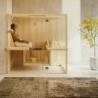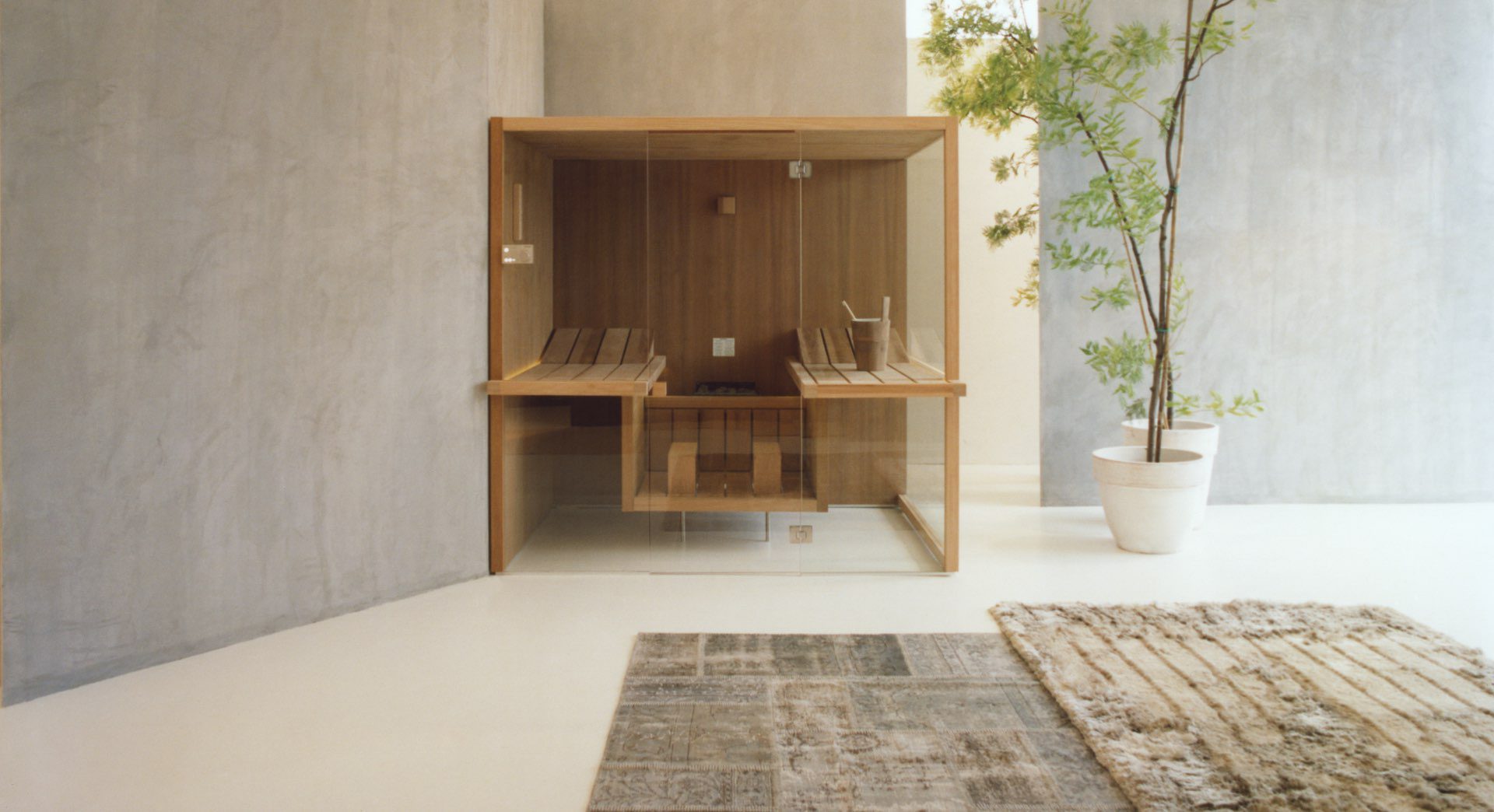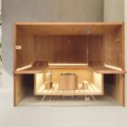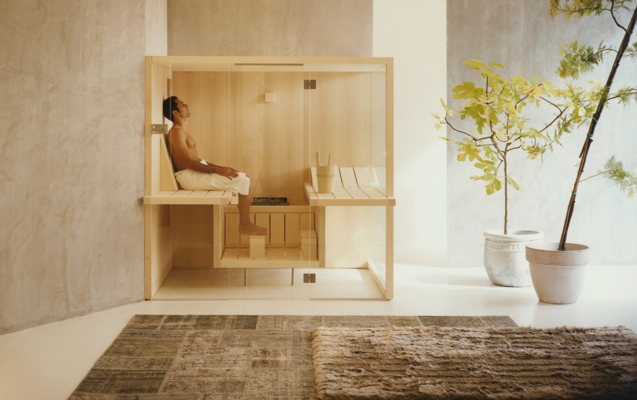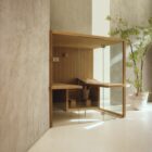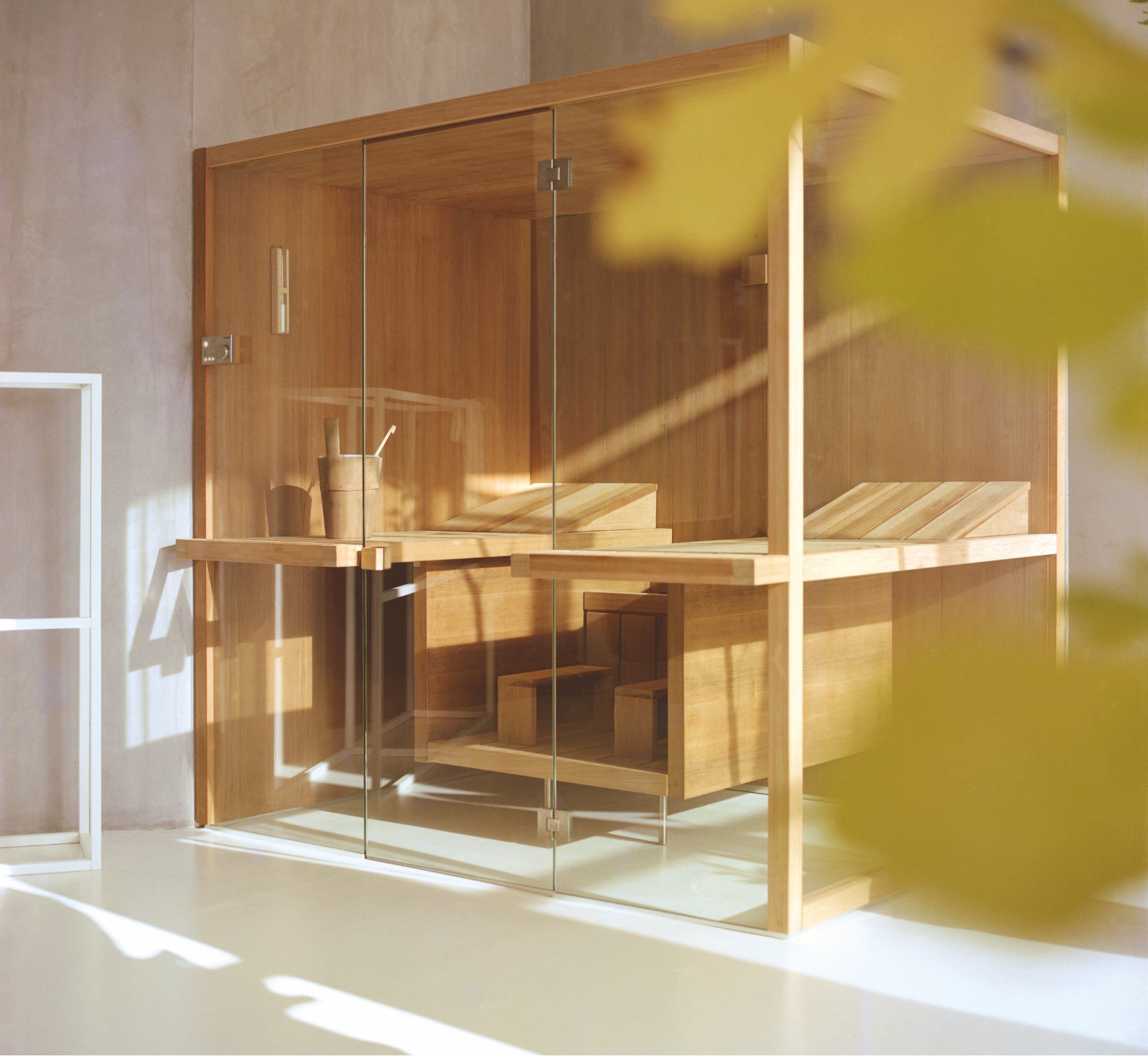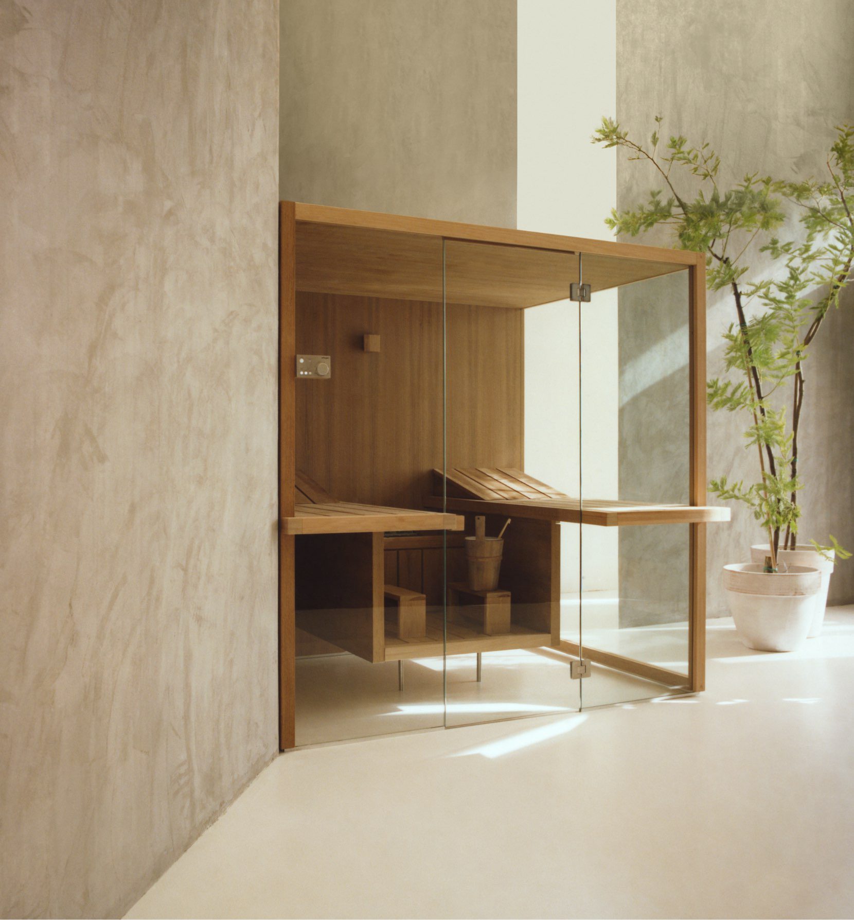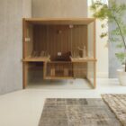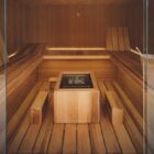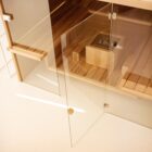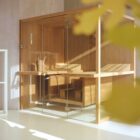 The suspended benches create a lightweight design enabling the sauna to be installed on existing flooring. The centrally placed heater makes Air the ideal meeting place to relax in company and the bench seats project outside, creating a handy towel holder and shelf. The interiors are made of luxurious aspen wood, either natural or heat-treated, which is very long-lasting. The full-height glass walls in toughened glass and the LED lighting underneath the benches enhance the light and airy atmosphere.
