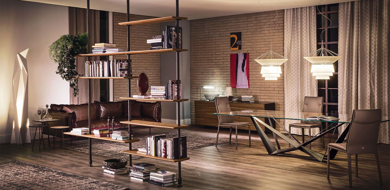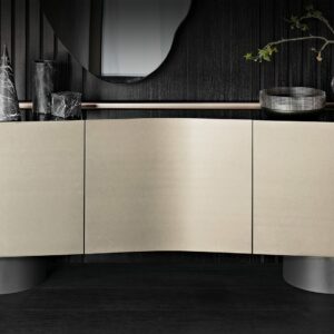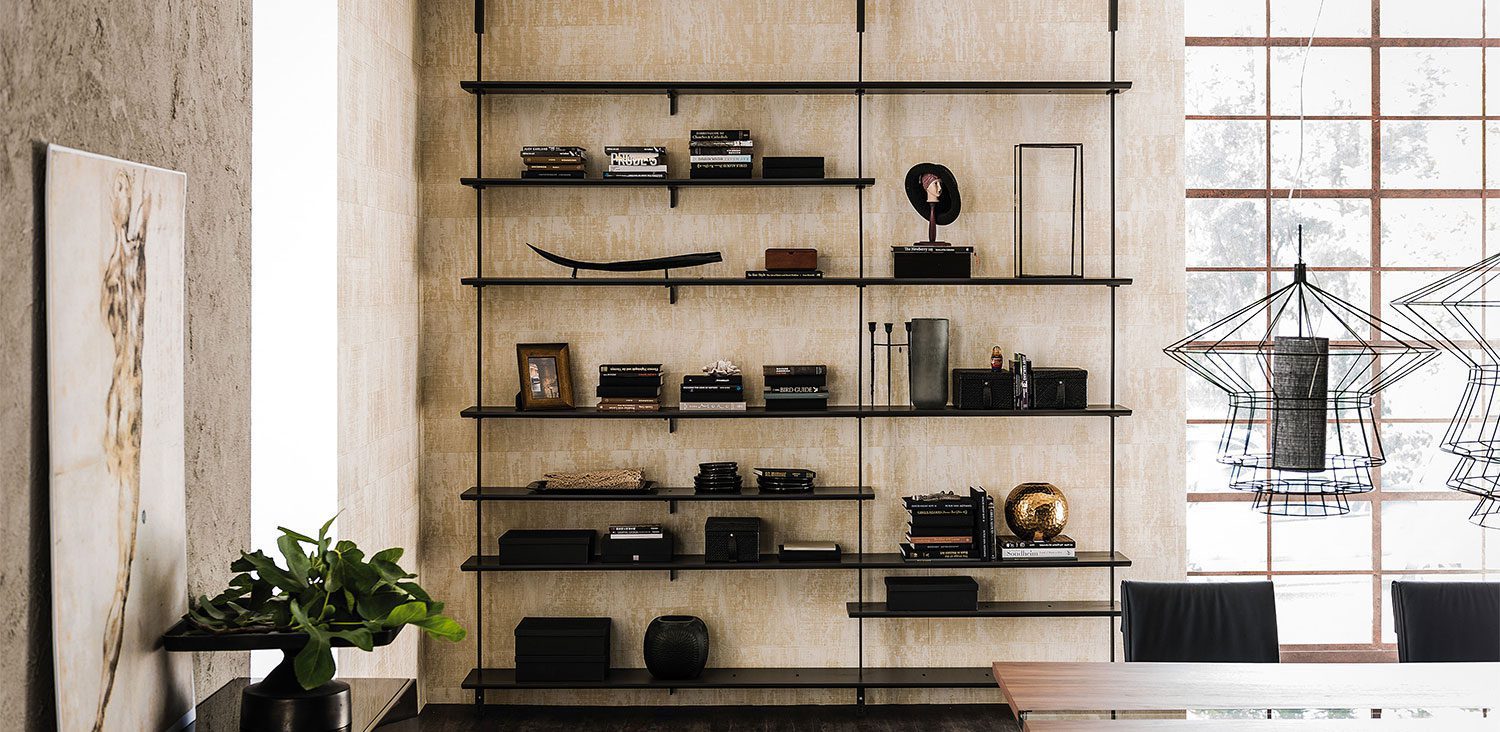 Brackets and pillars in titanium (GFM11), white (GFM71), black (GFM73) or graphite (GFM69) embossed lacquered steel. Shelves and containers in Canaletto walnut (NC), burned oak (RB), embossed white (GF71) or graphite (GF69) painted wood or Brushed Bronze.