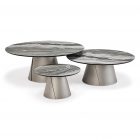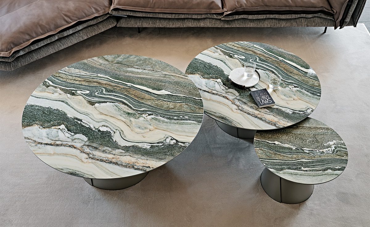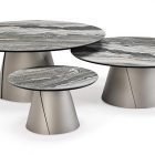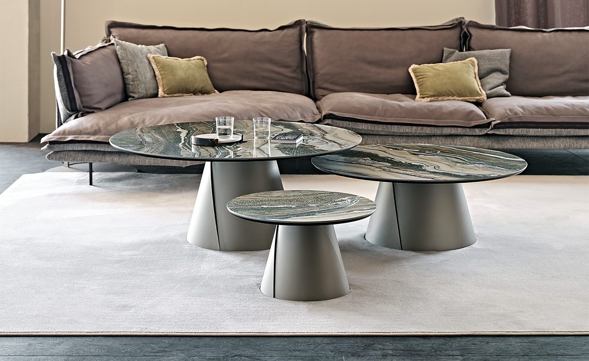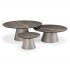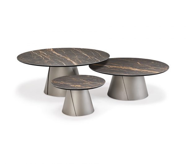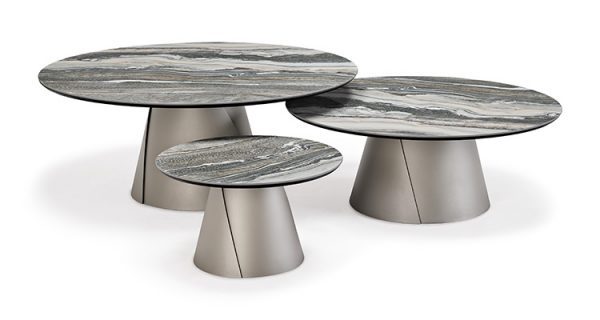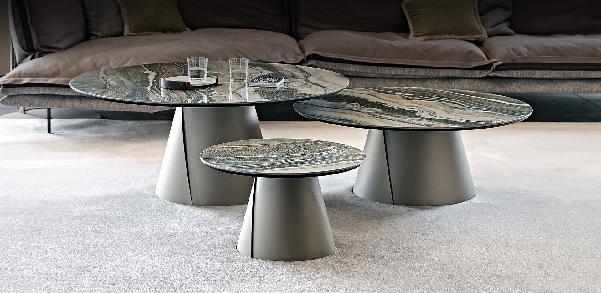 Albert Keramik’s modern round coffee tables enhance the design living room with a linear yet simultaneously refined style. Composed of two overlapping elementary geometries, these designed coffee tables express themselves to the fullest when placed side by side with different heights and sizes. The play of round tops on several levels lends dynamism to an environment furnished with understated elegance, where modern ceramic coffee tables become the stars. Giorgio Cattelan has designed a conical metal base that appears to be one solid unit but has a slender silhouette, thanks to two diagonal details that suggest two rolled and overlapping steel plates. The ceramic top can be customised by choosing from a variety of elegant and precious shades with marble-effect veins. The balance between simplicity and attention to detail makes Albert Keramik an elegant and essential design coffee table.