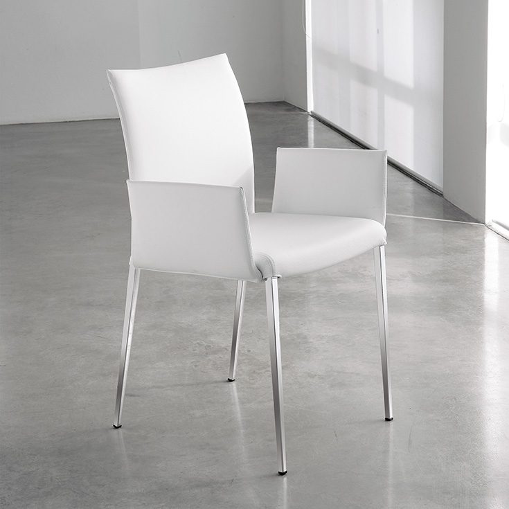 The Anna family of seats includes several variants of this minimal modern chair. Comfort is at the heart of the Anna collection of design chairs and design stools, whose seats and backrests are fully padded with variable density to facilitate ergonomics. Available in the high backrest version to further support the posture, this modern dining chair is also available in the version with armrests, which represents a true piece of contemporary design. The wide range of coverings allows to easily customize these seats by matching the soft leather and fabric shades with the finishes of the legs and kitchen stools’ footrests.