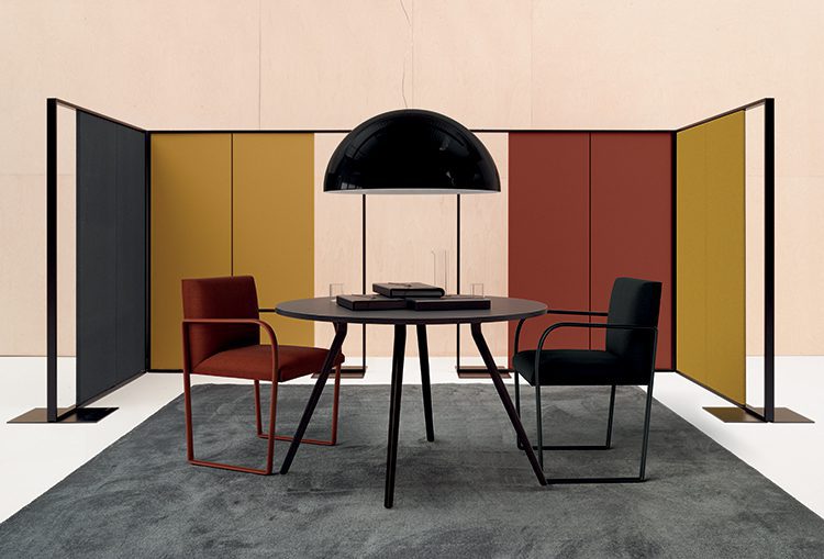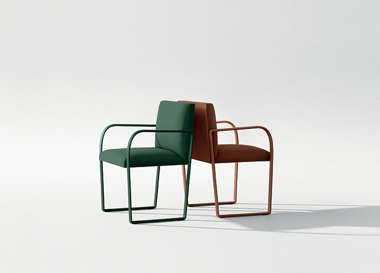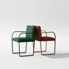 Chair with sled base and integrated armrests made of polished or powder-coated aluminum. Shell in metal and plywood is upholstered in leather, faux leather, fabric, or customer’s material.