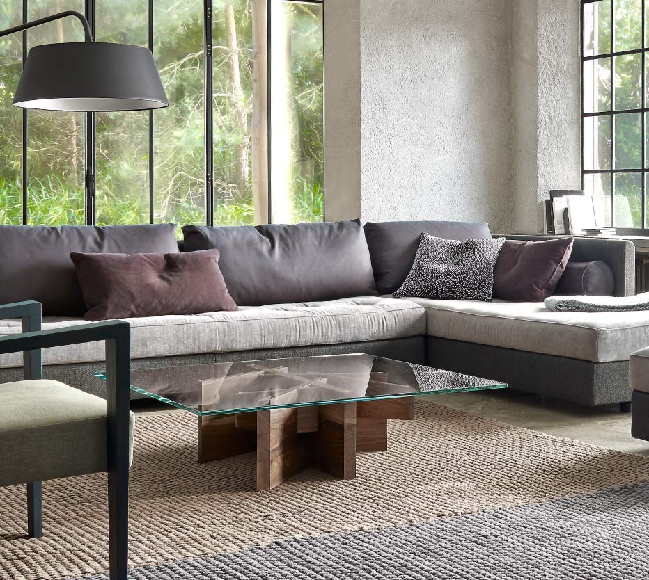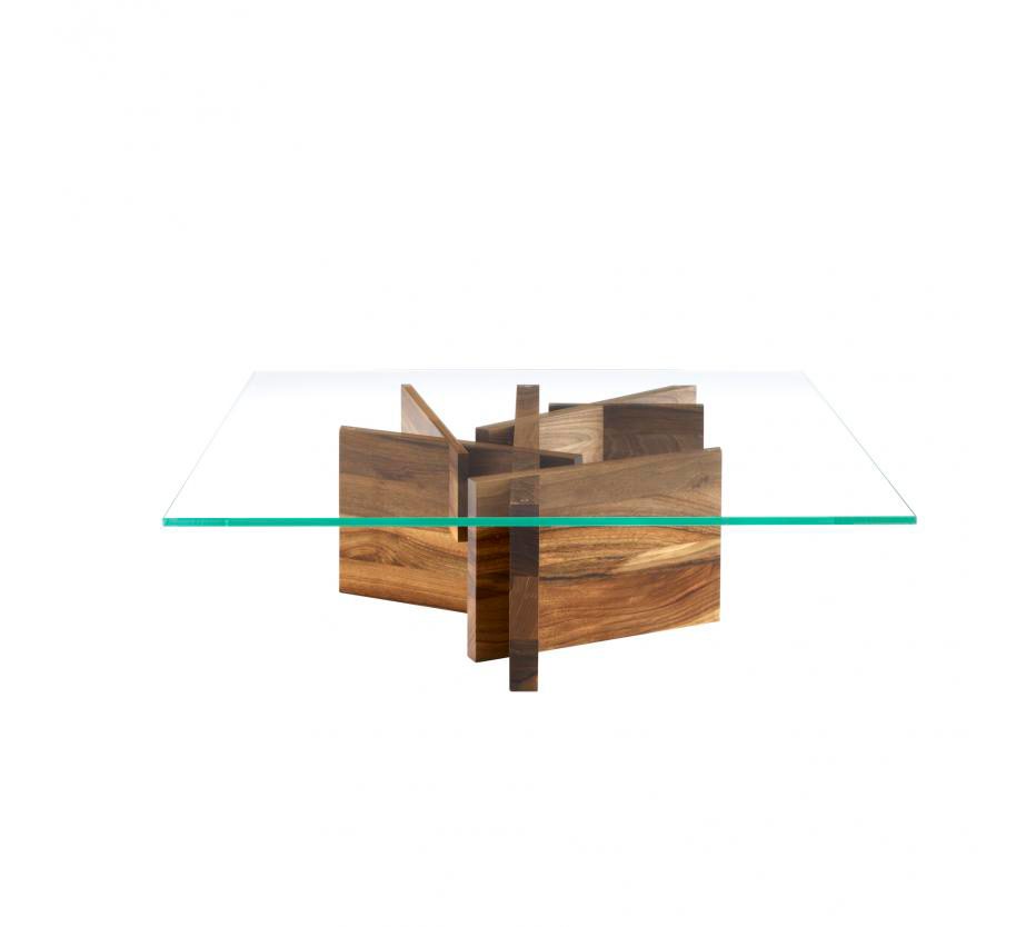 Low table with a simple transparent top in extra clear glass and a base in solid wood. The assembly of solid wood pieces of different thicknesses bring to mind the image of branches of a tree. Available in American walnut, European walnut, cherry and natural oak.