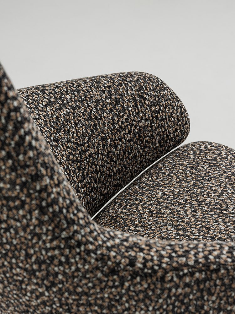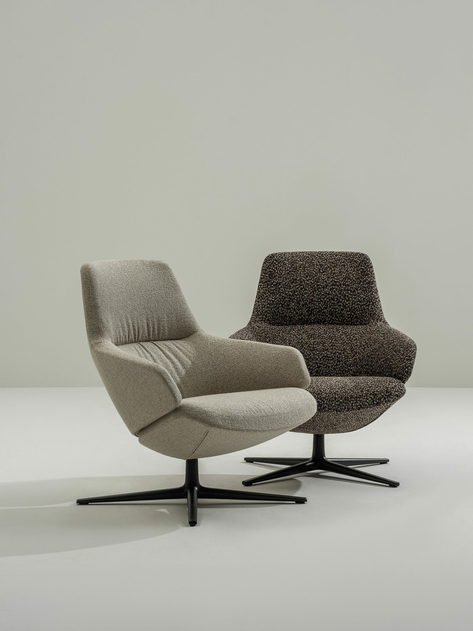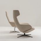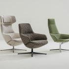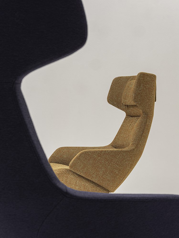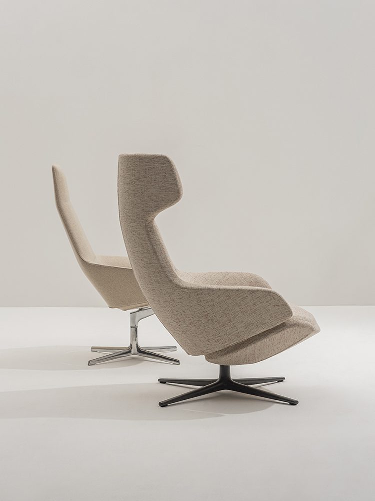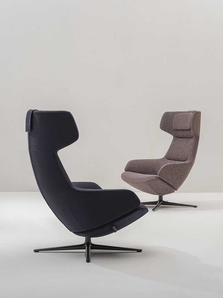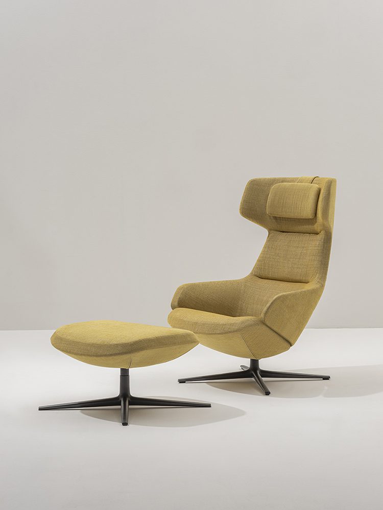 Ergonomic comfort and sustainability are the heart of the Aston Club project. The internal components of this product line, made of post-industrial recycled plastic, can be fully disassembled for reuse or recycling of all of its materials. Aston Club’s welcoming structure is an invitation to relax and makes it suitable for use in offices, hotels, or residential environments. The collection includes a lounge chair, available in two different backrest heights, which can be combined with the matching footrest. Aston Club is available fully upholstered in fabric, coated fabric, or leather. In order to emphasize its extraordinary elegance, four additional models have been added to the wide range of Arper upholstery: Ria and Sonar 3 (Kvadrat Raf Simons), Sera (Rohi), and Fabthirty (Rubelli) fabrics. Available with a four-spoke aluminum base.”