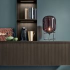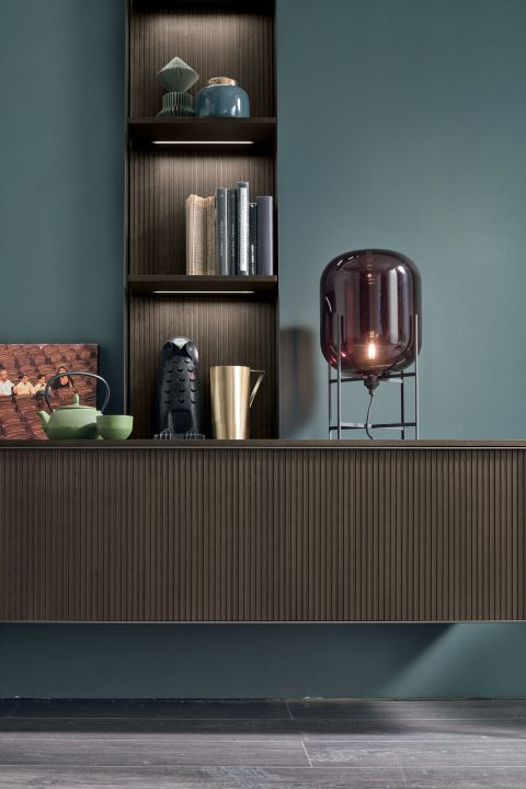 Photo finishes / Reeded mocha oak wood, textured mocha oak, metallic bronze 090 and metallic anthracite 160 lacquer.