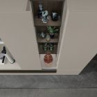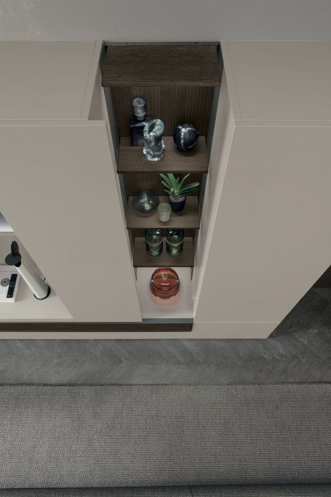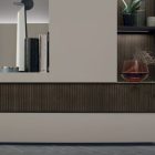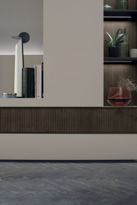 Photo finishes / Reeded mocha oak wood, textured matt arena and anthracite 160 metal.