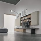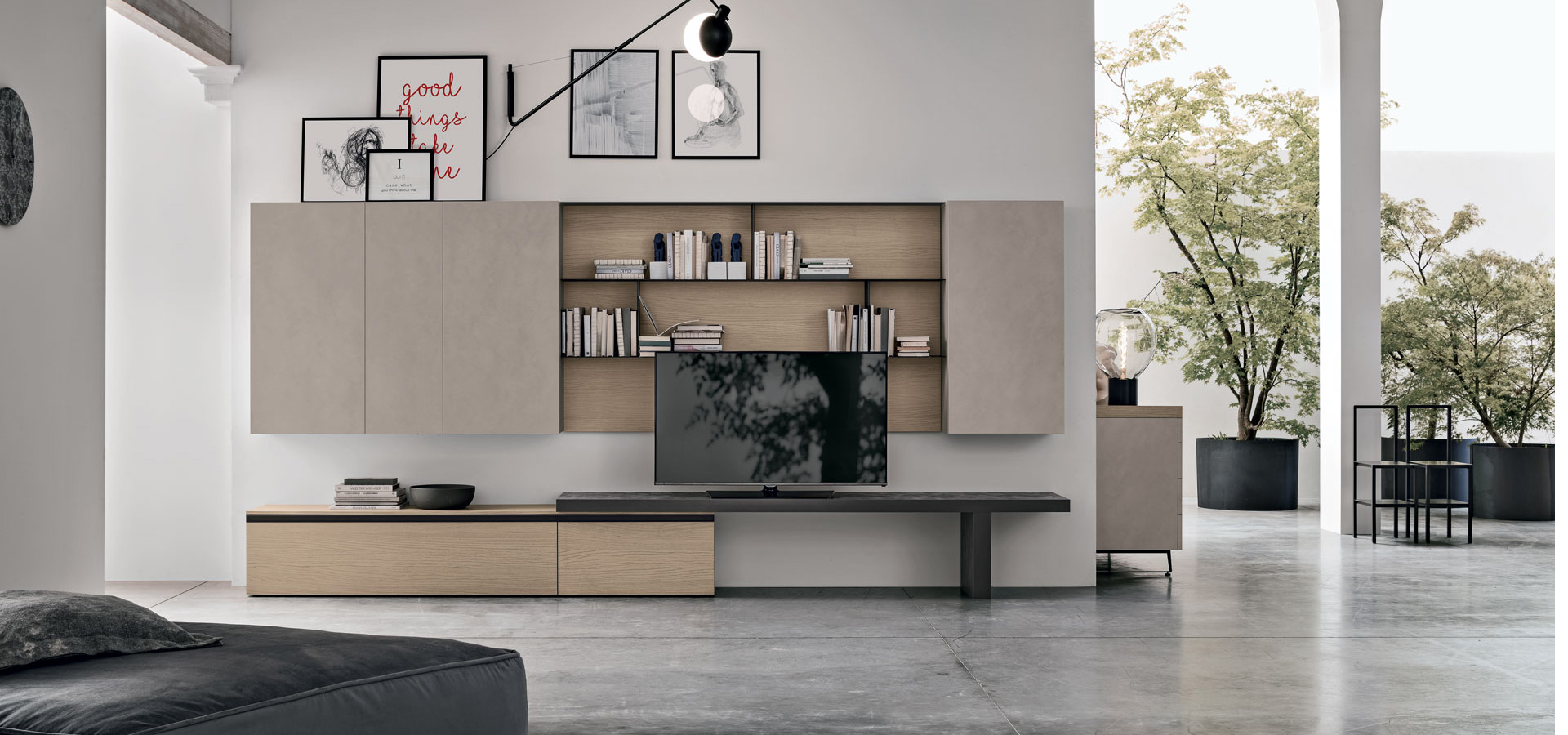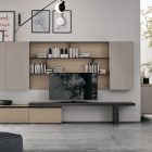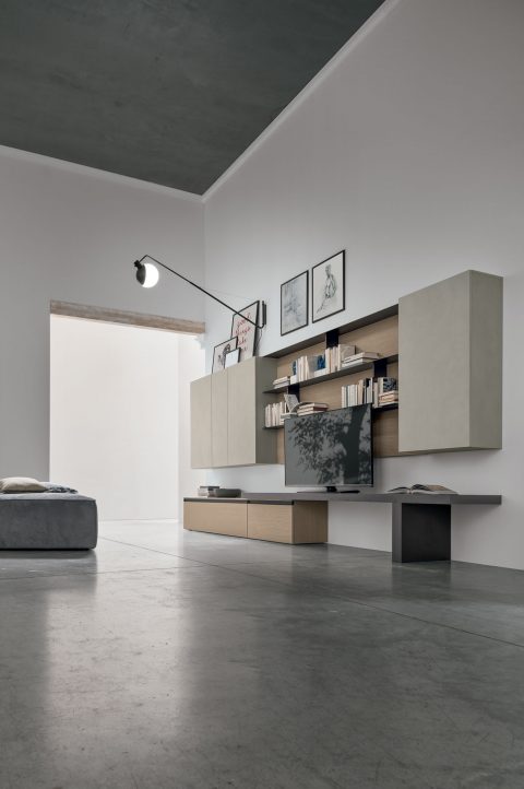 Base and wall units serve for storage, the Panka element accommodates the TV and the Krea wall paneling is fitted out as a bookcase: for a multifunctional living room that has everything you need on just one wall. The different finishes distinguish each piece of furniture but still work together to form a harmonious and well-balanced end result.