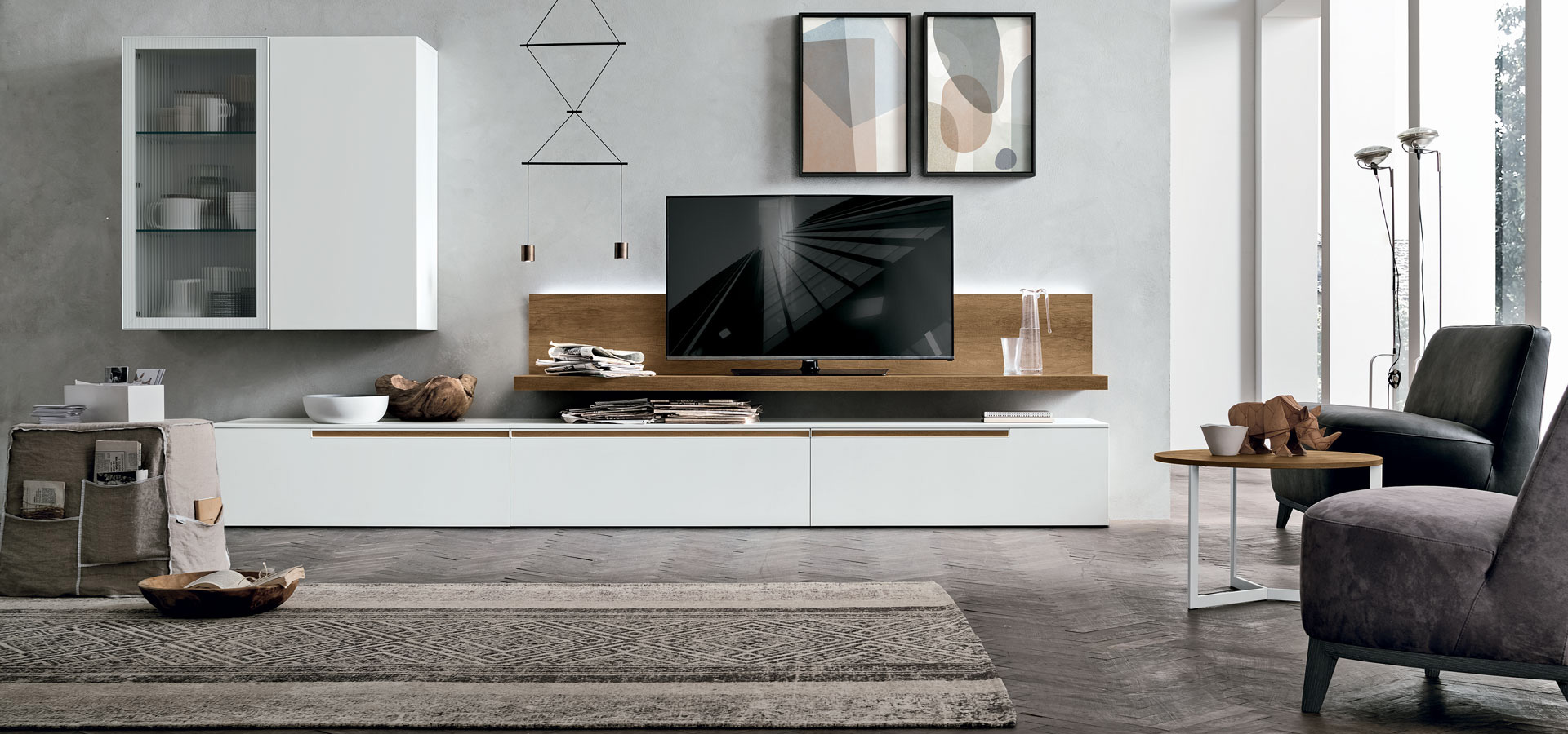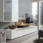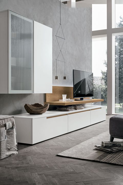 Photo finishes / Textured matt chalk white and light knotted textured finish, chalk white 121 metal and reeded glass.