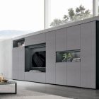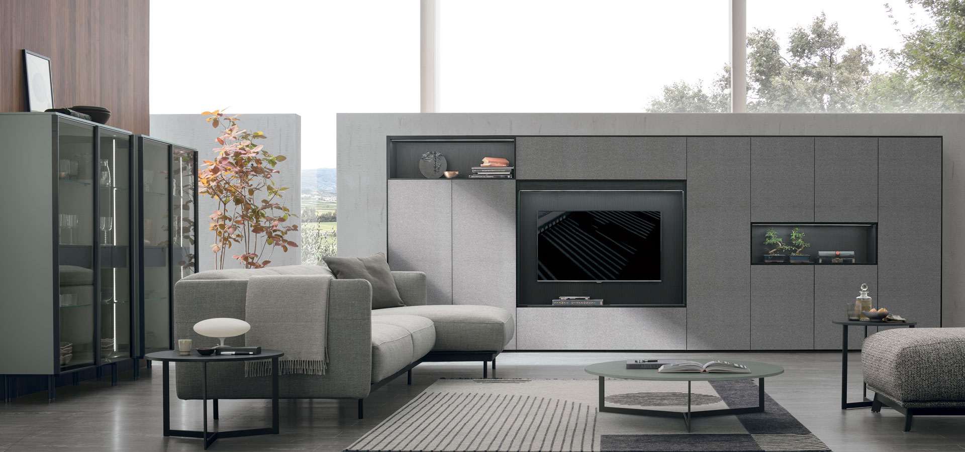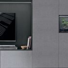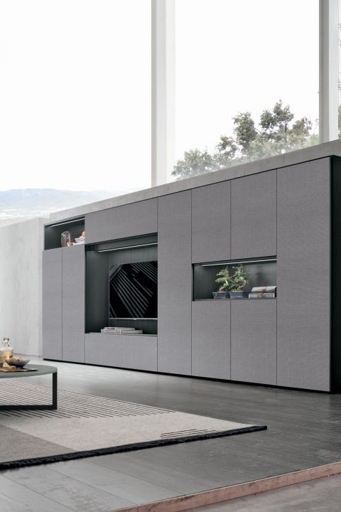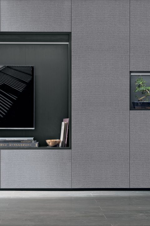 The recess is embellished by a back panel in reeded coal oak wood and is lit from the top by a led light. The doors in textured grey straw further enhance the textural effect of the wall arrangement, turning it into of furniture that is both beautiful to look at and to touch.