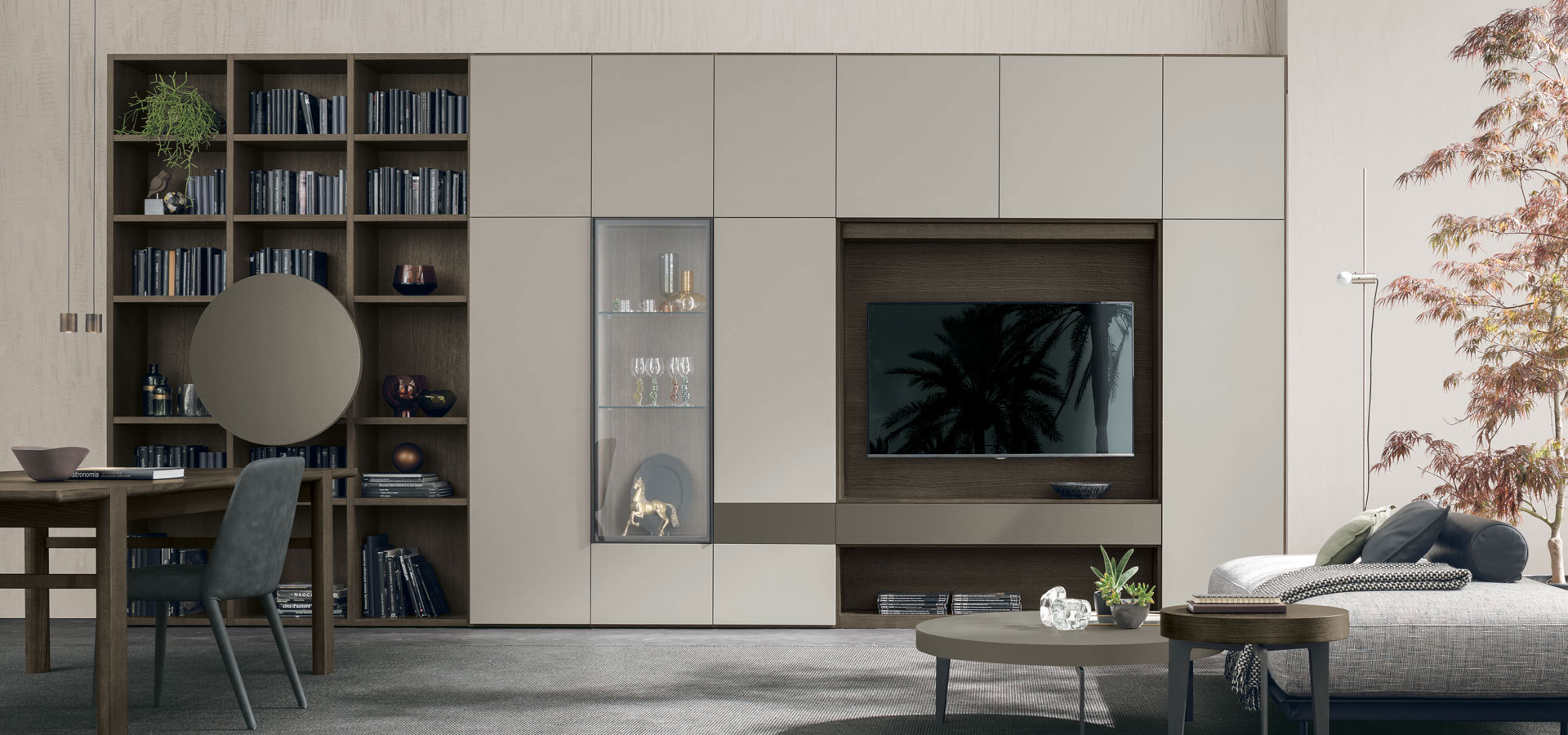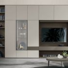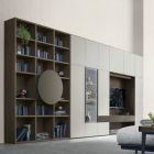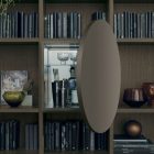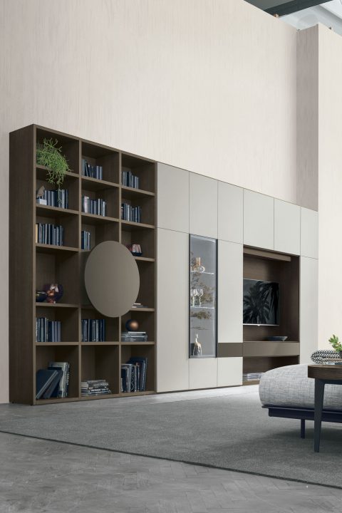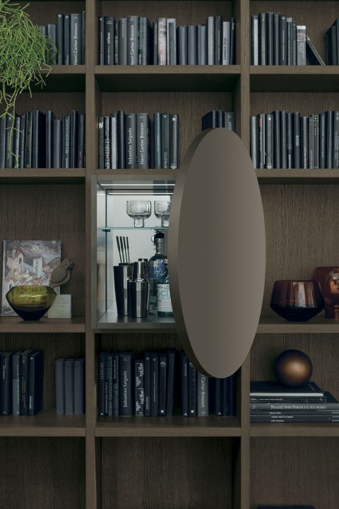 The round door features a new finish in metallic bronze lacquer matching the wall-hung TV cabinet – that creates interesting color variations on the surface. The bar compartment is concealed behind the door, ready to reveal all its style and practicality when the need arises.