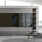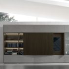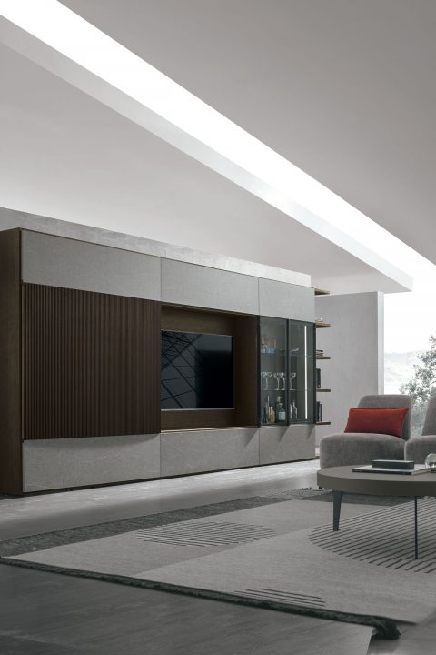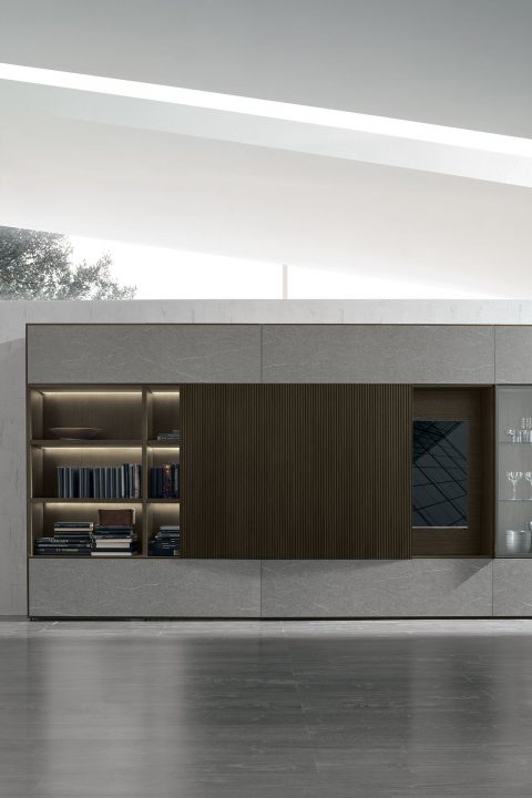 Photo finishes / Textured mocha oak, reeded mocha oak wood and textured dark piasentina.