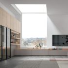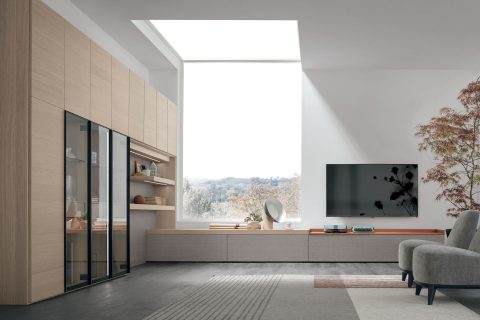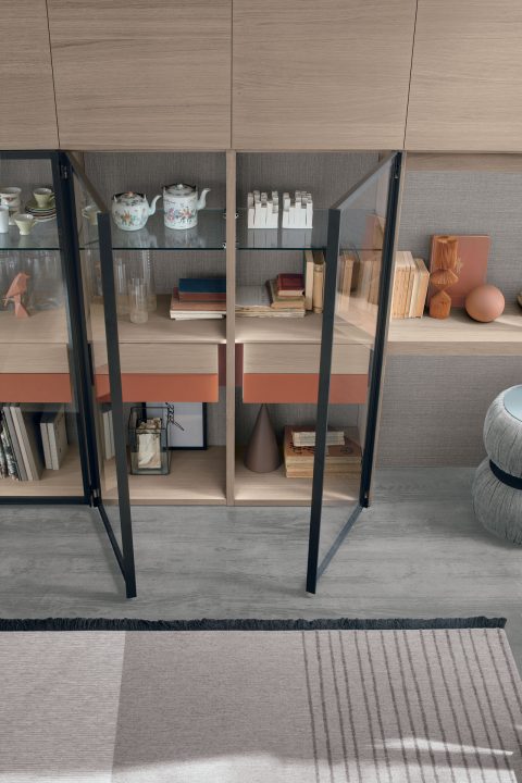 The Metropolis doors in glass make the large volumes of this arrangement look lighter. Transparency, paired with interior lighting, sets off the contents as well as some original details such as the hung drawers in two different finishes.