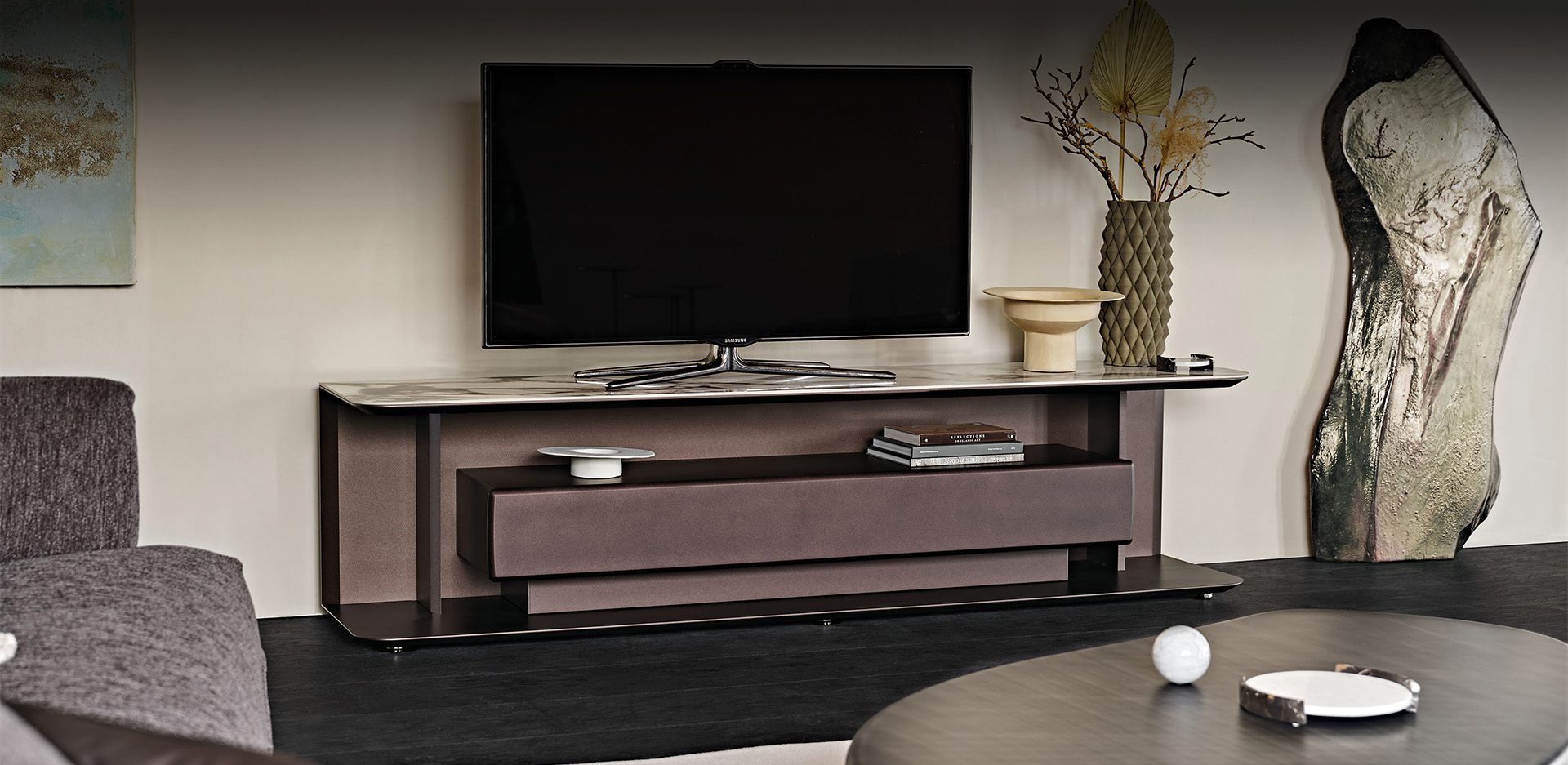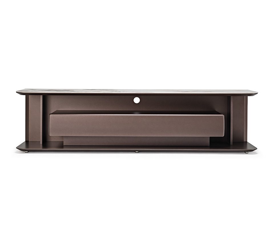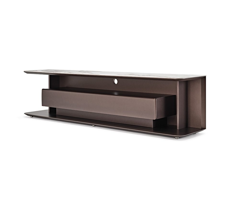 The Award cabinet is a design TV stand notable for the absence of closed doors, with the exception of the large central sliding drawer. Paolo Cattelan’s design thus includes numerous open compartments, just waiting to be enhanced by objects. The appearance is that of a modern TV stand but with a strong decorative component. What most distinguishes Award is the fine Marmi ceramic top, which can be customised by choosing from numerous attractive shades. Aesthetics and function are united in this design TV cabinet, as demonstrated by the open compartment between the drawer and the top, complete with a practical cable guide and suitable for positioning electronic devices. This elegant piece is completed by refined details such as the curved front edges, the sloping profile, the narrow side panels and the slight suspension from the floor. It’s impossible not to be enchanted.