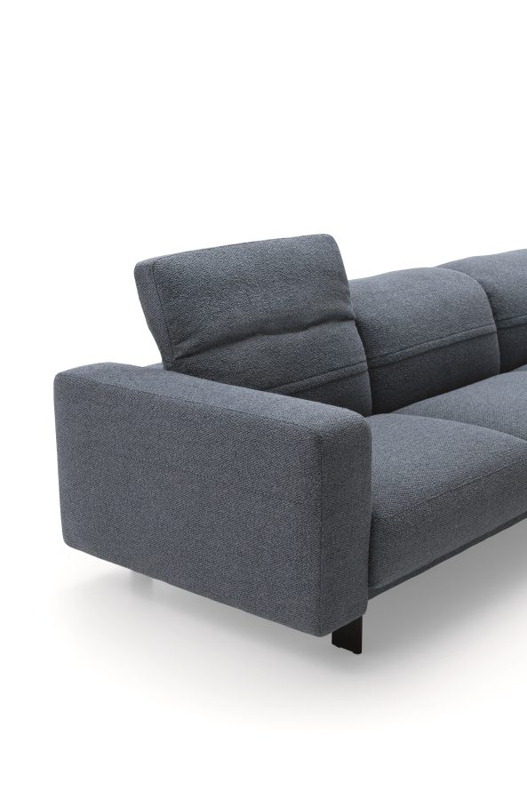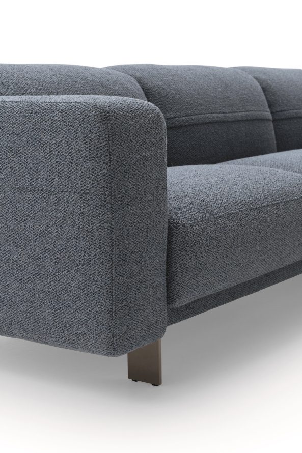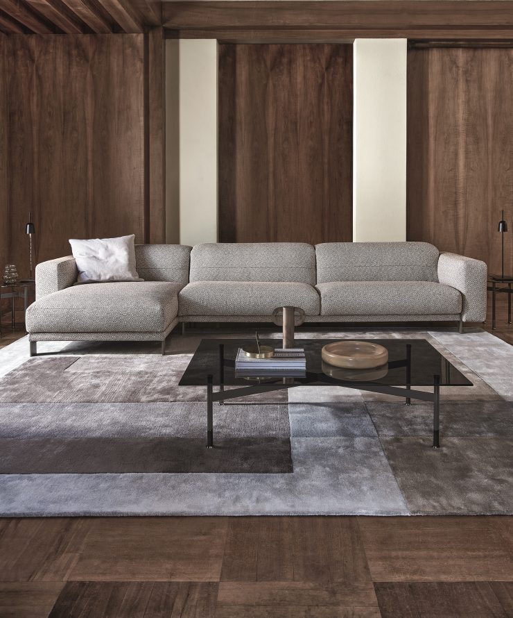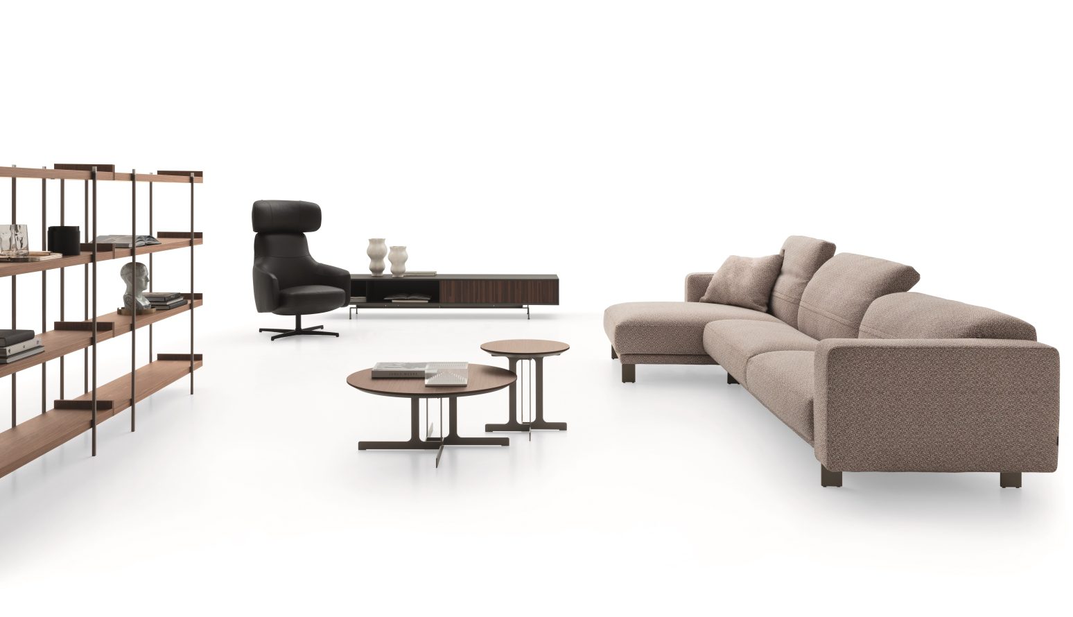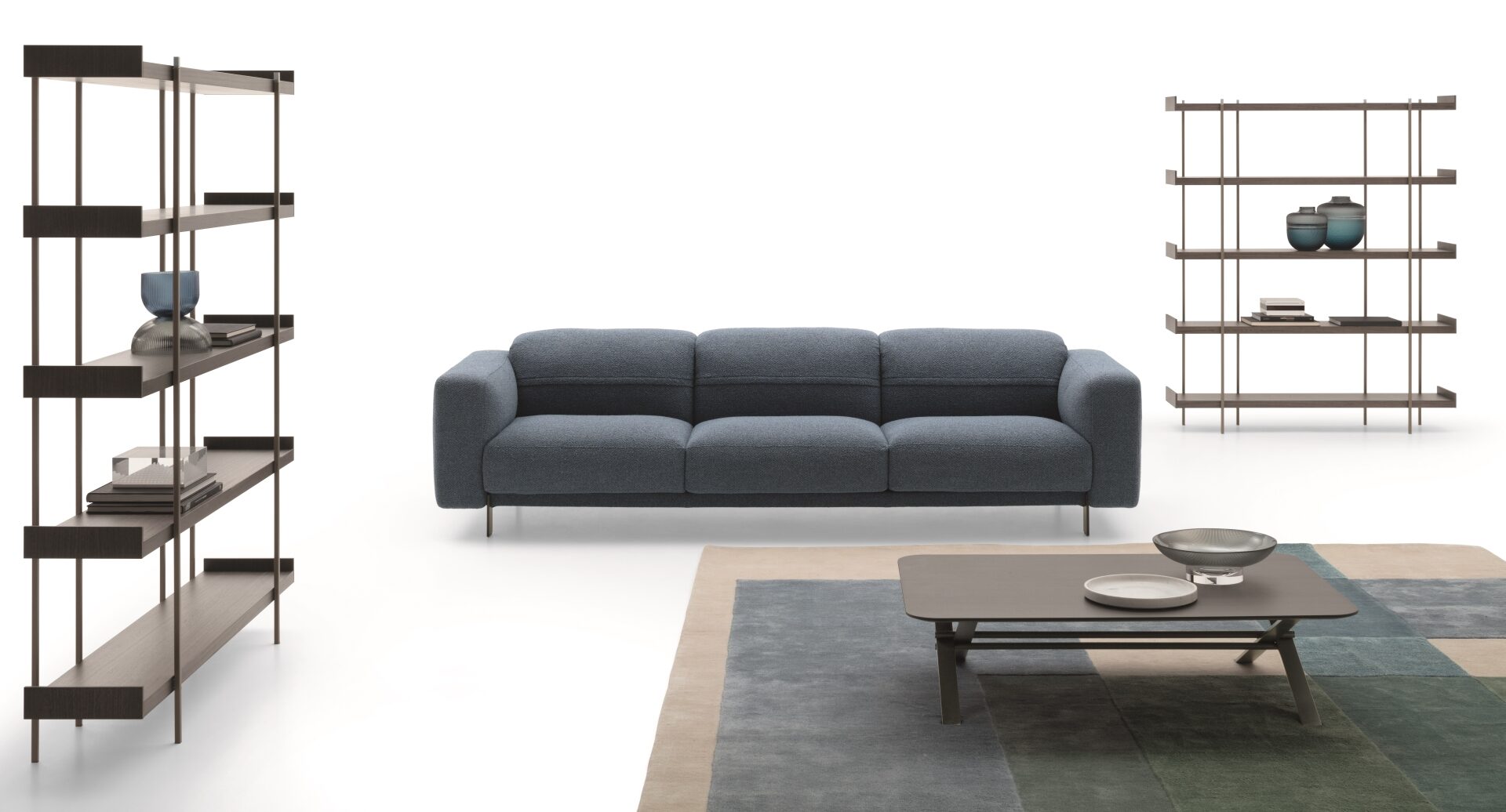 A system of sofas with a particular horizontal development and a dual soul: architectural and formal when closed, welcoming and domestic when open.