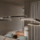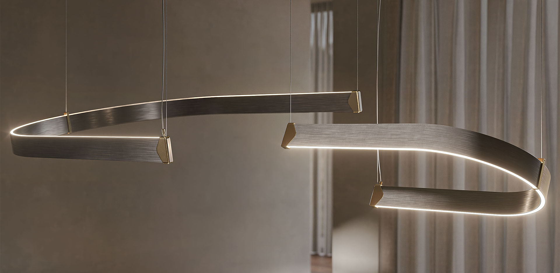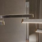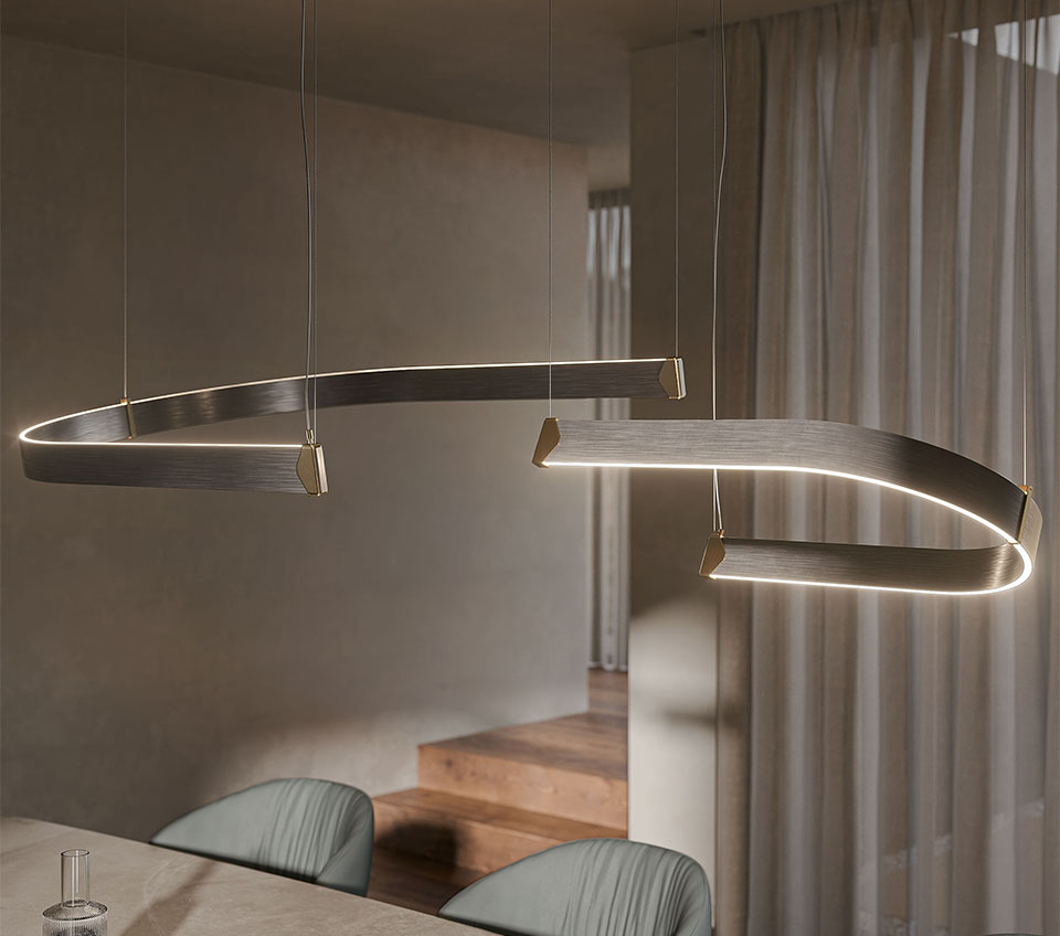 The arcs that intersect in mid-air create geometric sections that are reassuring in their mathematical precision. This layering effect is achieved by placing lights with different sizes, heights and angles side by side, although the Bluebell chandelier is perfectly at home on its own, further enhancing the contrasts between the horizontal tops of tables, coffee tables and sideboards, and the curved lines of this modern light fitting.