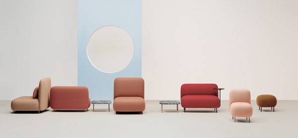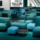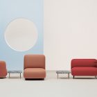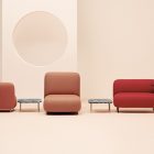 Buddy collection has been enriched with new elements that enhance its versatile, functional nature. The generous backrests, combined with softly upholstered poufs, create a family of soft modular seating, that reflects the friendly spirit of the collection. Steel frame and tubular steel leg Ø20mm. Height 400 mm. A turning tablet can also be added to the configuration.