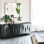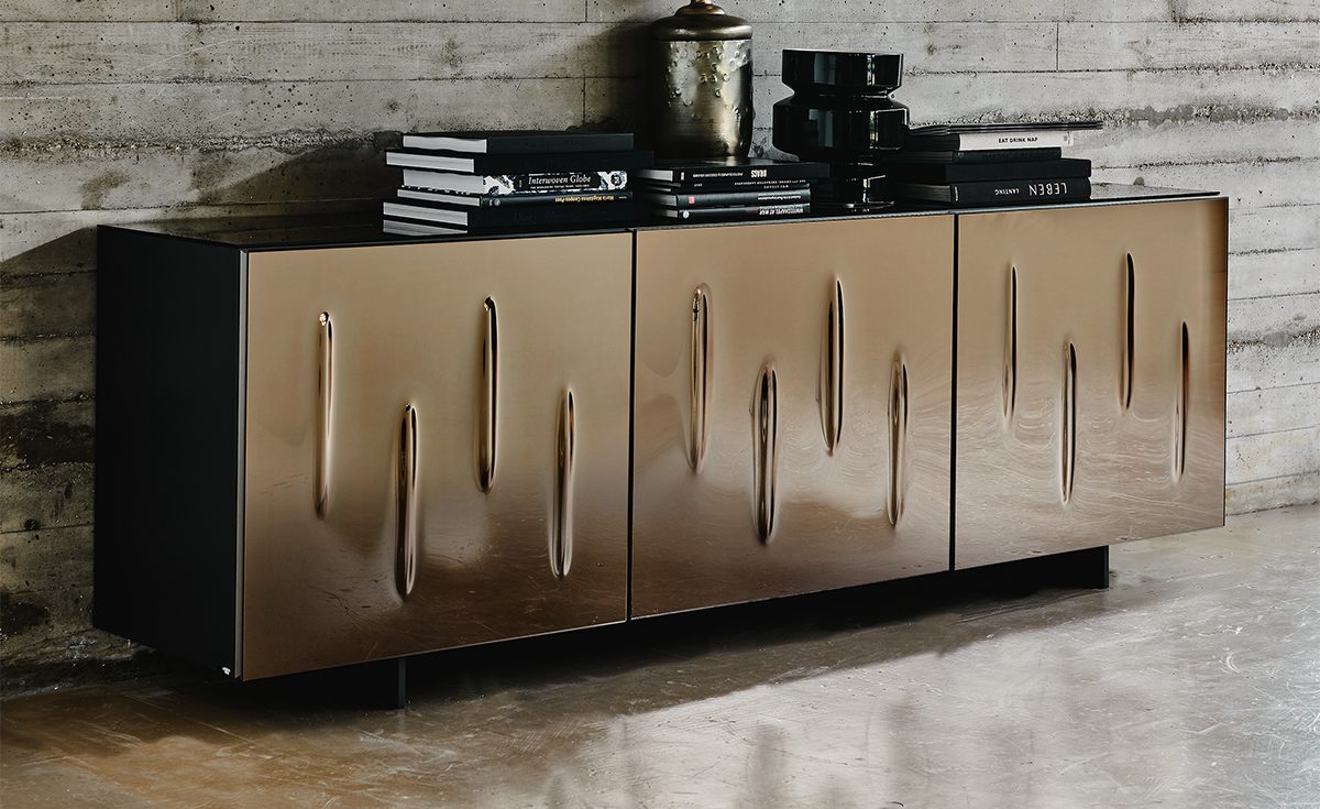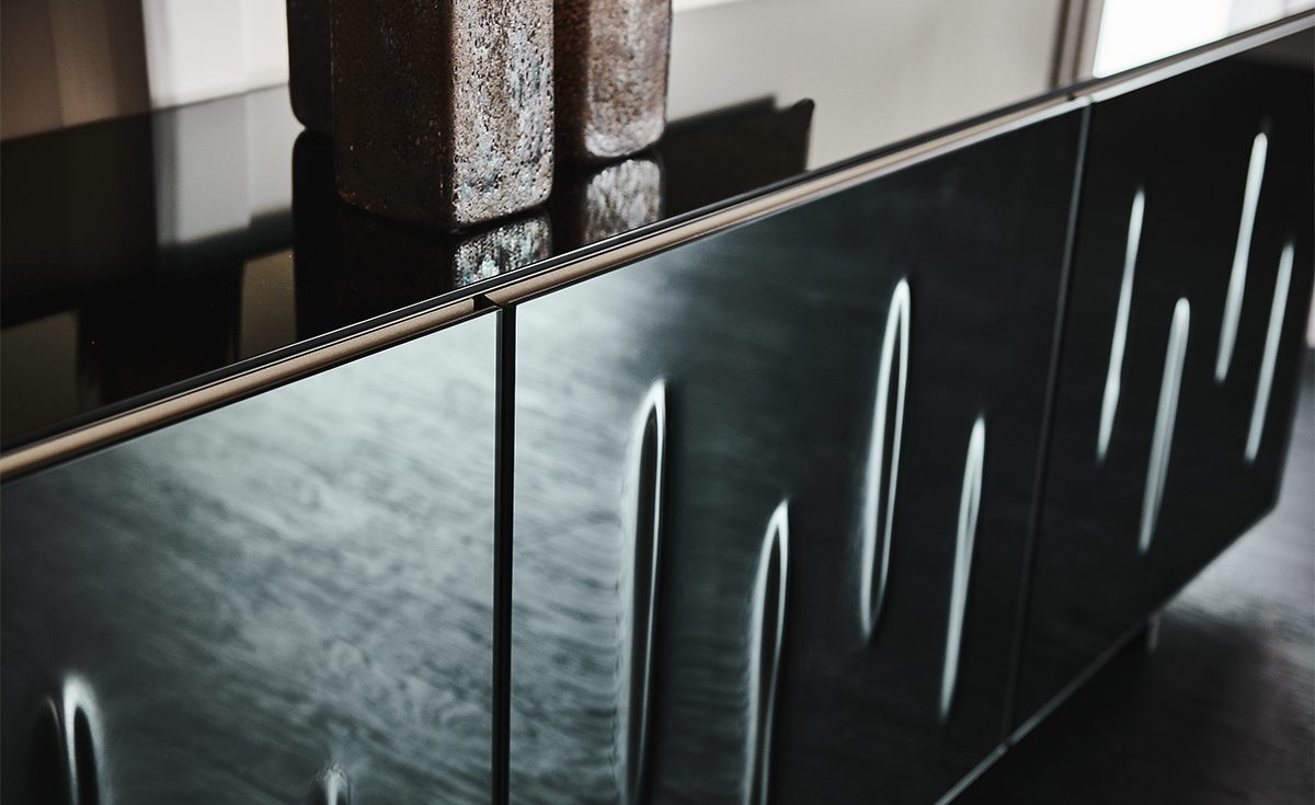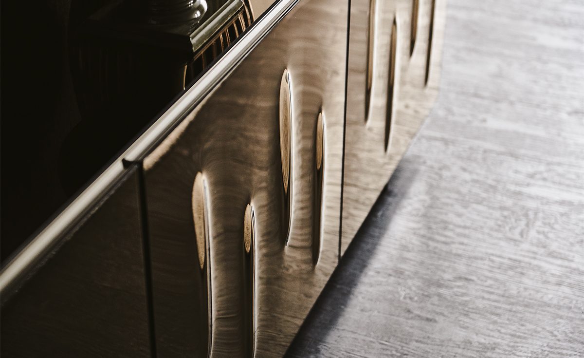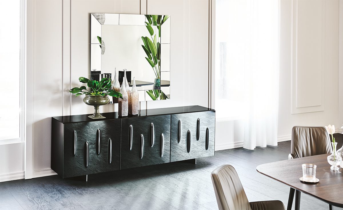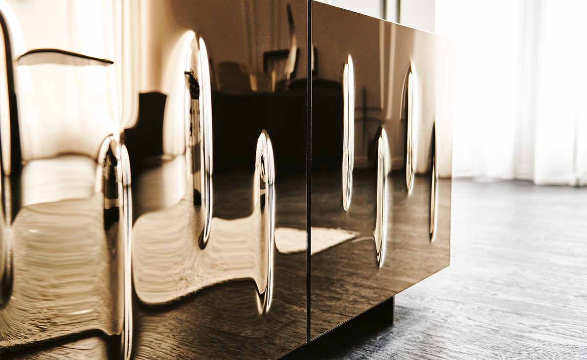 The designer sideboard Carnaby is the expression of an irreverent but refined design. The doors, which give character and rhythm to the structure, are made of convex glass, resulting from skilful manufacturing techniques. Carnaby is a modern sideboard that can be coated in a number of matt or glossy finishes. The latter reflect the surrounding environment with suggestive interruptions caused by the vertical curvatures. The fine materials, which make up the internal and external shelves and the base, reveal how this contemporary glass sideboard is the result of the high quality of Italian manufacturing.