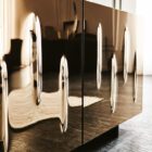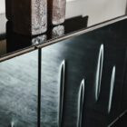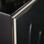 Sideboard 2 or 3 doors lacquered glossy moka (L4), matt graphite (OP69) or titanium (M11). Doors in smoked grey or bronze convex mirrored glass with embossed titanium (GFM11) aluminum profiles. Polished stainless steel feet or matt graphite (OP69) varnished. Internal clear glass shelves. Optional: internal drawer in each door. Optional: mirrored glass top matching the doors colour.