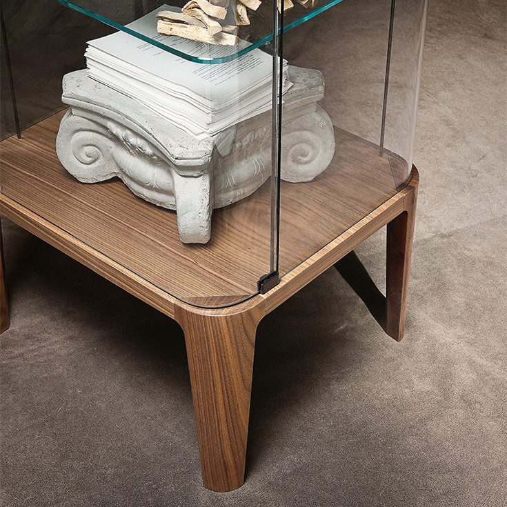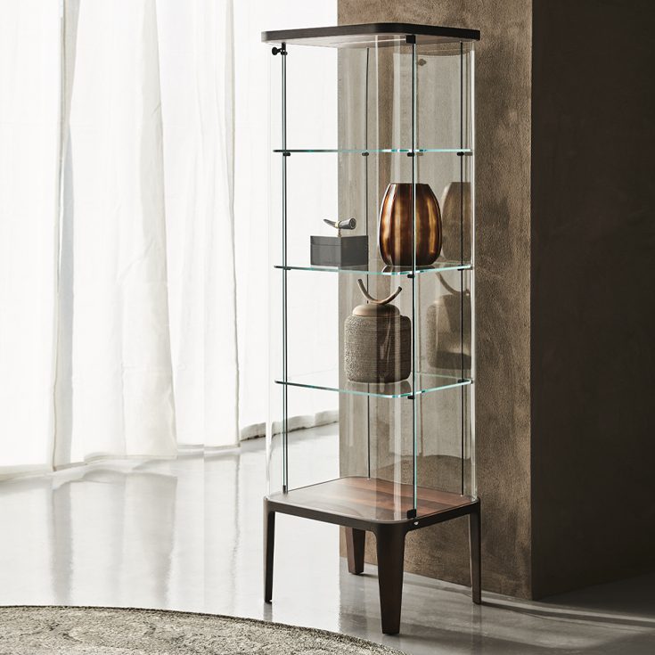 The Chantal modern living room showcase is a precious and elegant furnishing complement, created mainly using transparent extra-clear glass. The delicate see-through doors, sides and shelves of the glass showcase create a pleasant contrast with the voluminous top and bottom, both made of exquisite wood. There are two versions of this modern living room cabinet with one or two glass doors. Both are embellished with an internal LED light to highlight the objects stored inside this elegant contemporary showcase.