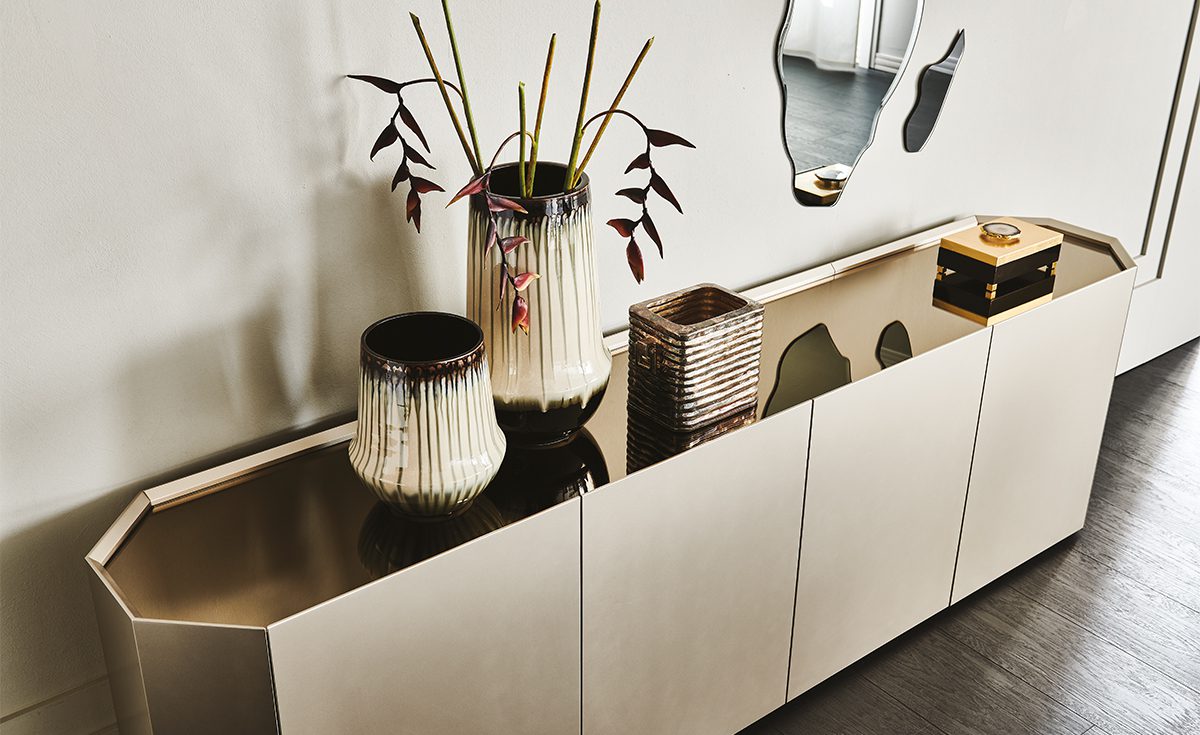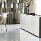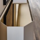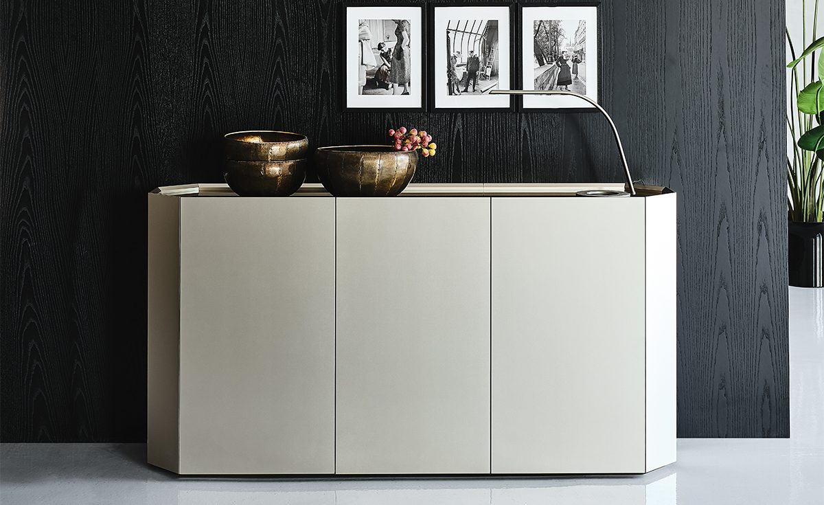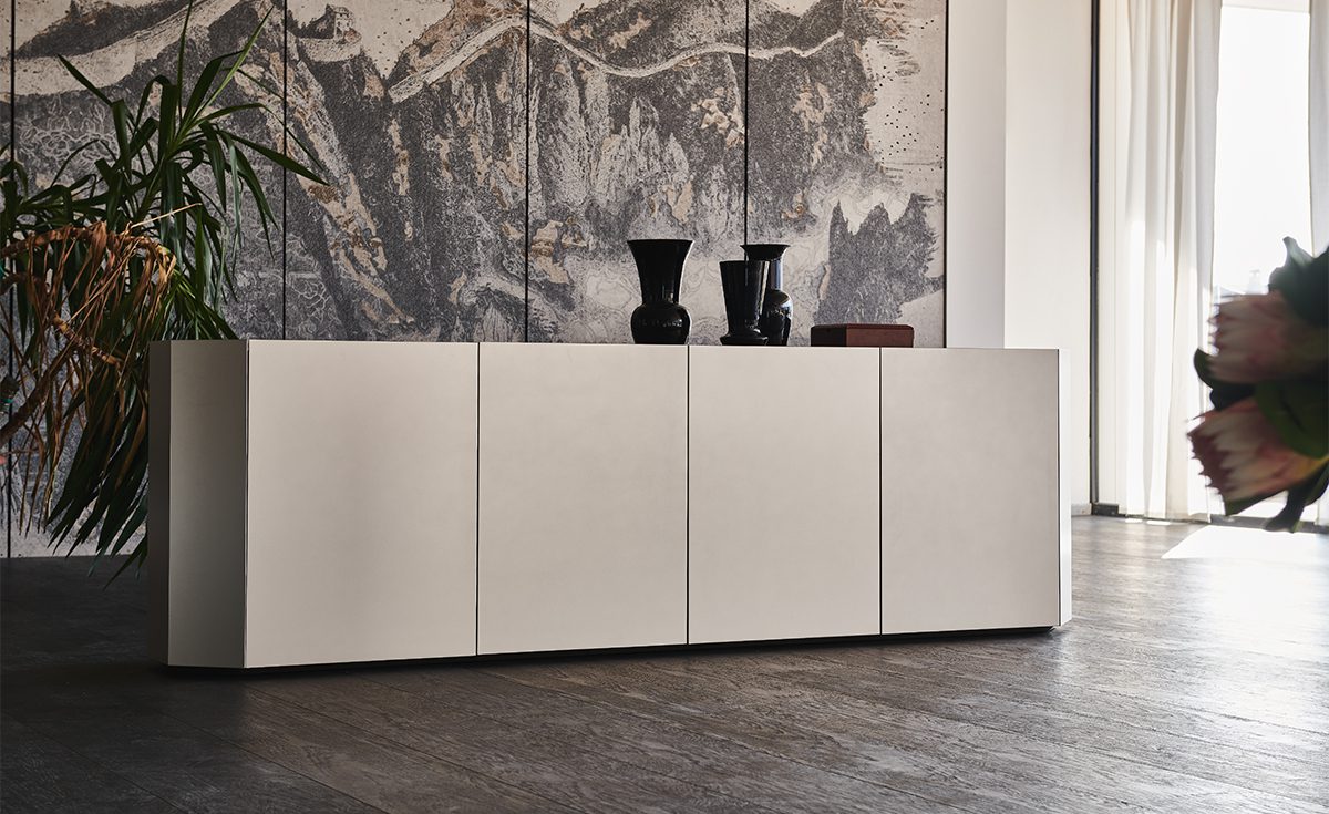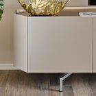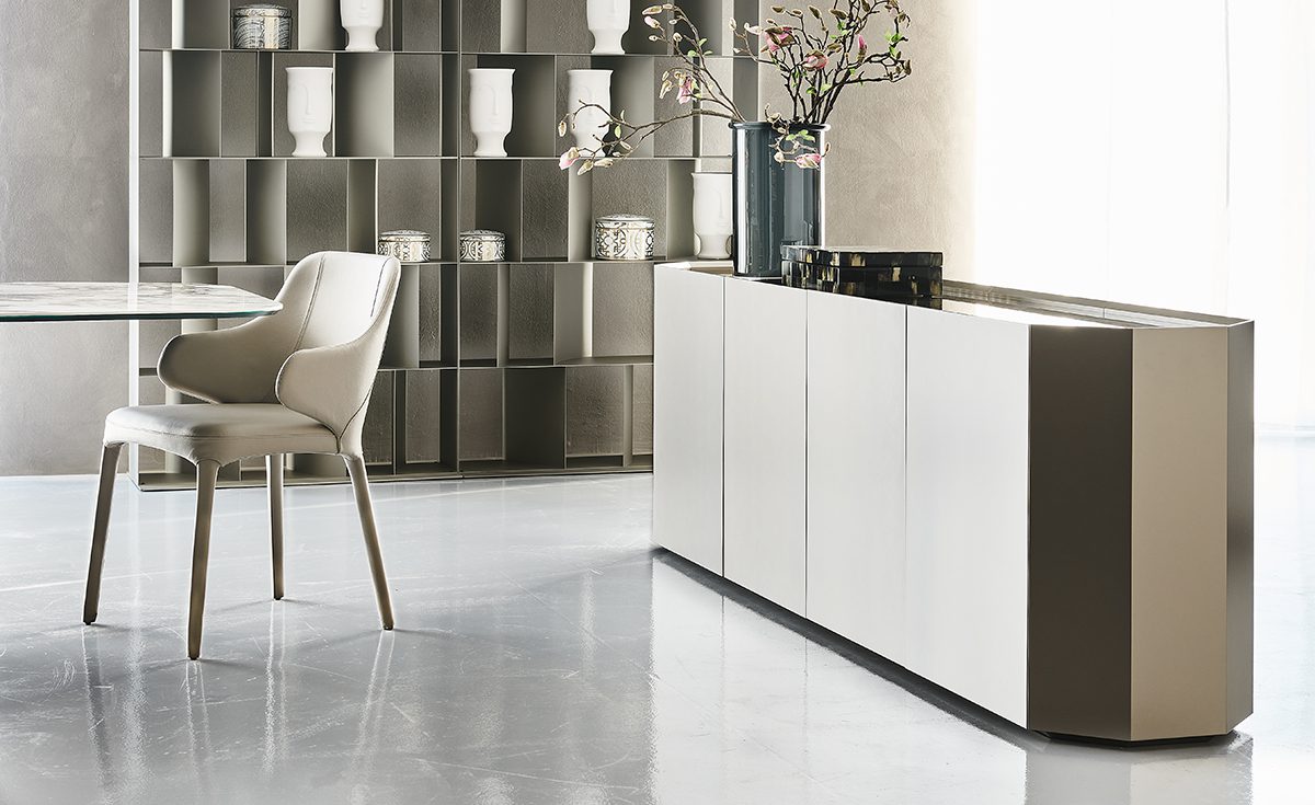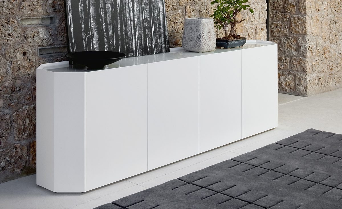 The sculptural and geometrical Chelsea modern sideboard, designed by Alessio Bassan, integrates harmoniously into the living room style, both in residential and contract interior design projects. This minimalistic cabinet with an eclectic taste is enriched by fine details and exclusive finishes, such as the transparent glass top. Chelsea is equipped with fine shelves in transparent glass with the purpose of storing the most valuable and exquistite objects.
