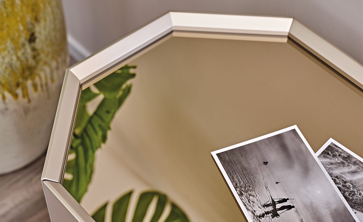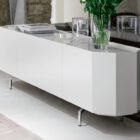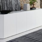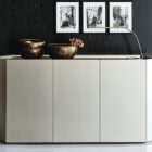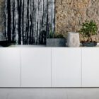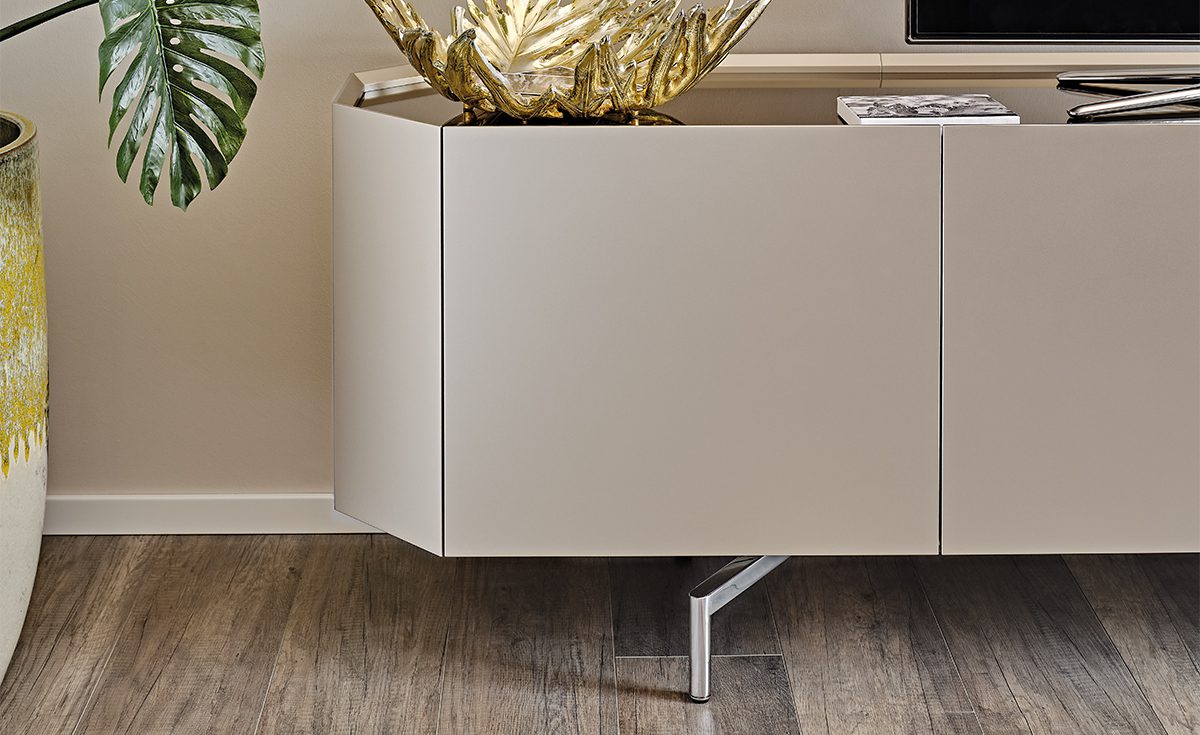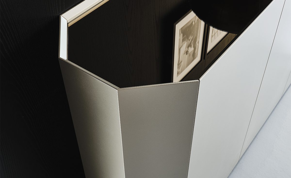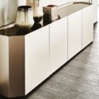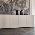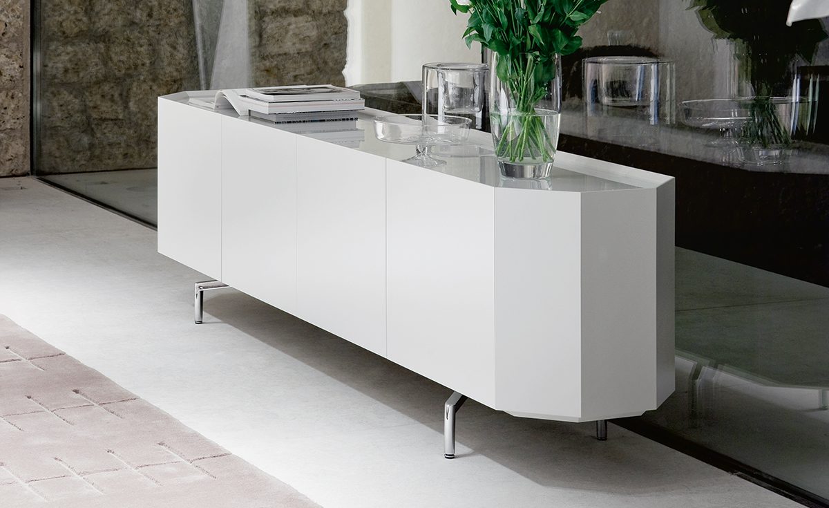 Sideboard in matt white lacquered (OP7) or titanium (M11) wood. Top in extra clear white or bronze mirrored glass. Internal clear glass shelves. B version with chrome (08) steel base or matt graphite (OP69) or white (OP71) varnished.