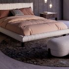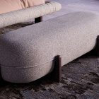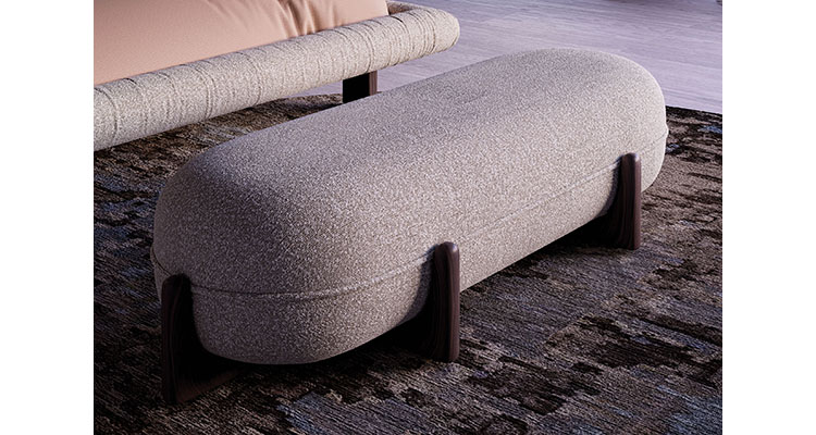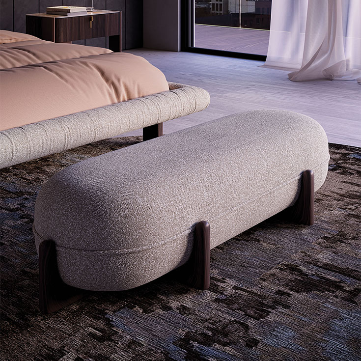 Bench with base in Canaletto walnut stained ashwood (frNC) or burned oak stained ashwood (frRB). Seat upholstered in fabric, micro nubuck or soft leather as per sample card. The cover is not removable.