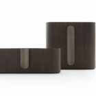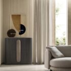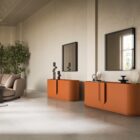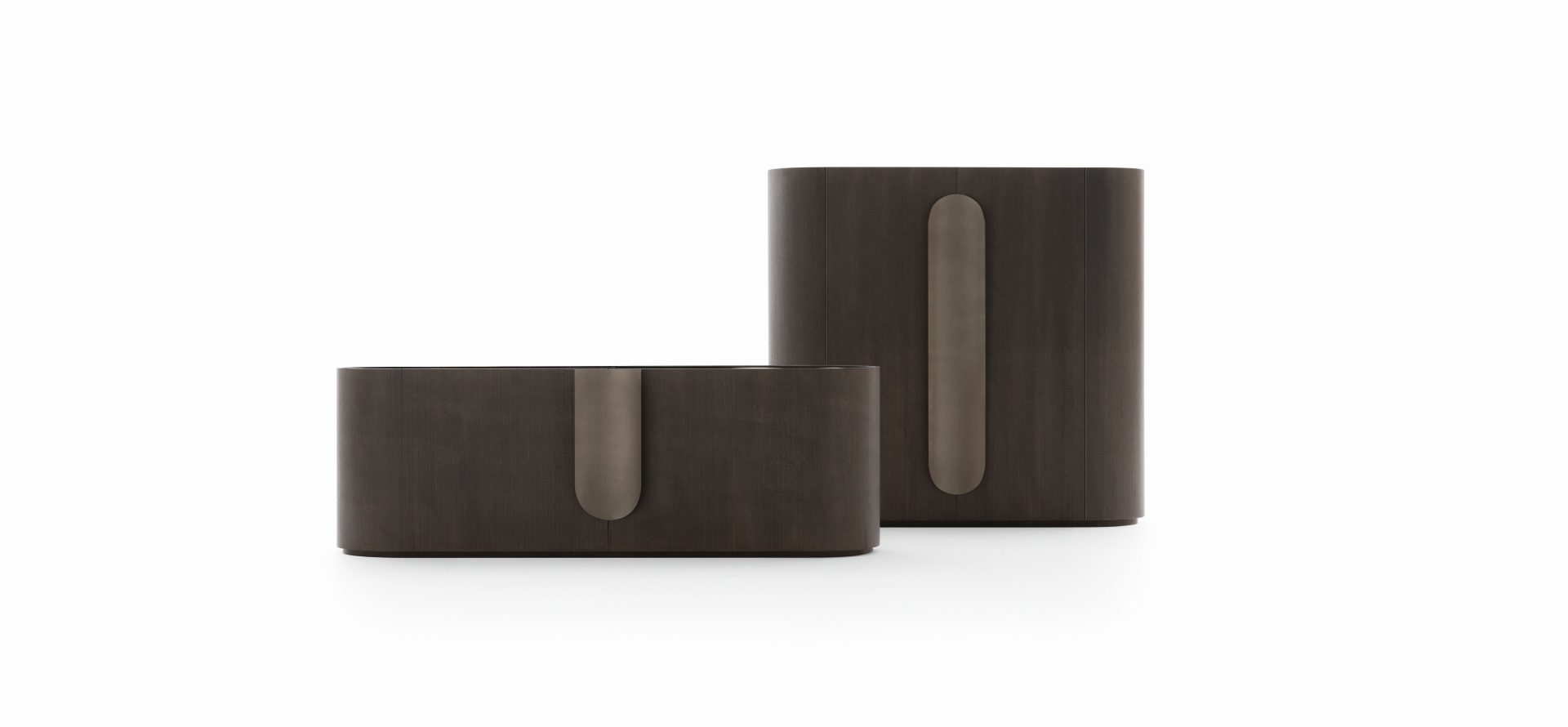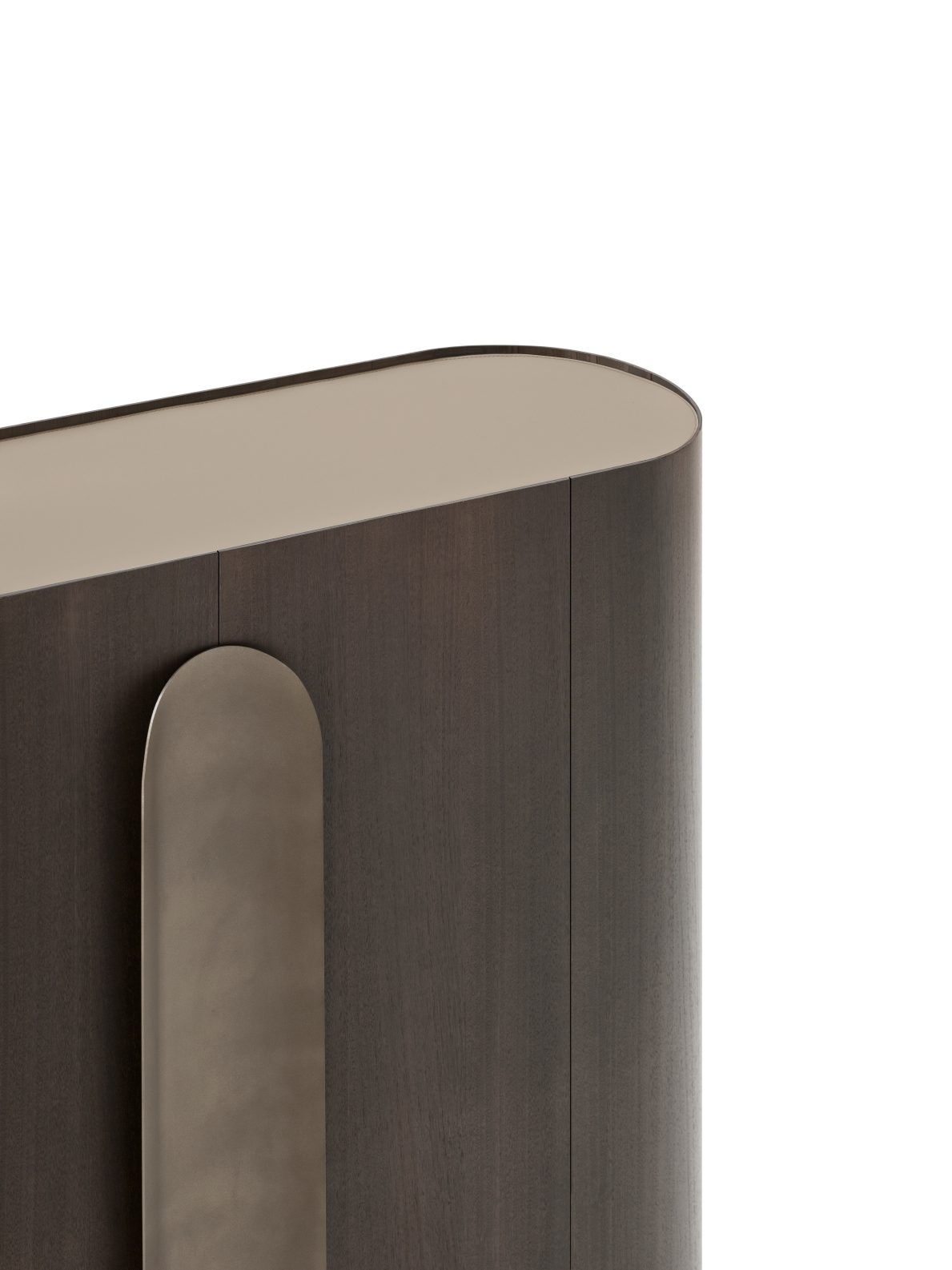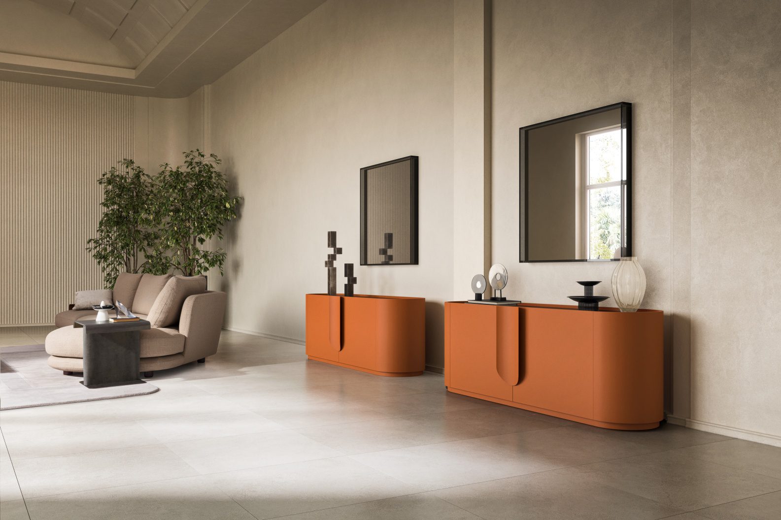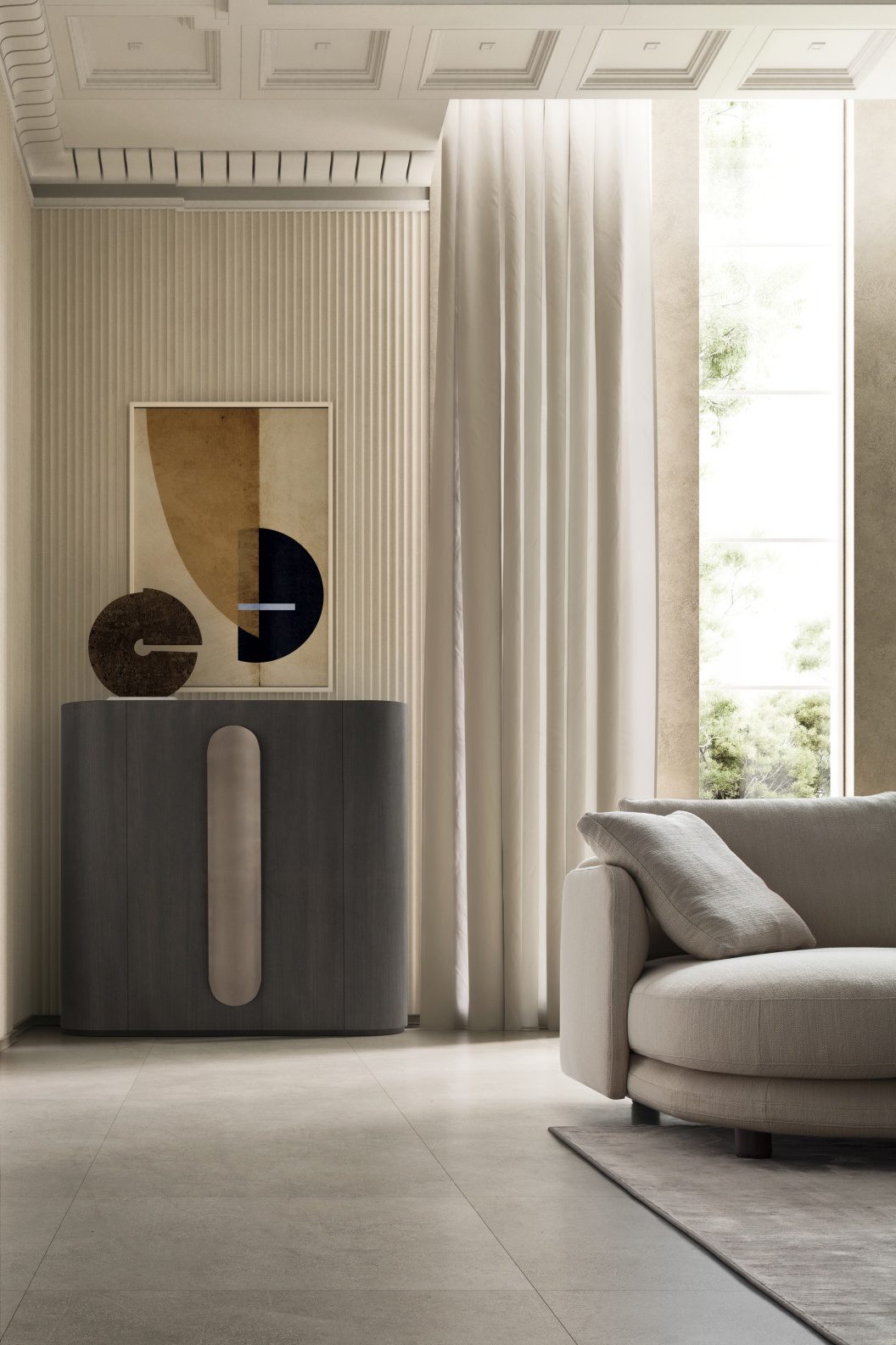 Lines and semicircles are articulated among themselves in a game of shapes and colors embellished by the decorative sign of the lacquered metal handle, which draws inspiration from the purist architecture of the French master Le Corbusier.