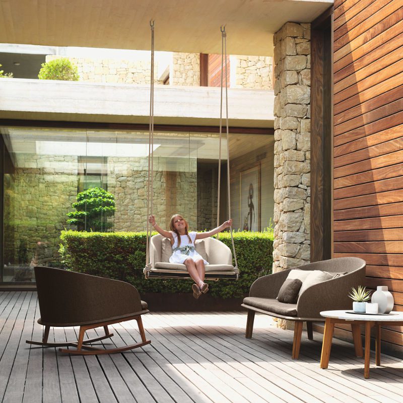 The swing of the CleoTeak collection is part of the accommodating and welcoming design elements that contrast with the larger ones such as the modular sofa or the 3-seater sofa. The seat recalls the shape of the lounge chair creating a continuity of cheerful and playful style. It has a teak structure. Quick dry foam padding.