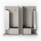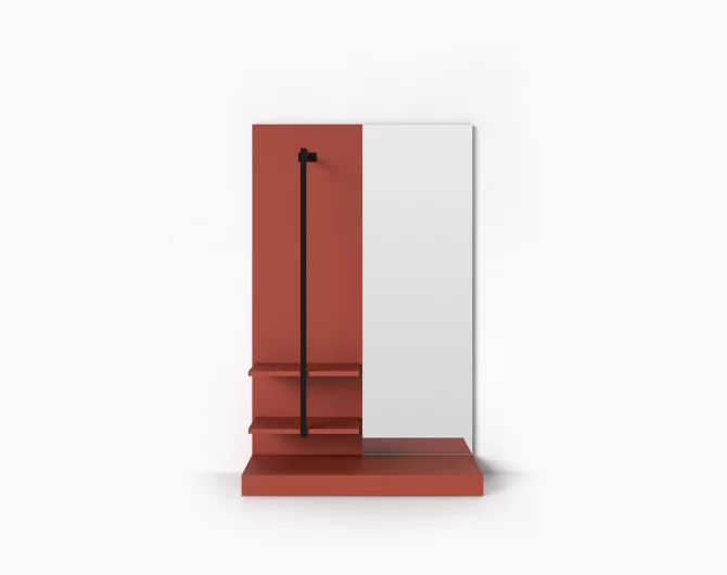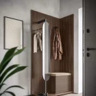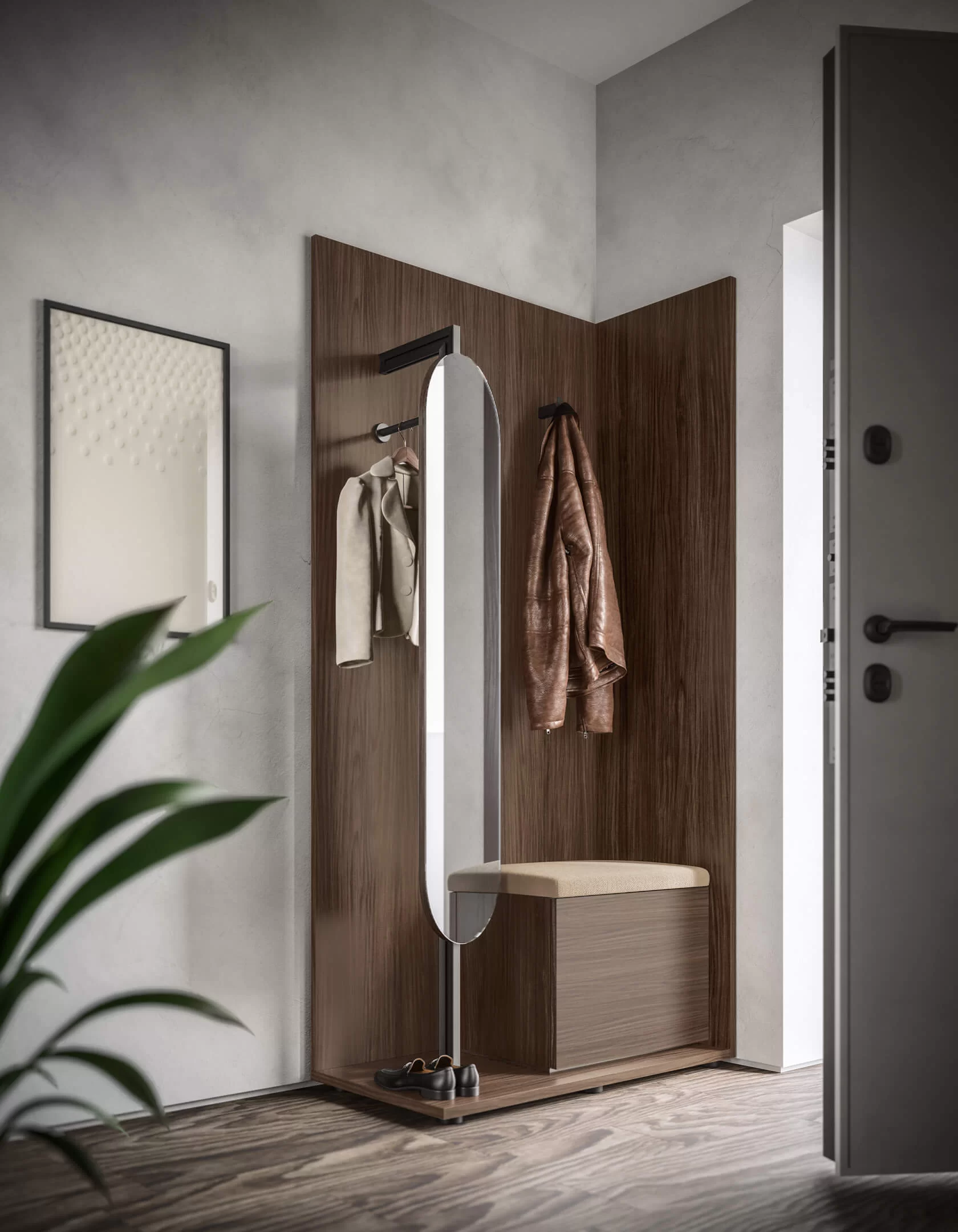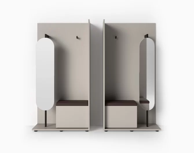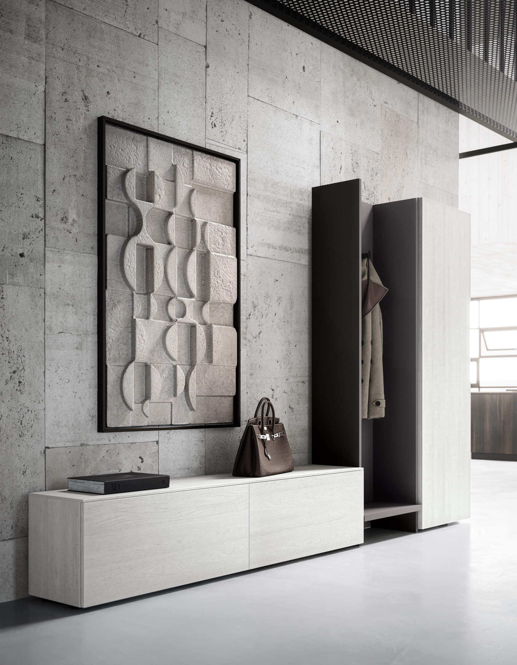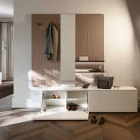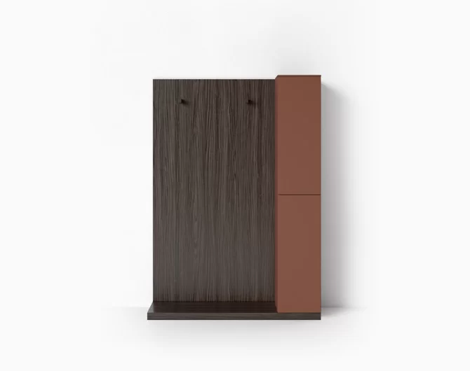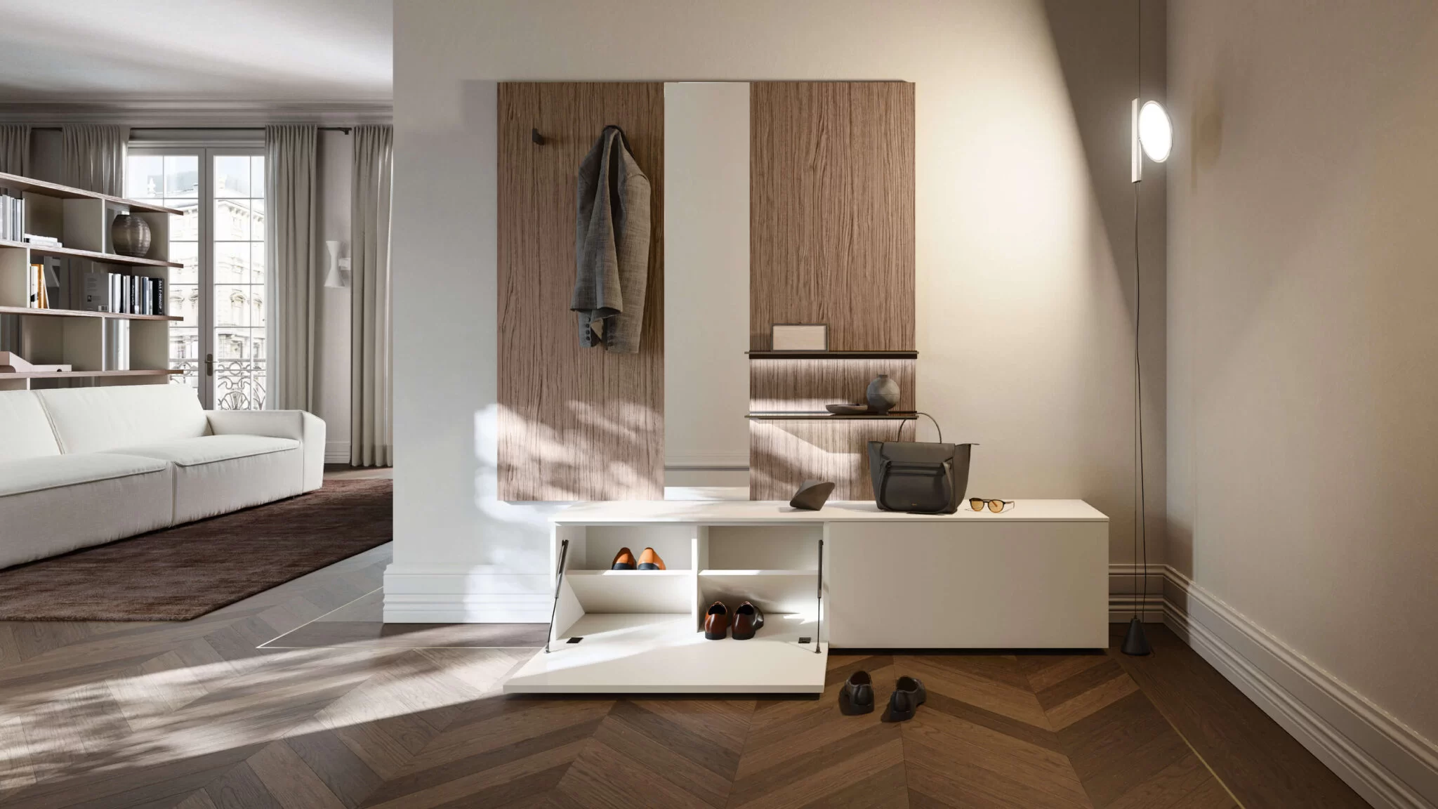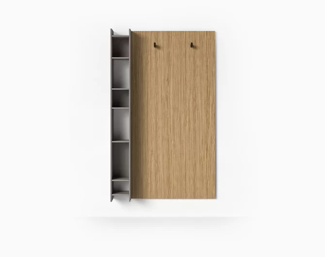 Multifunctional furniture solutions with coat hooks and rails built into entrance units, along with accessories and extra storage features. An open unit fitted with a coat rail, or a built-in solution on decorative paneling like Flag, keeps your coats and jackets to hand and provides useful surface space. Wall-mounted paneling with coat hooks alongside a tall unit, all raised on a platform. A complete, organized configuration, ideal for optimizing an entrance area with a recess. The Akka piece features a special unit design with a raised platform in the shape of the letter ‘H’, which also characterizes shelves and desks in the same collection. The Akka coat hook unit is also perfect alongside shoe cupboards or tall units with open ends, to create complete, well-organized compositions. Add another practical, stylish touch to this simple wood paneling with hooks by combining it with the cube wall bookcase. Many different elements, to create unique Homy style. The wall-mounted paneling for hanging coats and jackets is accompanied by a shoe cupboard: simple, functional features that also introduce elegant, natural style. More than just a coat rail, this tall composition features a unit, mirror and soft seat, all enclosed in a raised structure with wall paneling.