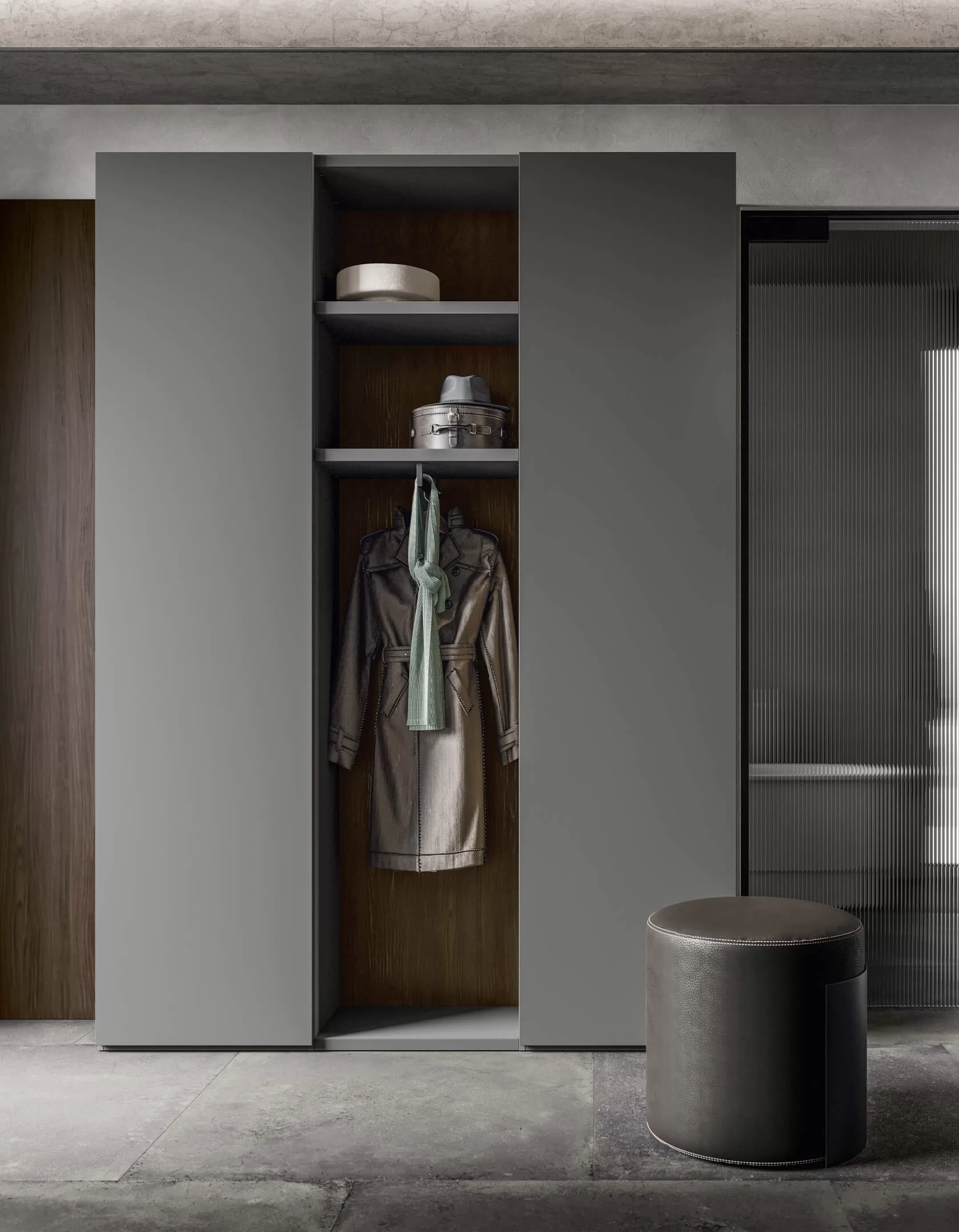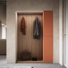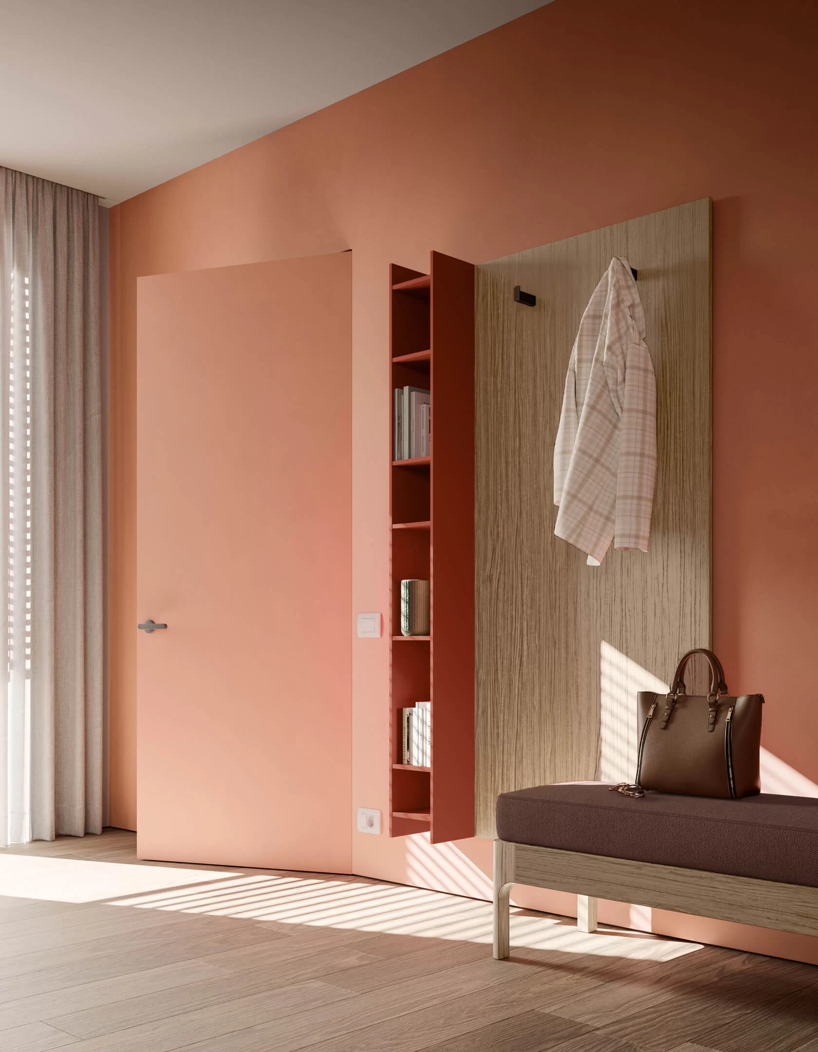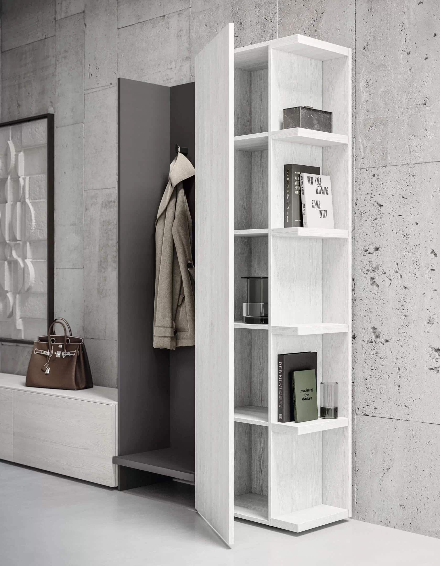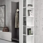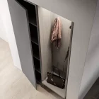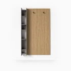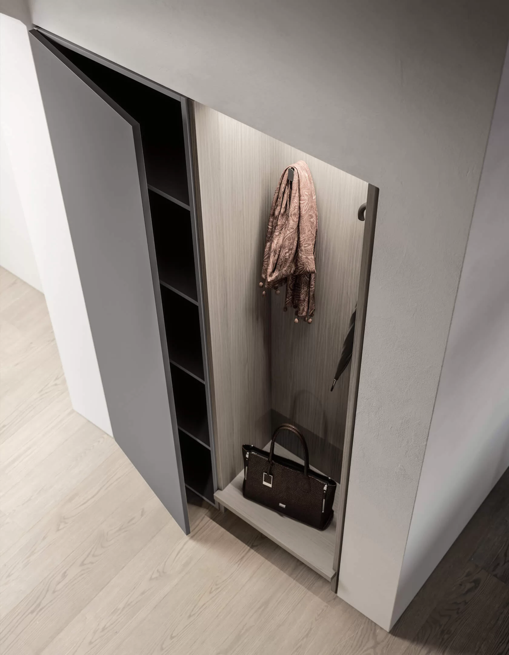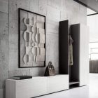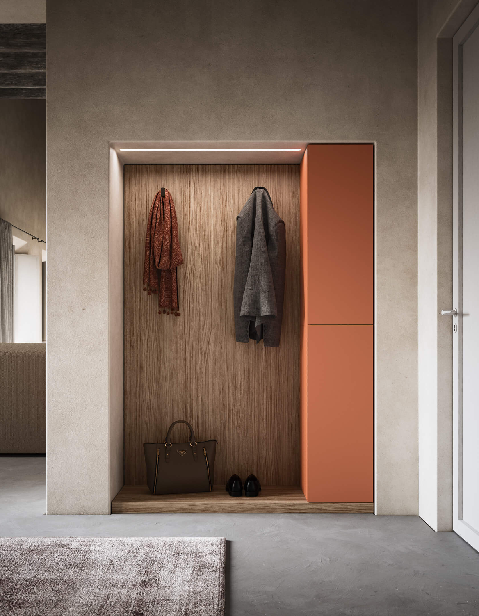 Multifunctional furniture solutions with coat hooks and rails built into entrance units, along with accessories and extra storage features. An open unit fitted with a coat rail, or a built-in solution on decorative paneling like Flag, keeps your coats and jackets to hand and provides useful surface space. Wall-mounted paneling with coat hooks alongside a tall unit, all raised on a platform. A complete, organized configuration, ideal for optimizing an entrance area with a recess. The Akka piece features a special unit design with a raised platform in the shape of the letter ‘H’, which also characterizes shelves and desks in the same collection. The Akka coat hook unit is also perfect alongside shoe cupboards or tall units with open ends, to create complete, well-organized compositions. Add another practical, stylish touch to this simple wood paneling with hooks by combining it with the cube wall bookcase. Many different elements, to create unique Homy style. The wall-mounted paneling for hanging coats and jackets is accompanied by a shoe cupboard: simple, functional features that also introduce elegant, natural style. More than just a coat rail, this tall composition features a unit, mirror and soft seat, all enclosed in a raised structure with wall paneling.
