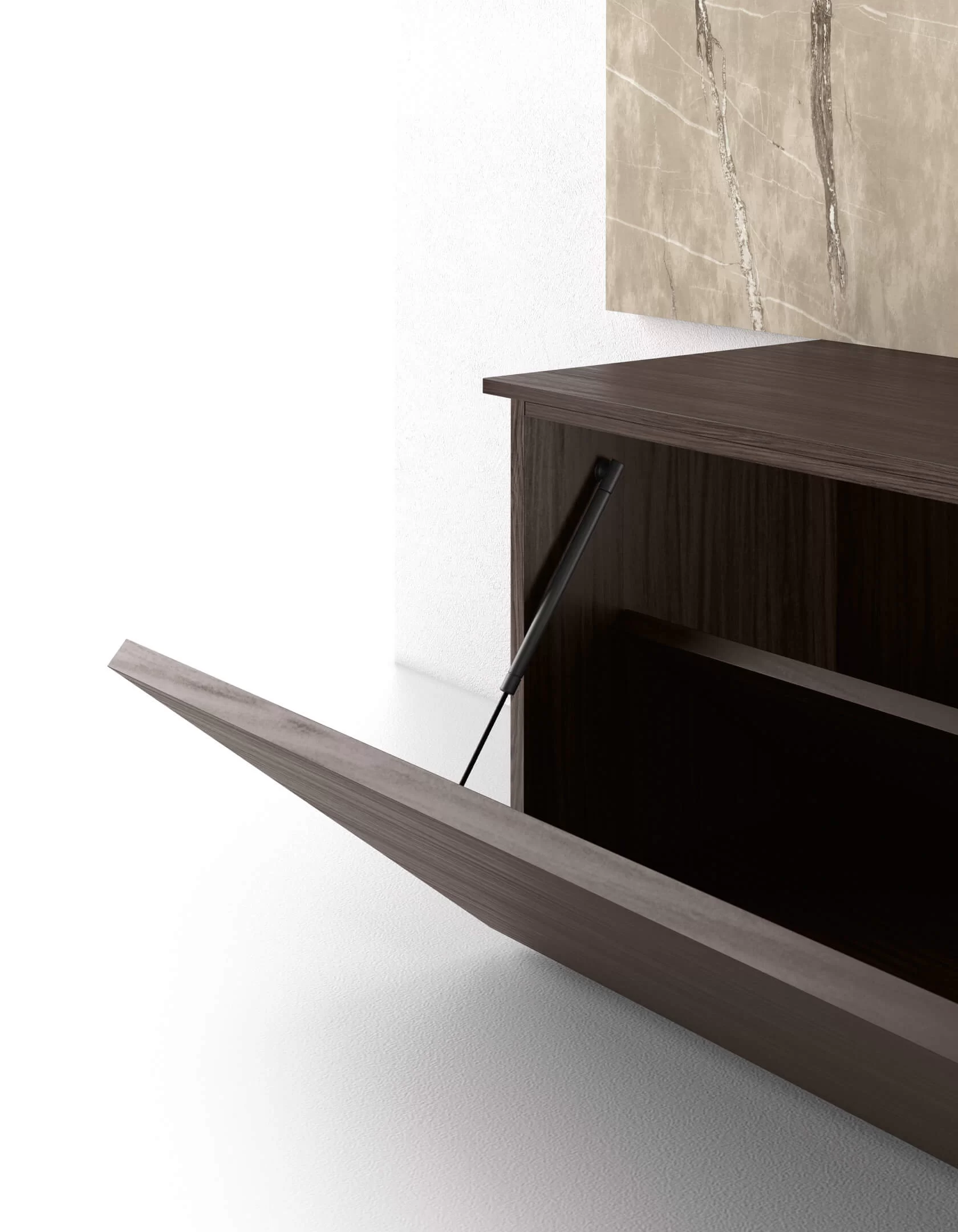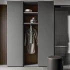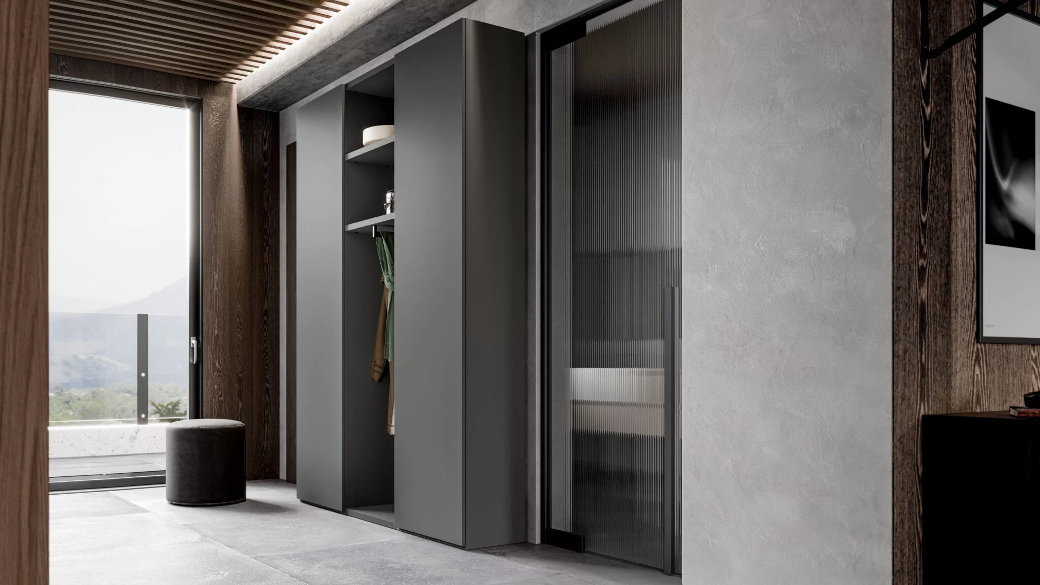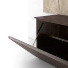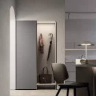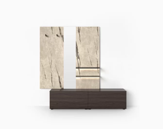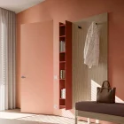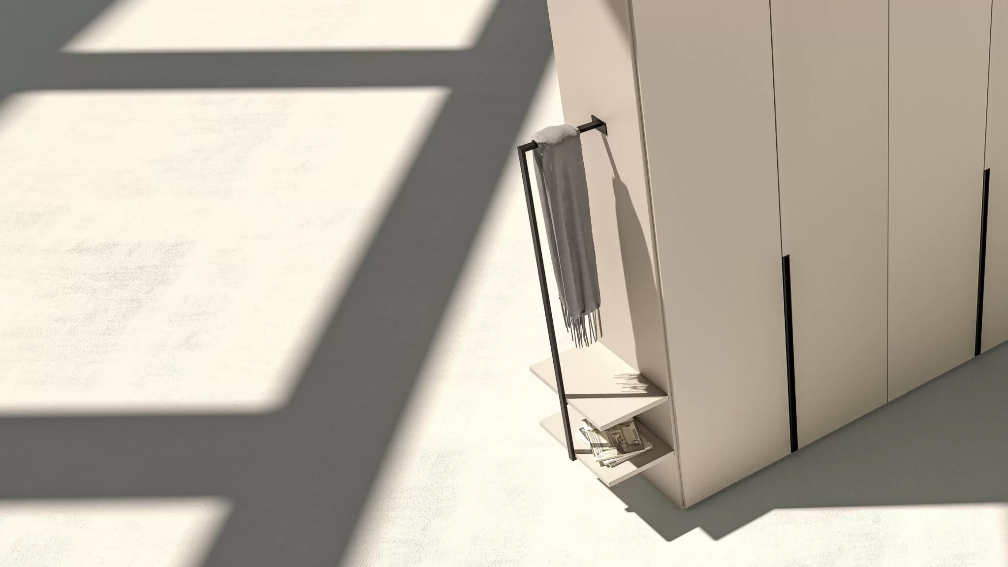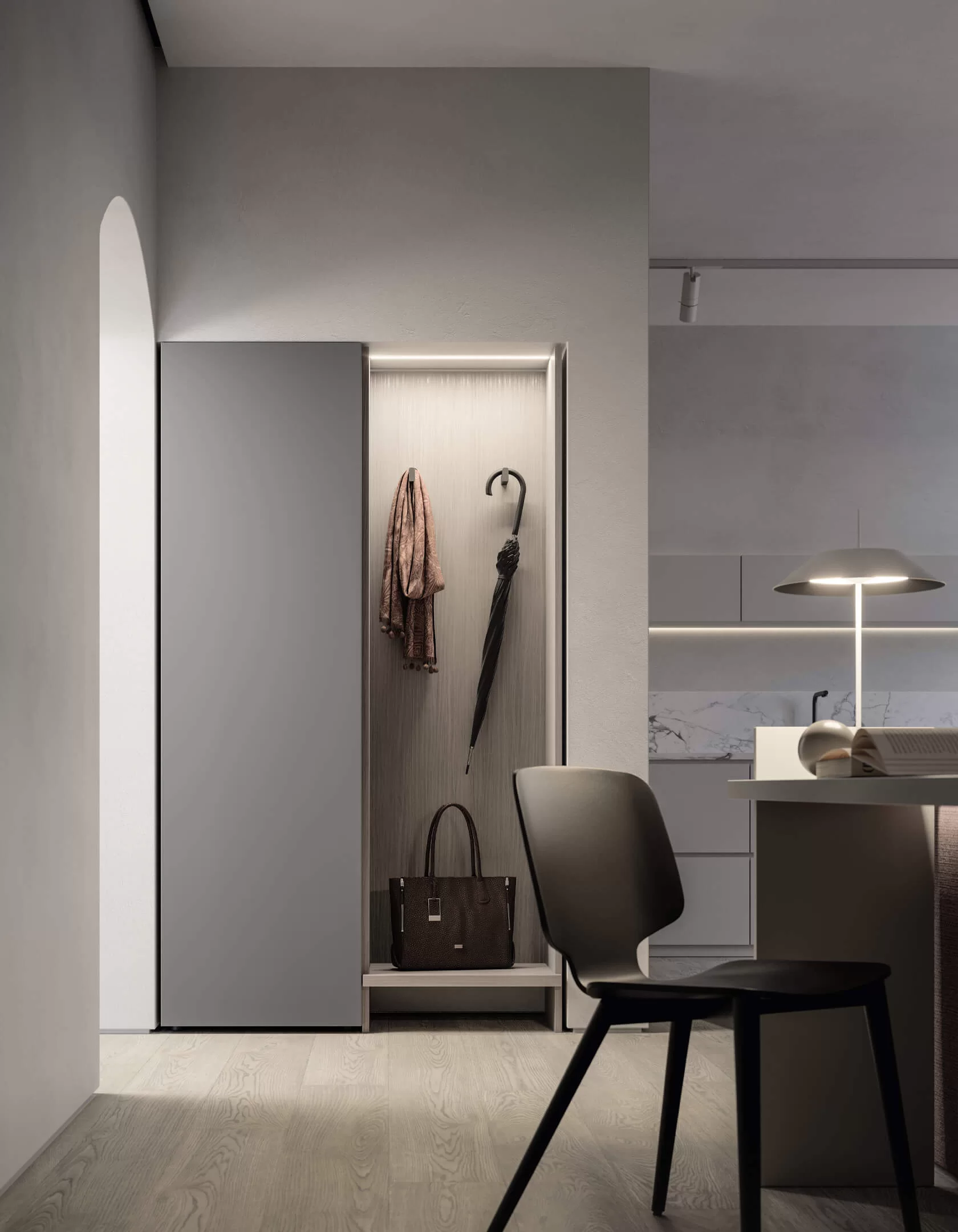Multifunctional furniture solutions with coat hooks and rails built into entrance units, along with accessories and extra storage features. An open unit fitted with a coat rail, or a built-in solution on decorative paneling like Flag, keeps your coats and jackets to hand and provides useful surface space. Wall-mounted paneling with coat hooks alongside a tall unit, all raised on a platform. A complete, organized configuration, ideal for optimizing an entrance area with a recess. The Akka piece features a special unit design with a raised platform in the shape of the letter ‘H’, which also characterizes shelves and desks in the same collection. The Akka coat hook unit is also perfect alongside shoe cupboards or tall units with open ends, to create complete, well-organized compositions. Add another practical, stylish touch to this simple wood paneling with hooks by combining it with the cube wall bookcase. Many different elements, to create unique Homy style. The wall-mounted paneling for hanging coats and jackets is accompanied by a shoe cupboard: simple, functional features that also introduce elegant, natural style. More than just a coat rail, this tall composition features a unit, mirror and soft seat, all enclosed in a raised structure with wall paneling.