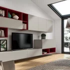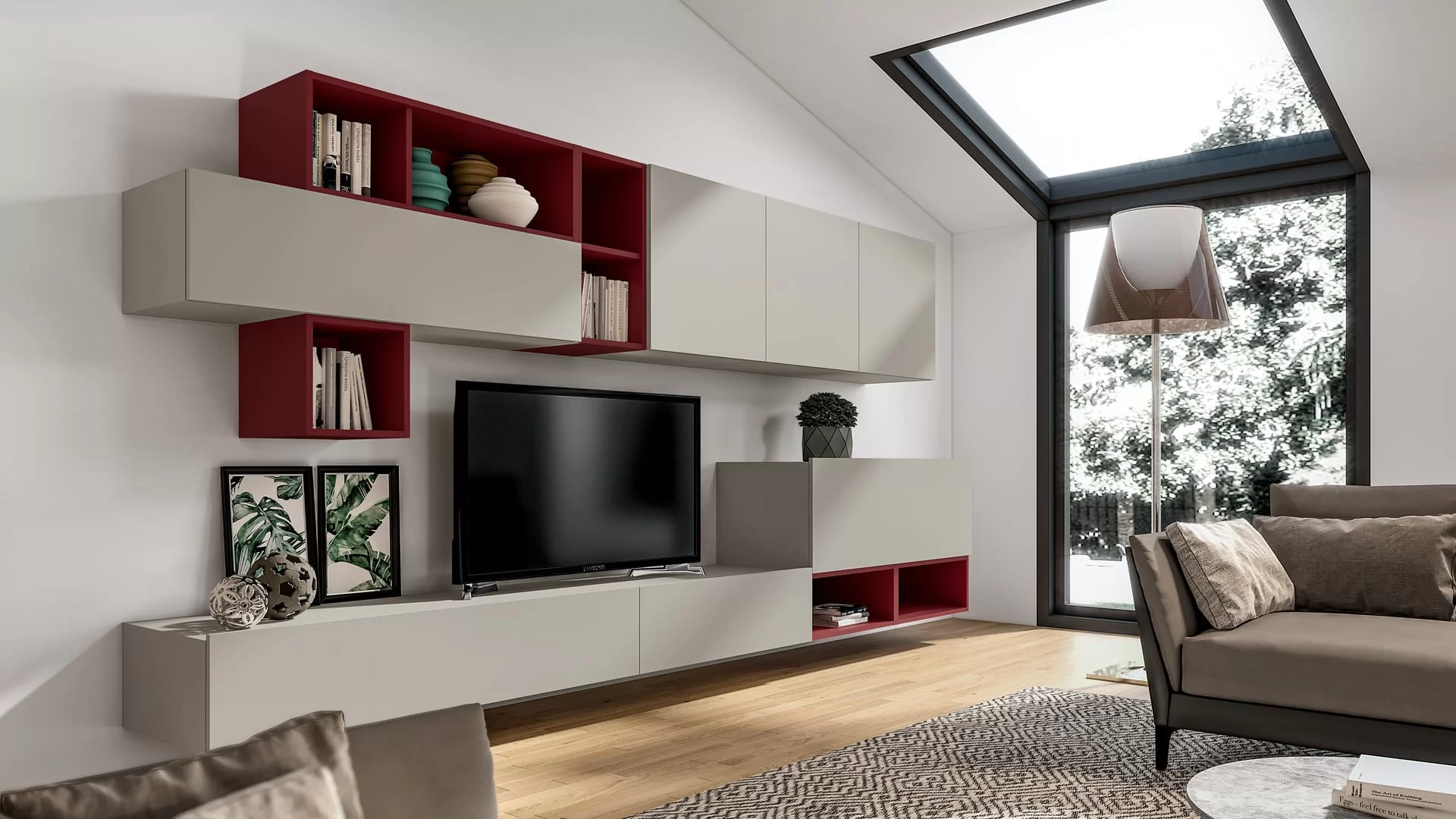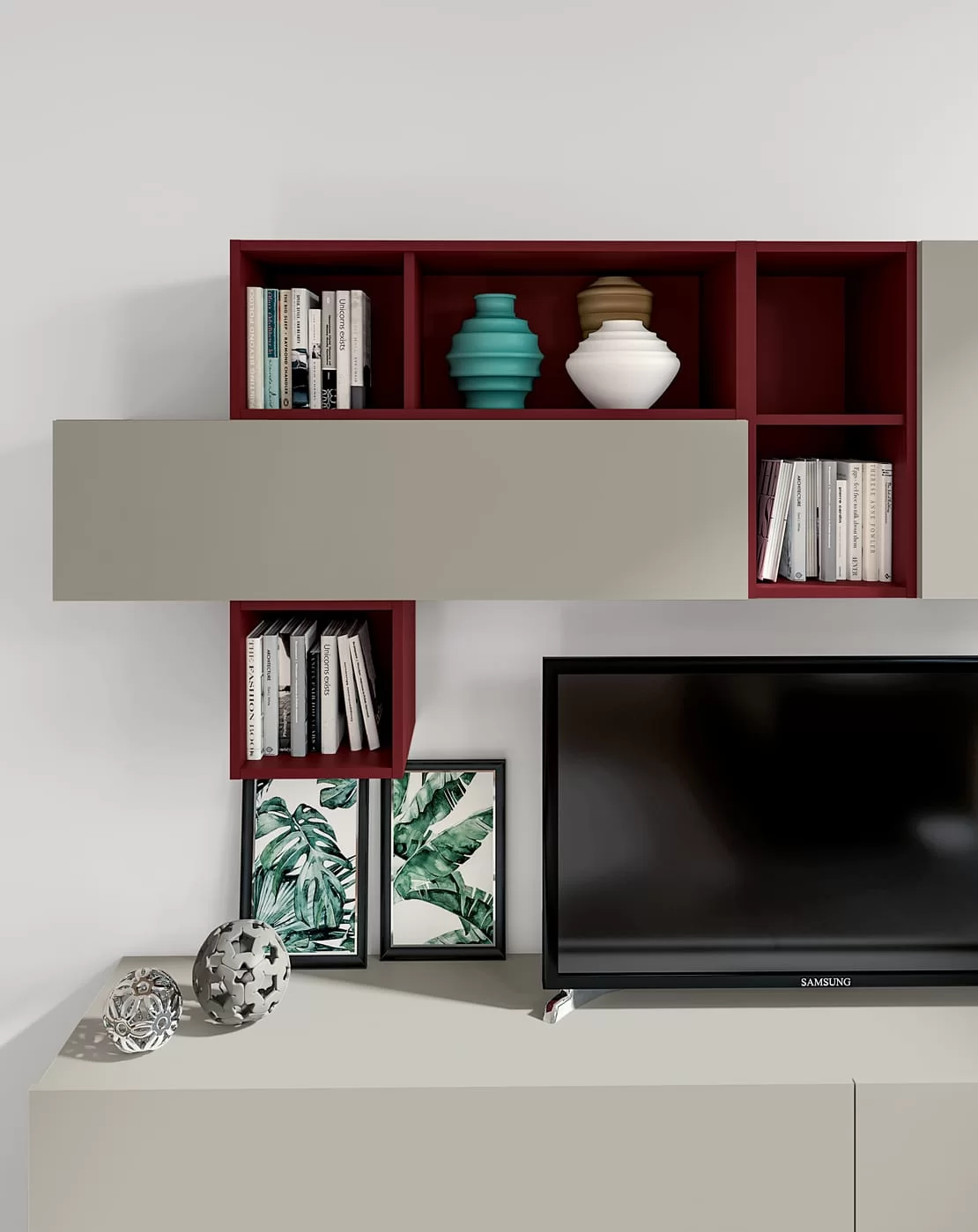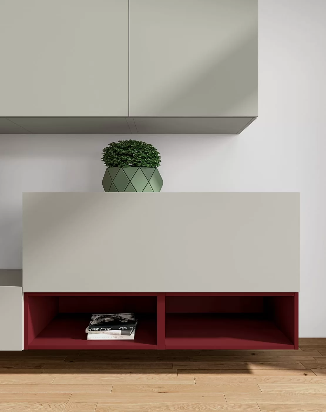 This living room has a young vibe, designed to be practical, with different-sized open compartments you can customize in six shades. The open compartments add a modern, functional touch to the composition, for an on-trend look. Add your favorite design pieces or books to this lively space, which comes in the three colors in the Fresh range to highlight the simple, geometric lines of these units.
