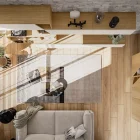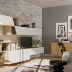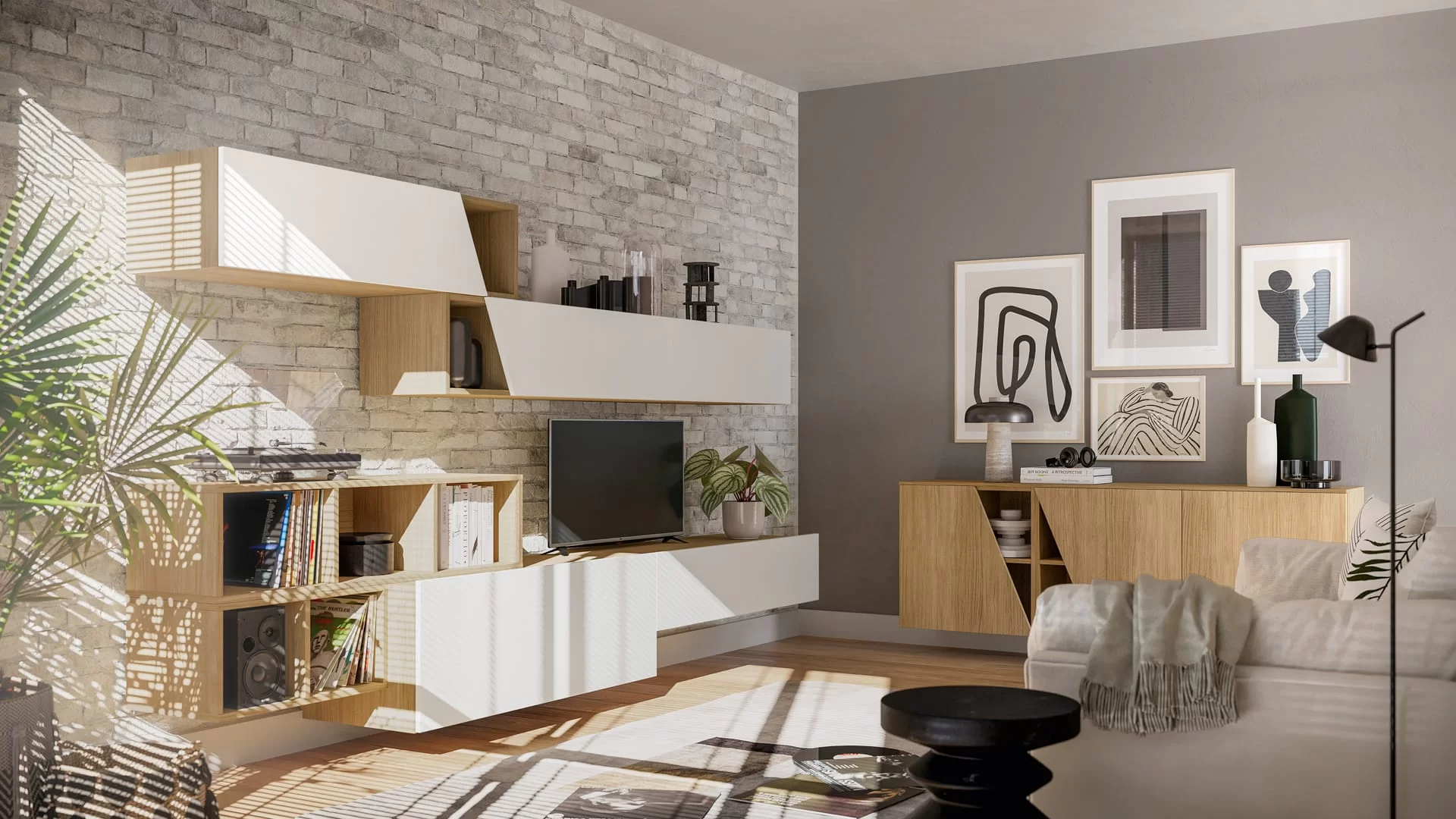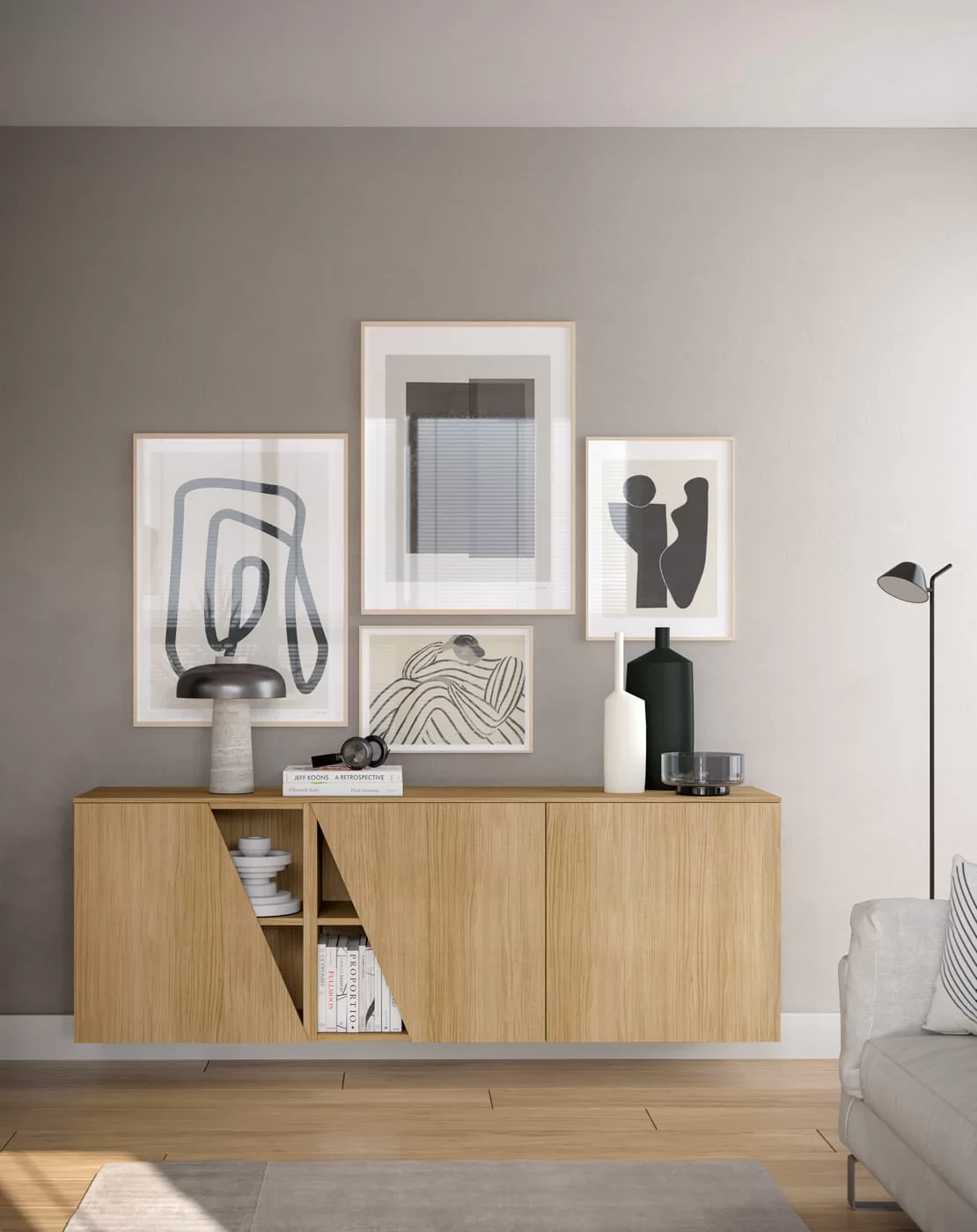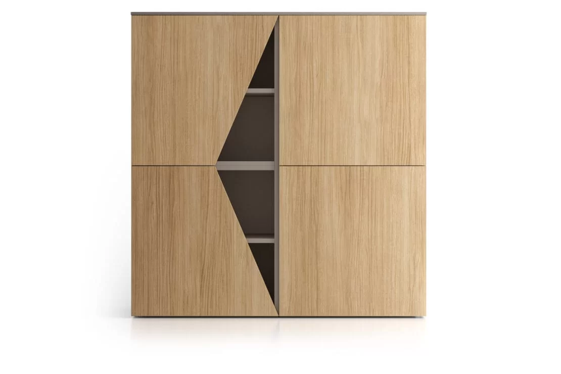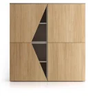 The living room gains additional character from the oblique cuts of the doors on the wall units and the sideboard. Open-fronted modules in the base units add a further geometrical dimension. The modules with oblique-cut doors reduce the sideboard’s volumes with an eye-catching design and create an original see-through effect. A striking alternative to the more decorative open compartments. Whether placed side-by-side or stacked, the modules with oblique-cut doors provide an opportunity for individual configurations and creative living.
