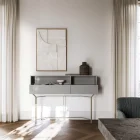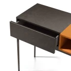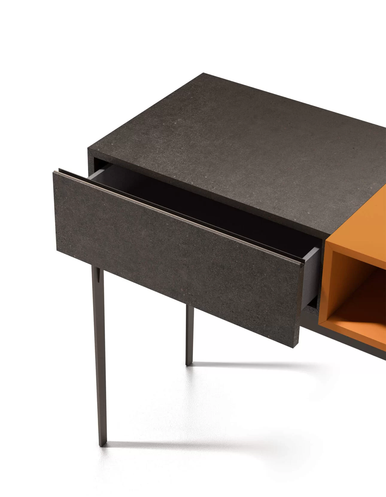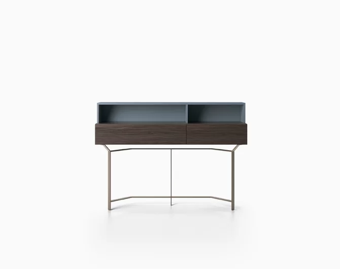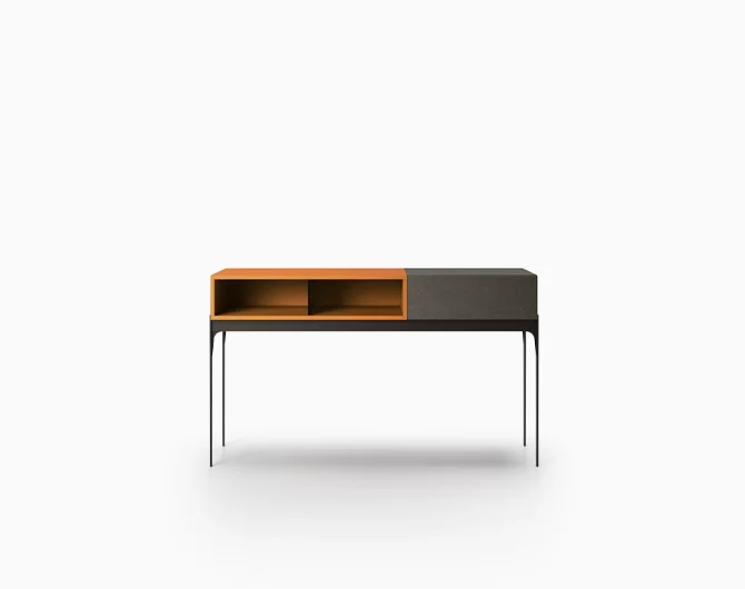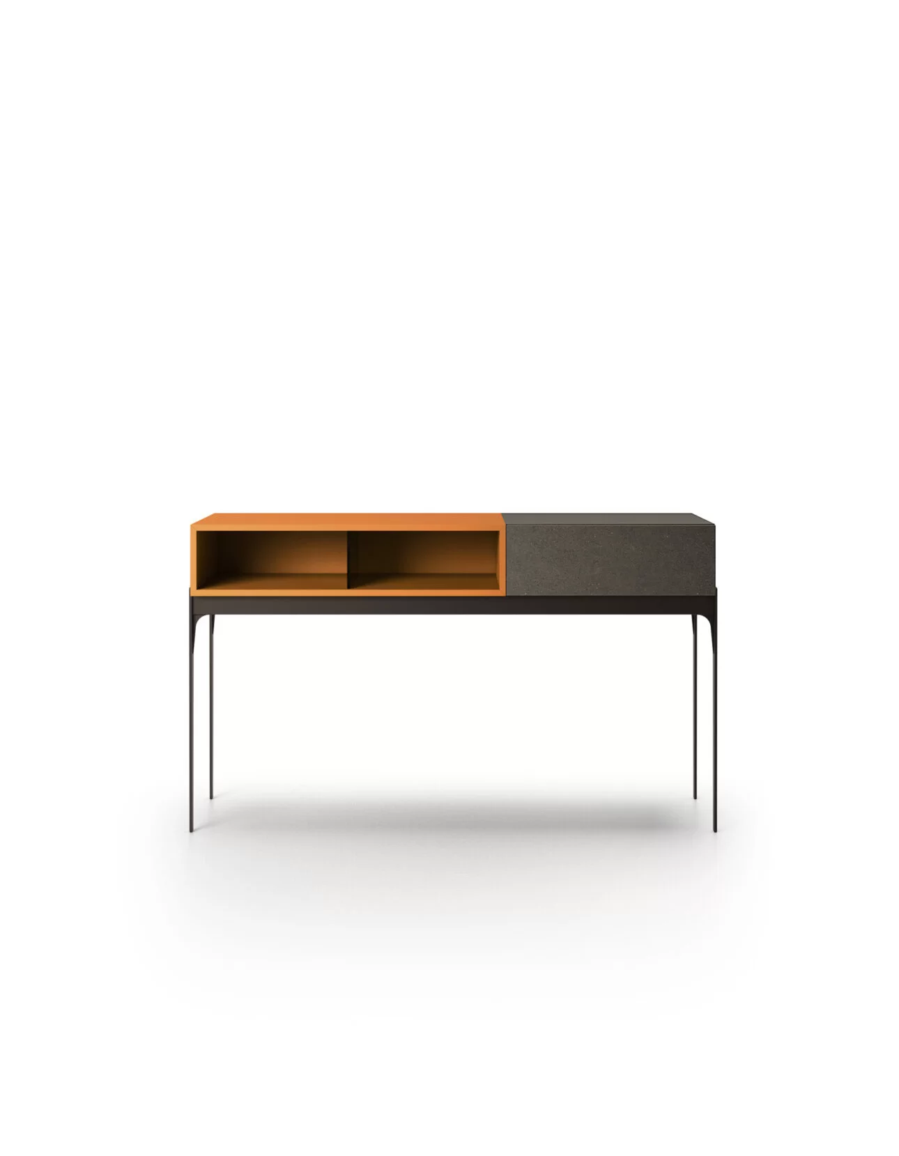 Modern designer consoles for furnishing ultra-practical hallways or living areas in an original style. A lacquered open compartment in a vibrant color slots into the console build with a drawer in a textured Graniglia finish. Stylish and sophisticated – guaranteed to steel the show, as soon as you step foot inside. A simple console design provides doubles the vertical storage space. Compartments with doors and drawers complement the distinctive open unit you can customize with Stopsol glass dividers. A modern design with an original Wire bracket base. This extremely versatile piece looks great but is also stylish – customize it in many different combinations of colors and finishes.