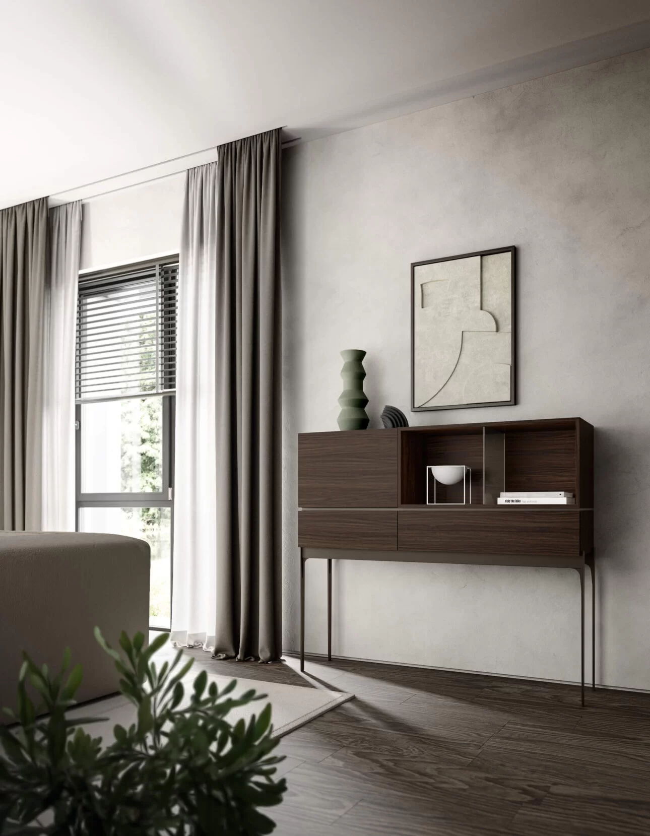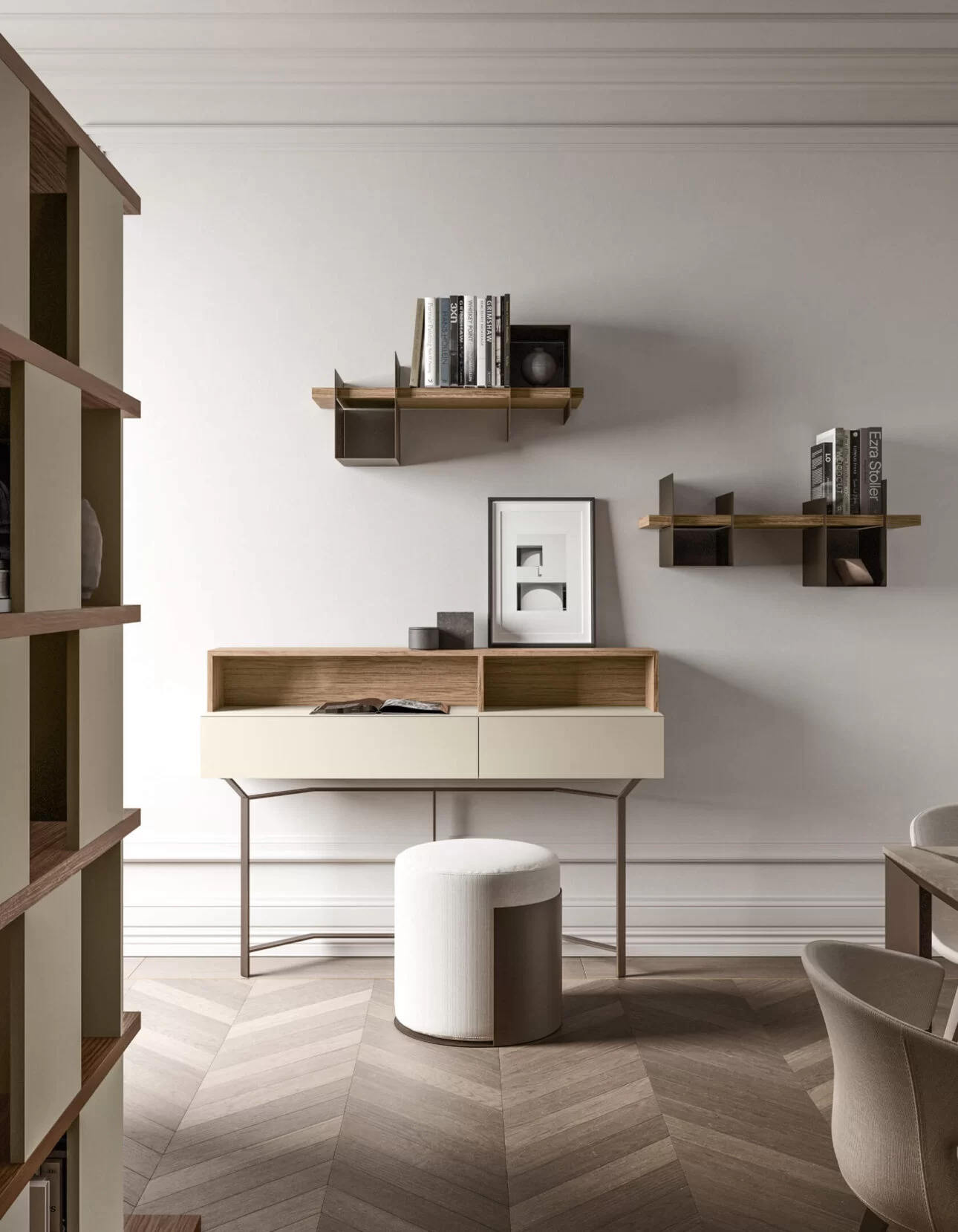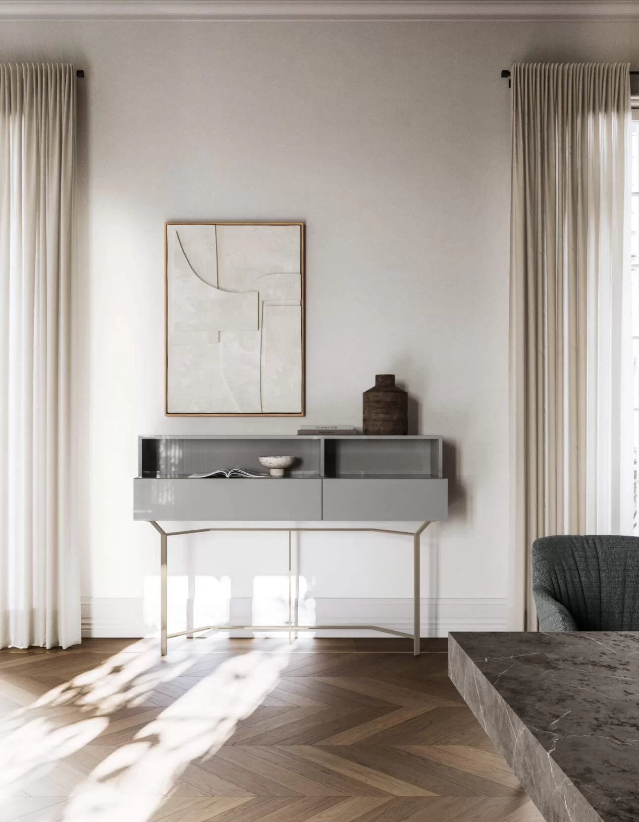 Modern designer consoles for furnishing ultra-practical hallways or living areas in an original style. A lacquered open compartment in a vibrant color slots into the console build with a drawer in a textured Graniglia finish. Stylish and sophisticated – guaranteed to steel the show, as soon as you step foot inside. A simple console design provides doubles the vertical storage space. Compartments with doors and drawers complement the distinctive open unit you can customize with Stopsol glass dividers. A modern design with an original Wire bracket base. This extremely versatile piece looks great but is also stylish – customize it in many different combinations of colors and finishes.