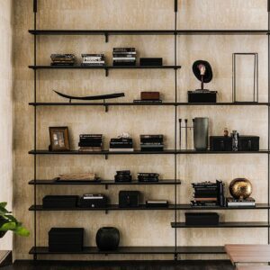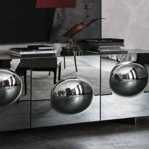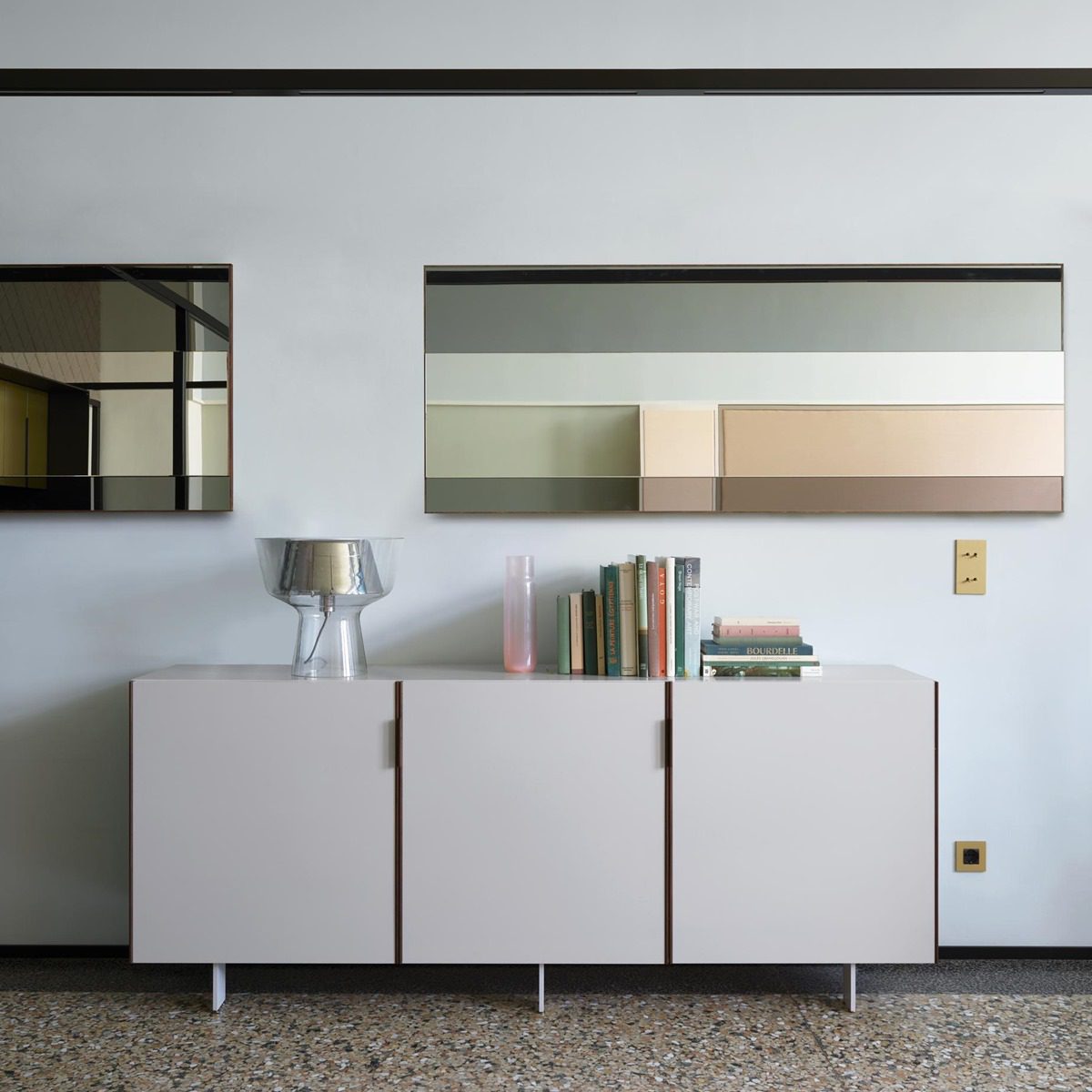 First launched in 2008, the Coplan sideboard is being updated for 2016. The way in which its two coplanar doors open has been retained: side by side when closed, they pivot on opening and slide one in front of the other. Since there is no clearance required when opening, one can have a 200 or 230 cm long sideboard with just 2 sliding doors instead of 3, 4 or 5 hinged doors. The gain, aesthetically speaking, is one of simplicity and purity of line.