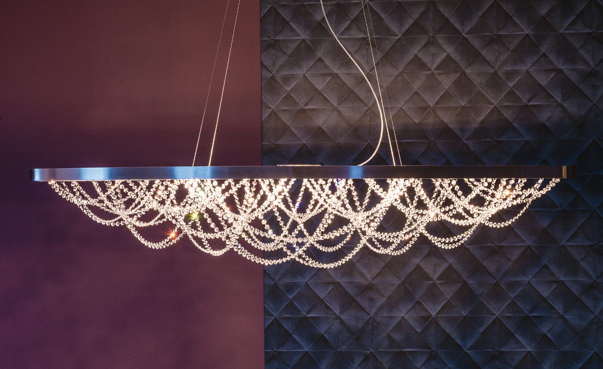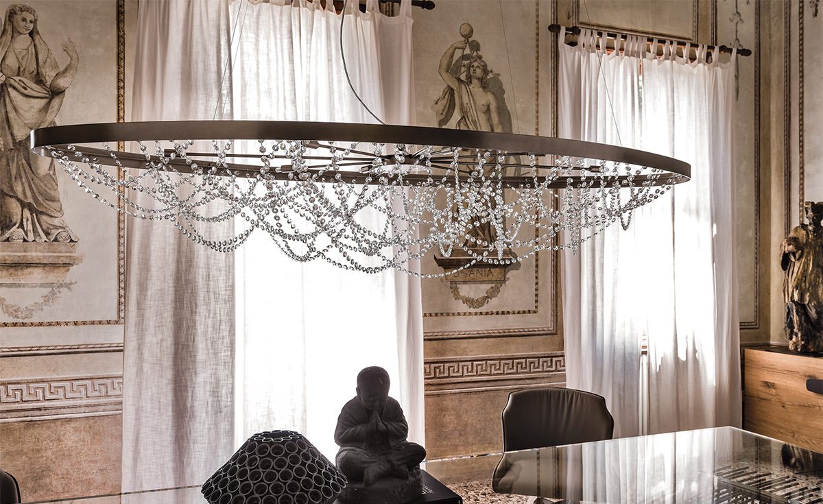 The elegant design chandelier Cristal consists of a nickel edge to which chains with crystal pendants are applied that intersect with the charm and elegance worthy of a precious jewel. This modern pendant lamp is the result of a combination of avant-garde production techniques and the attention to detail that characterises high quality manufacturing.