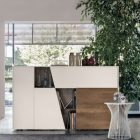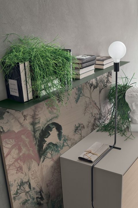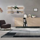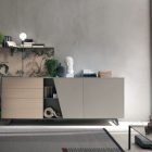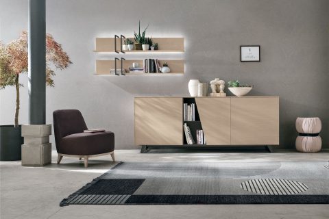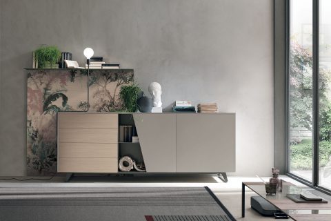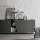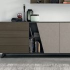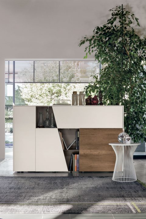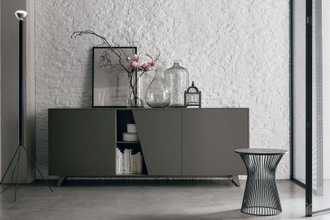 Diagonal sideboard, Var. A, matt smoke 128 lacquered carcass, matt pumice 152 lacquered open compartment and base.