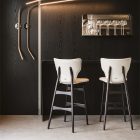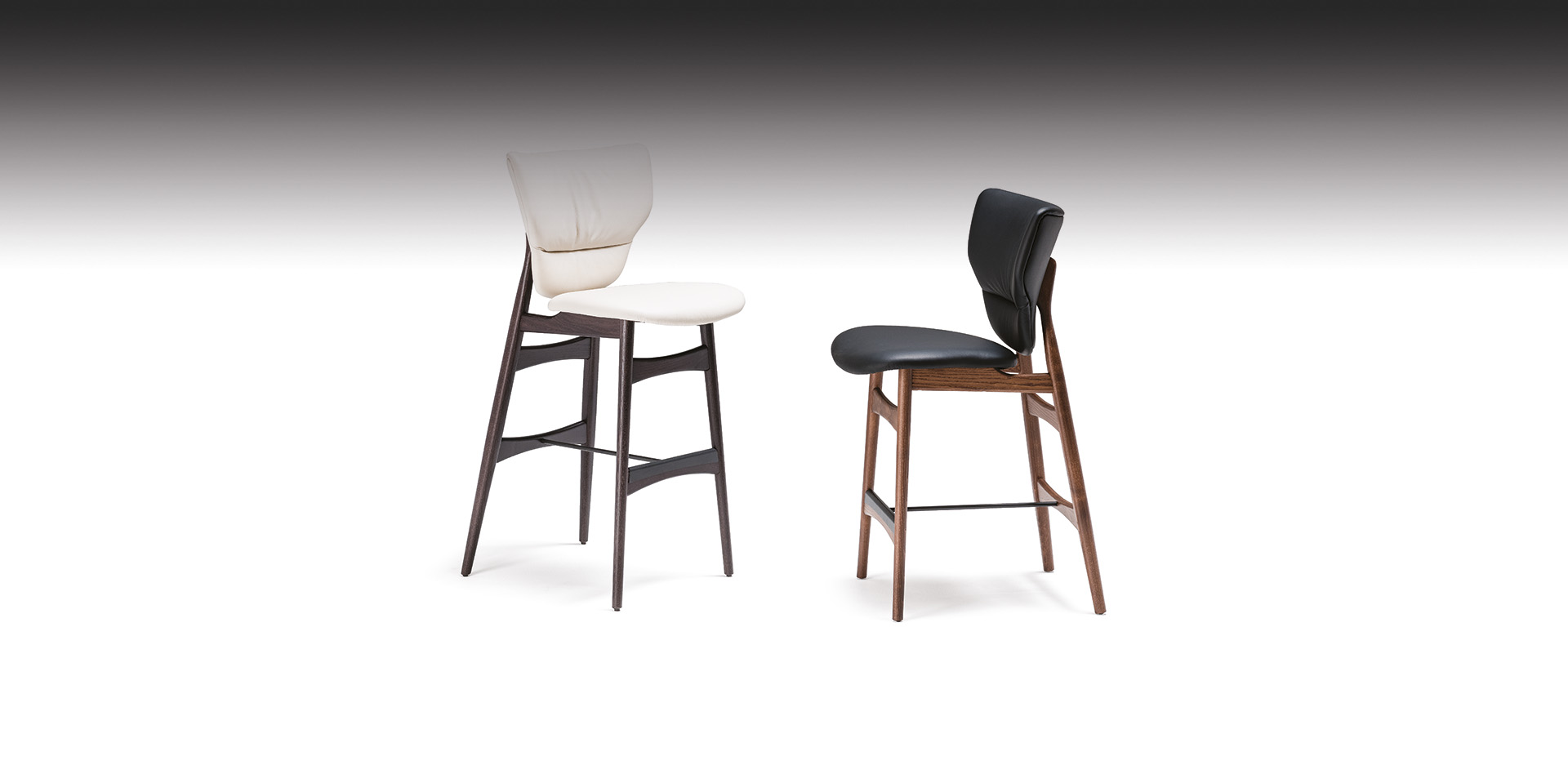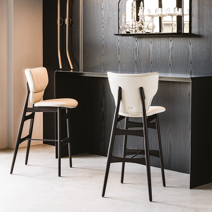 Stool with frame in Canaletto walnut stained ashwood (frNC), burned oak stained ashwood (frRB) or open pore matt black (fr73) painted ashwood. Seat and back upholstered in fabric, synthetic leather or soft leather as per sample card.