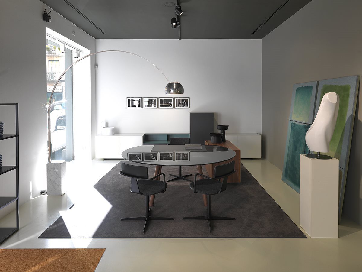 The DV911 Noto collection of tables recalls the idea of the classic work table on trestle legs. The structure is in solid wood and the top, available in the rectangular and round versions, is available in three different finishes that give each table a particular character: the stoneware top for an important setting; in glass for a lighter and minimal style; in wood for a contemporary interpretation of the traditional work area.