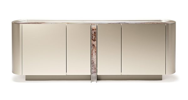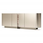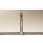 The star element of the Dynasty modern sideboard is undoubtedly the decorated printed glass that reproduces the fascinating veins of natural marble. The top is made of printed glass, as is a central vertical portion, positioned on a level below the painted wood doors. This design sideboard is rich in carefully selected details such as the rounded sides or the edge of the upper top, raised above the glass plate. In this way, emphasis is placed on the furniture’s function of looking after objects dear to us, while simultaneously highlighting them.