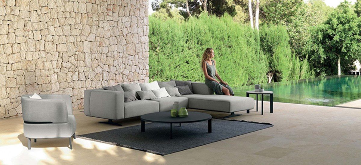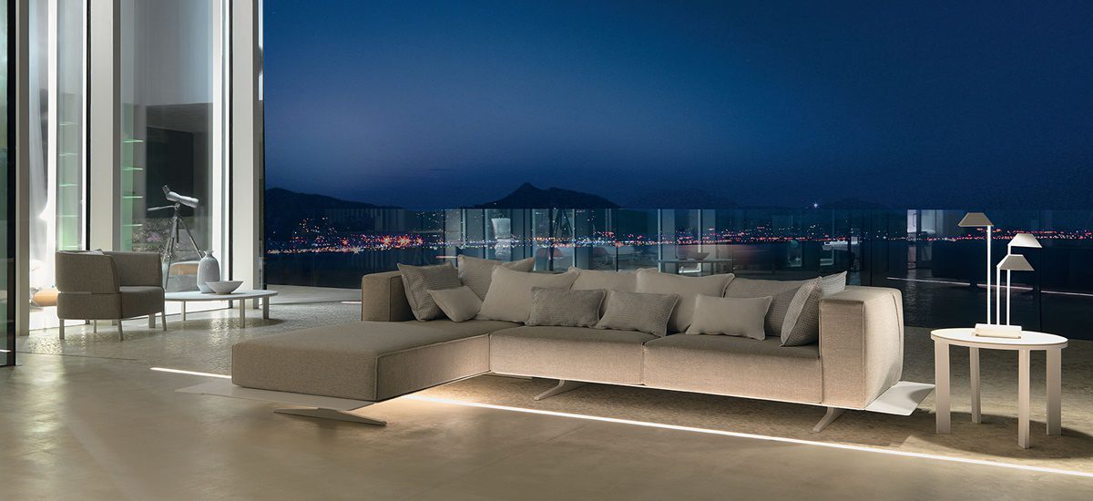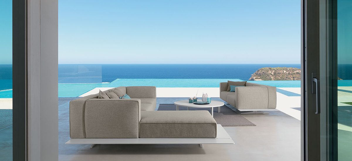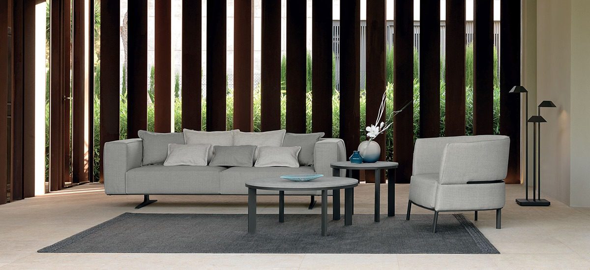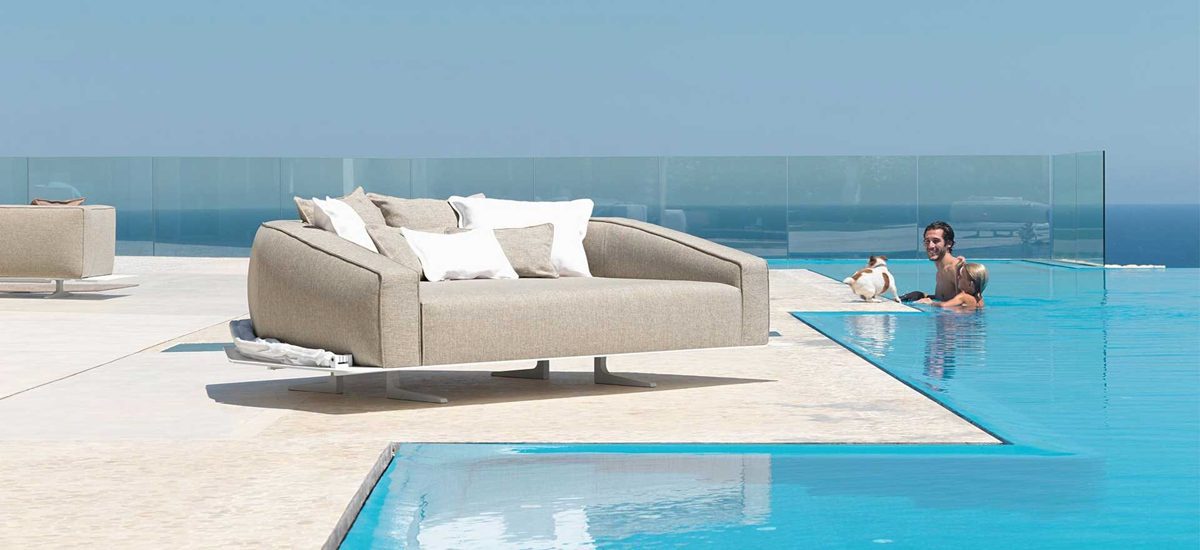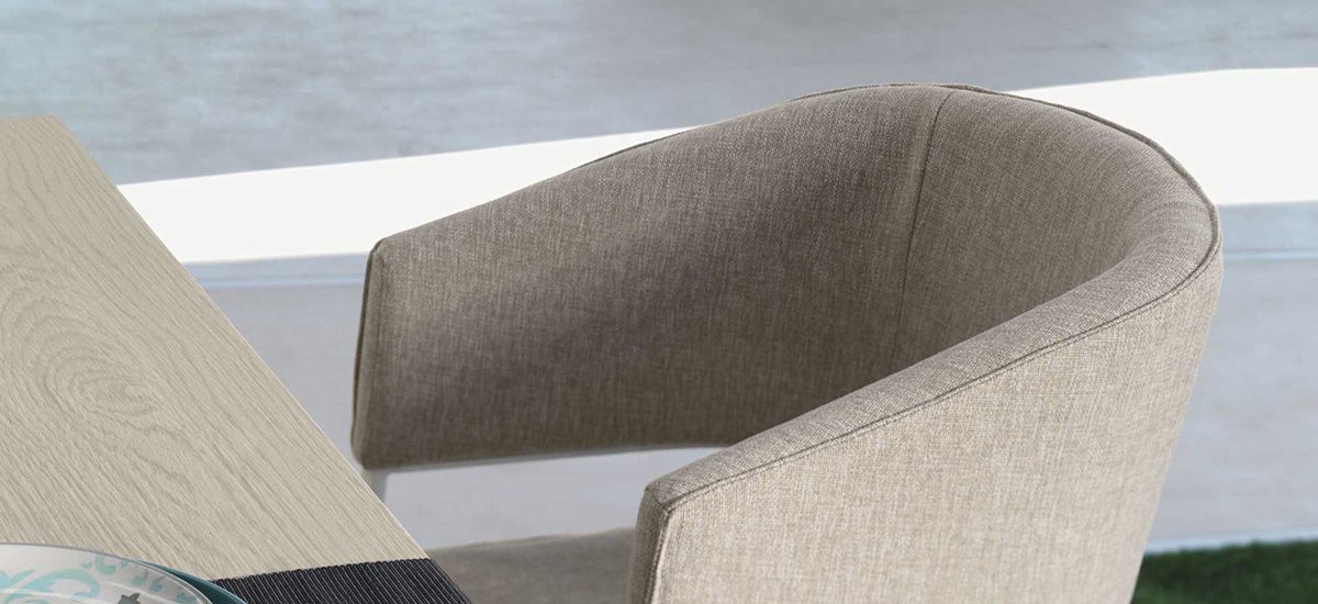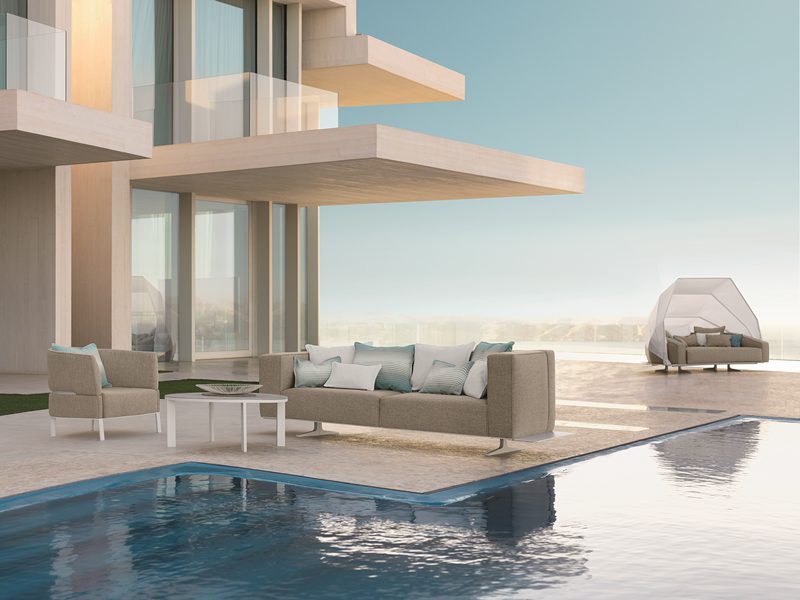 Fine, delicate, aluminium frames support enveloping, significant volumes, resulting in an almost ethereal sense of lightness in a perfect, harmonious balance of substance and space. The EDEN collection has a Jimmiz -covered upholstery and is characterized by its large and inviting seats. Attention to detail, refinement and elegance permeate each individual piece in the range: from the sofa to the lounge armchair, and from the table to the inviting daybed.