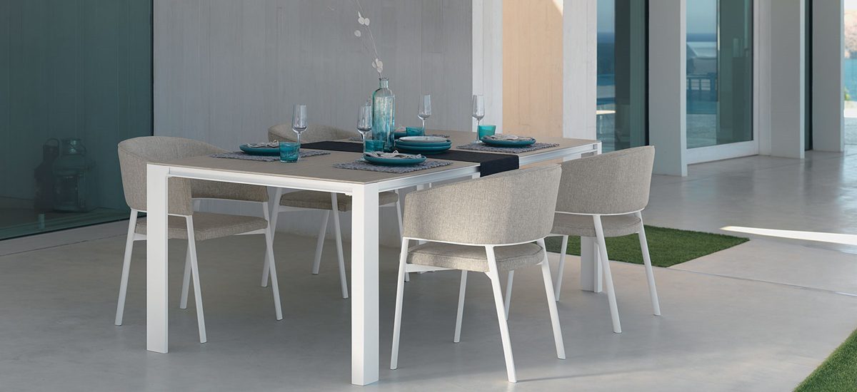 Dining and coffee tables with a 6mm porcelain stoneware top for the white frame or with a 12mm cement fiber top for the graphite frame.