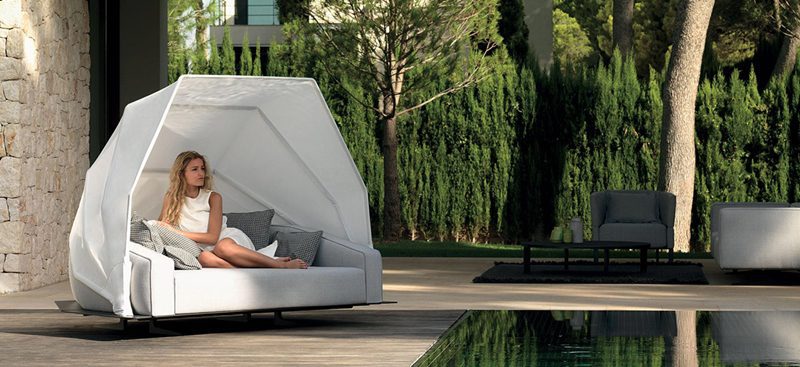 Quick dry foam padding. Daybed canopy with opening/closing hydraulic system. Coffee table ΓΈ120cm made of aluminum.