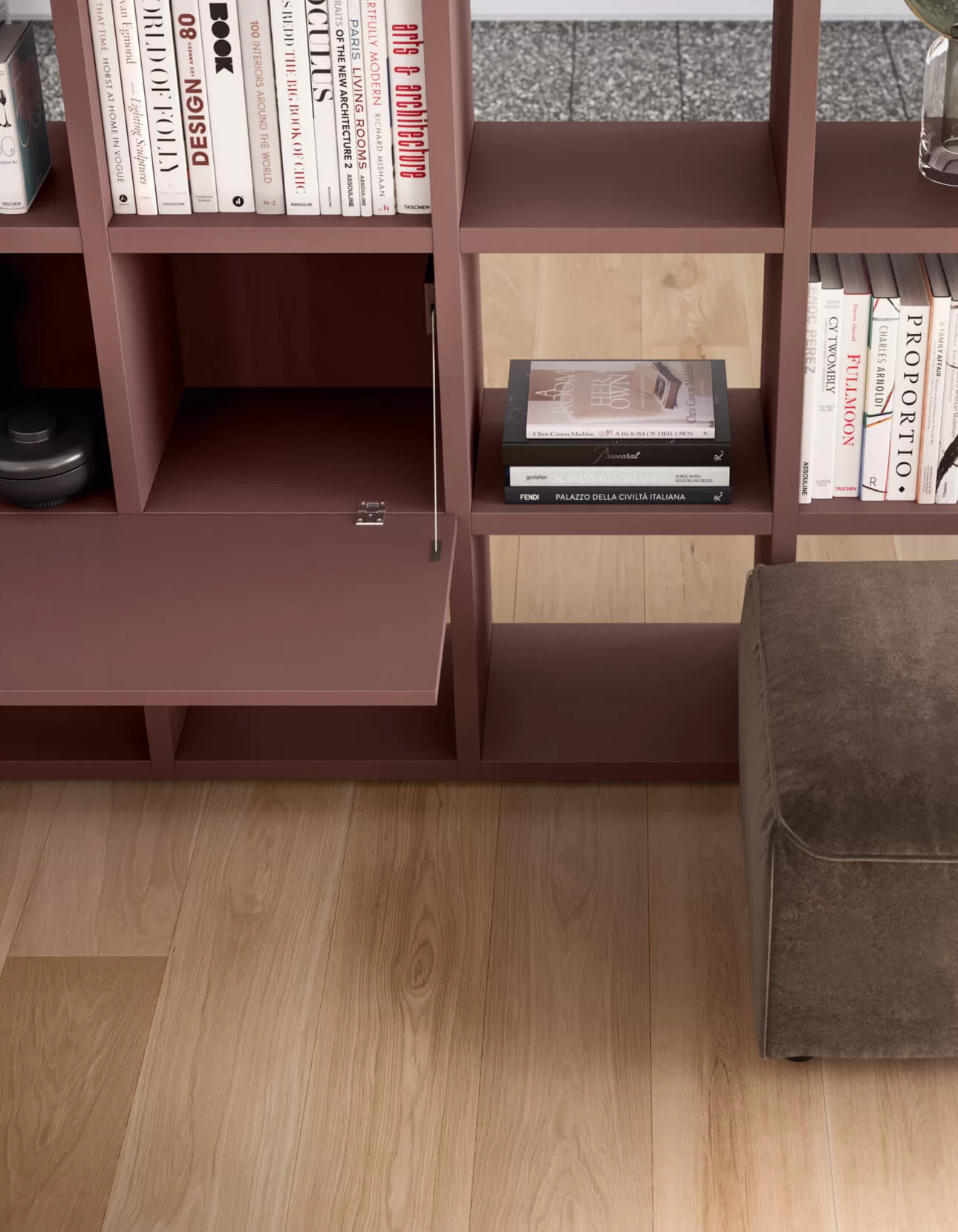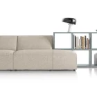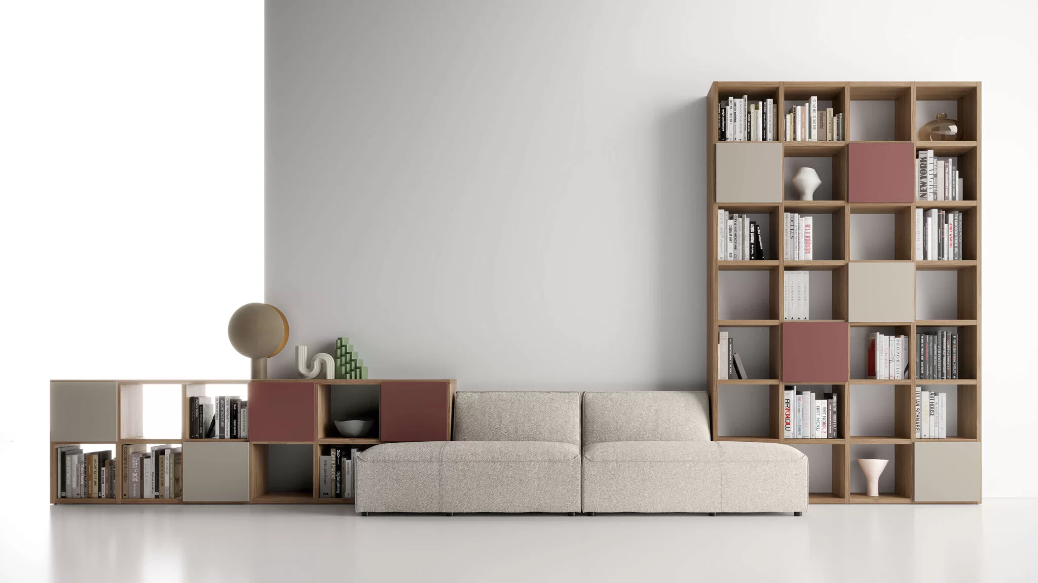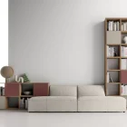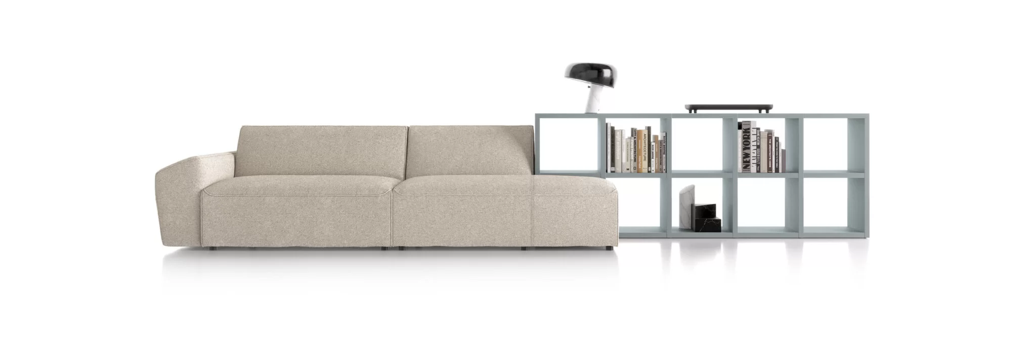 Modular sofa with integrated bookcase at the sides, in varying sizes and structural configurations, with open or closed compartments. The double-sided bookcases integrated into the sides of the Evan sofa offer new layout options to transform living spaces, with dynamic interior solutions broadening the horizons of multifunctional design. In addition to open compartments, closed units with drop-down doors are also available. Freestanding bookcases for use alongside the Evan sofa are extremely versatile interior pieces in terms of style and function.