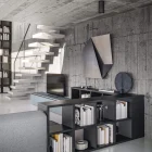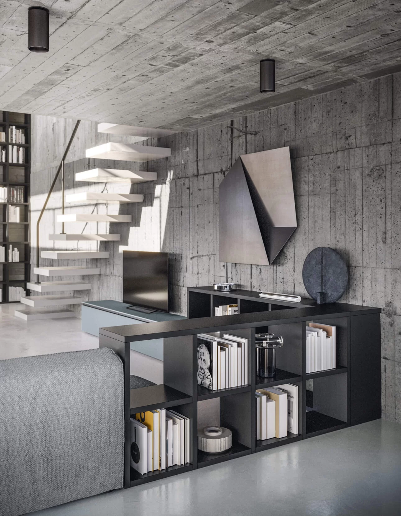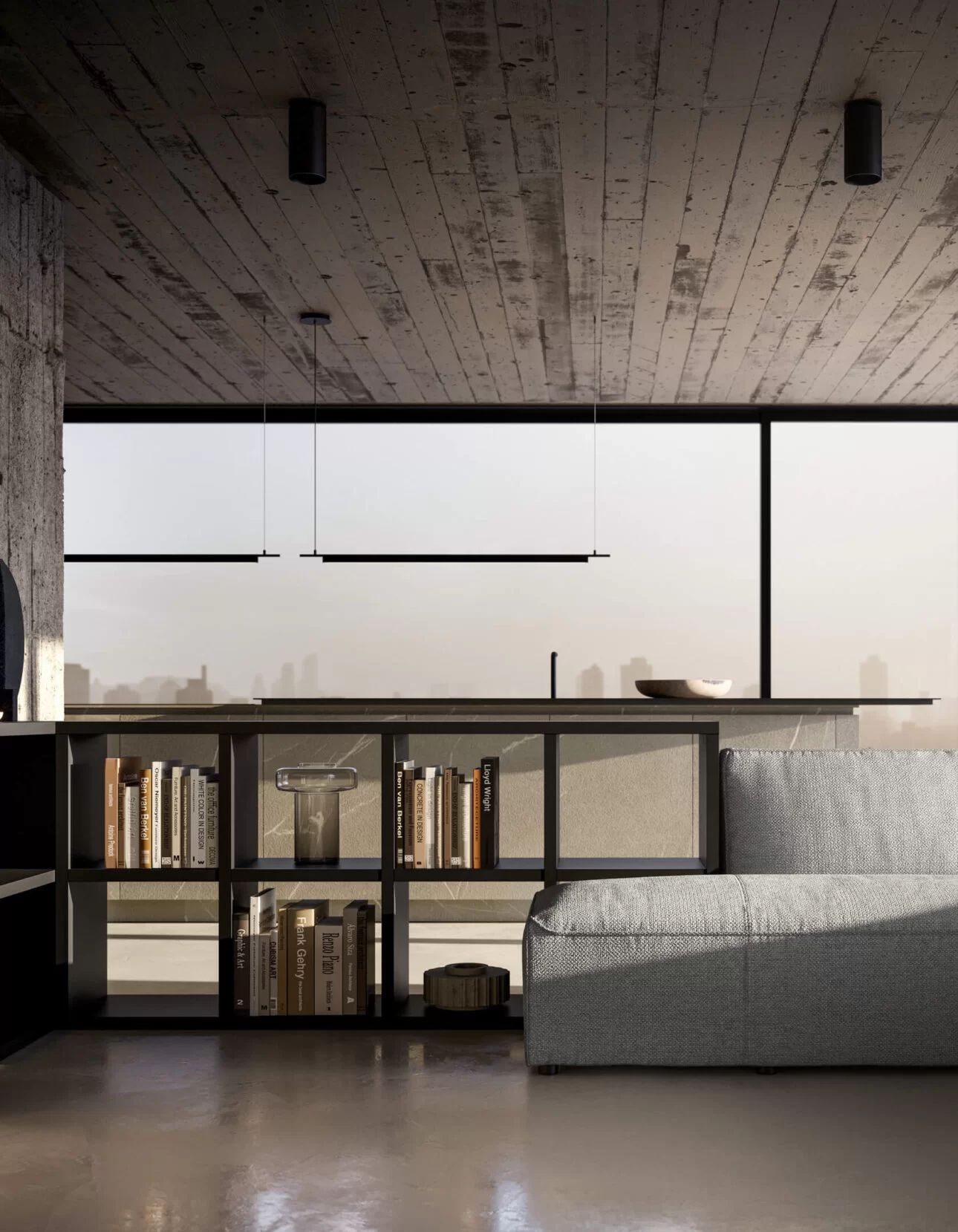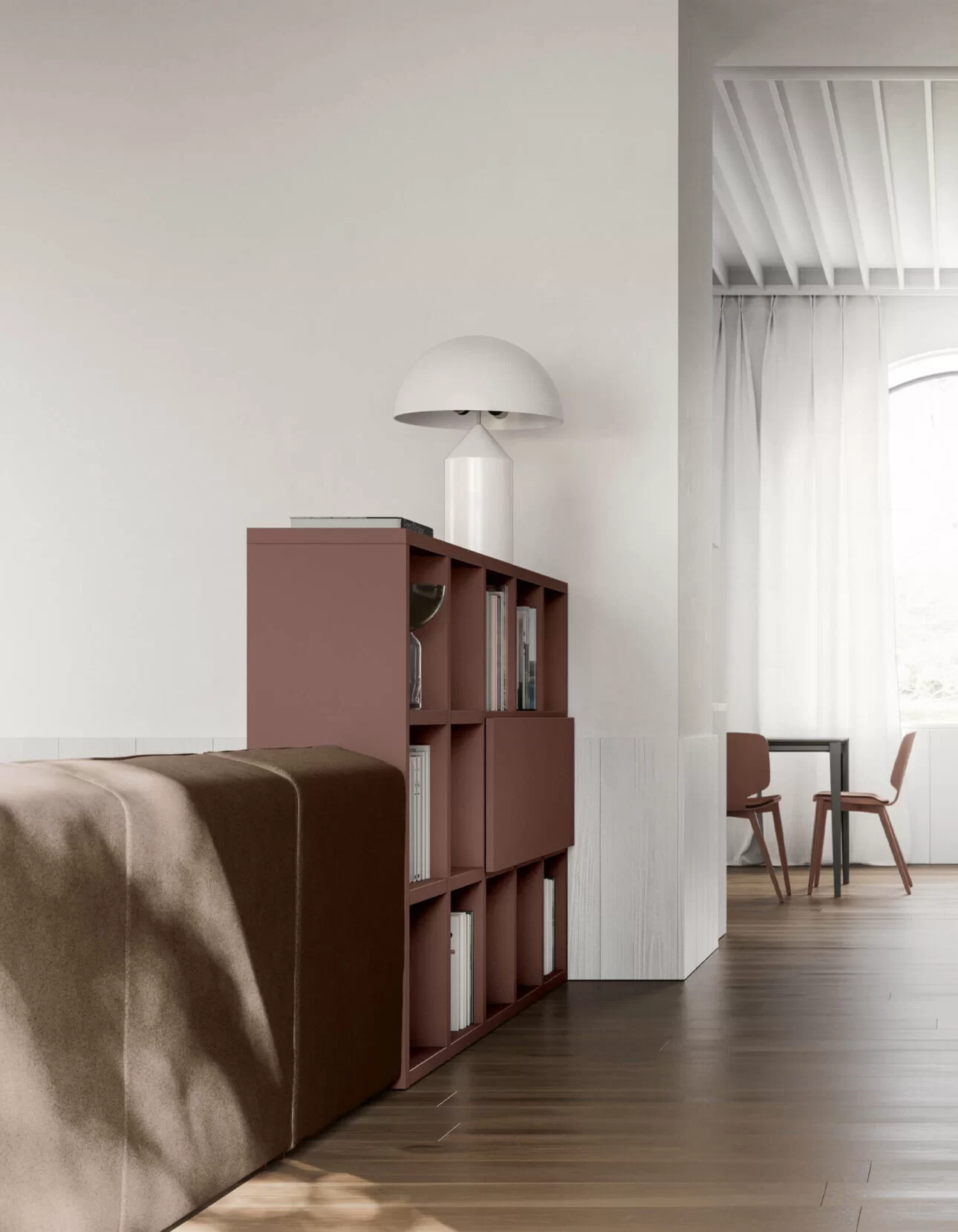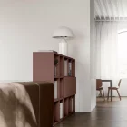 Modular sofa with integrated bookcase at the sides, in varying sizes and structural configurations, with open or closed compartments. The double-sided bookcases integrated into the sides of the Evan sofa offer new layout options to transform living spaces, with dynamic interior solutions broadening the horizons of multifunctional design. In addition to open compartments, closed units with drop-down doors are also available. Freestanding bookcases for use alongside the Evan sofa are extremely versatile interior pieces in terms of style and function.