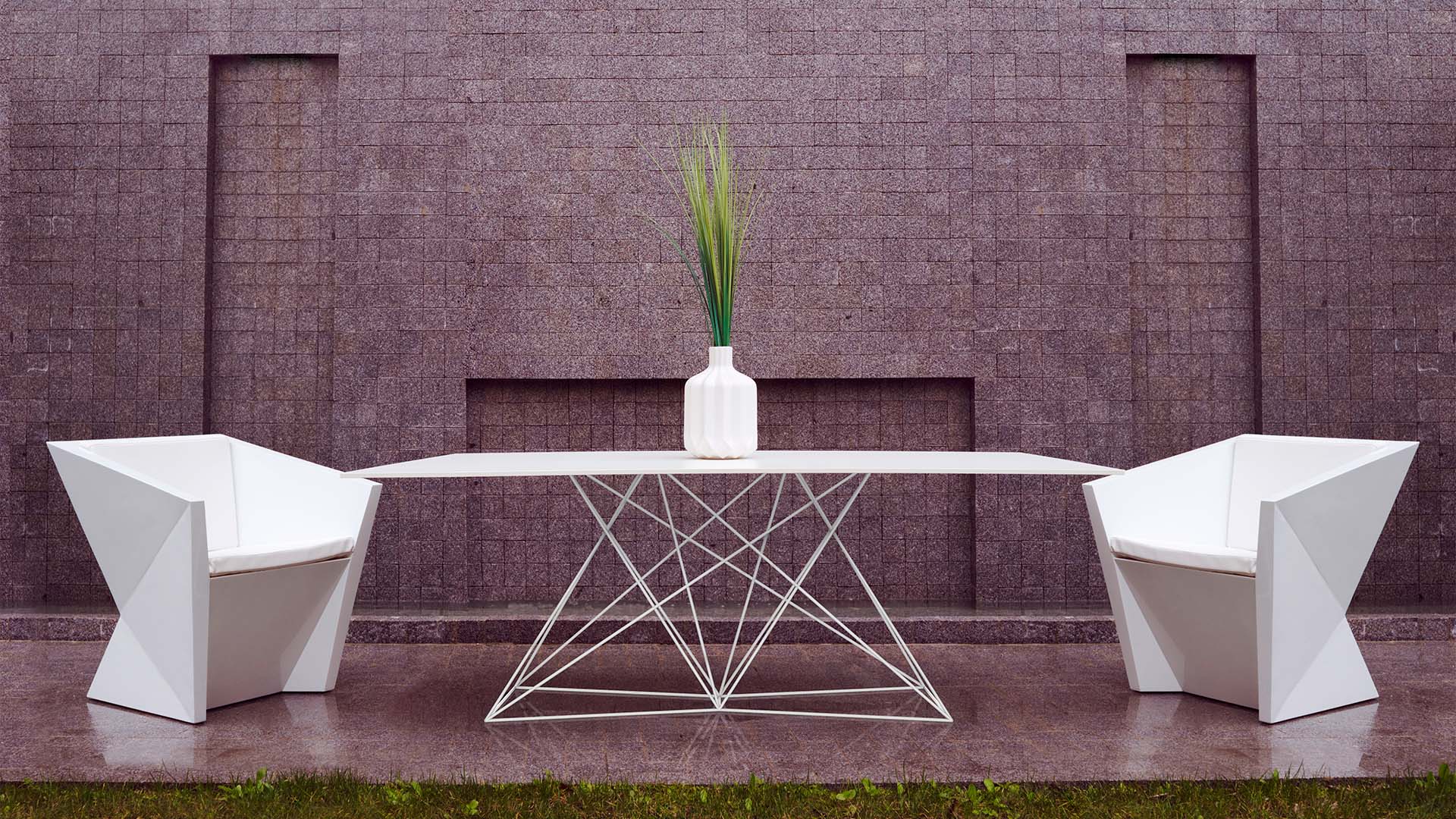 Faz is a modular collection of outdoor furniture and planters designed by Ramón Esteve for Vondom. He is the architect of harmony, serenity, timelessness, and universality, and he has created mineral and emphatic shapes that make Faz a design that contextualizes homes and installations. An ambiance, encircling as a result of the blissful combination of the material and lighting, so that the sole sensation would be its fusion. With a warmer, more cheerful, and original design, Vondom adds wood finishes to the legs of the classic Faz chair and bar stool. As well as the bases of the table in its three types.