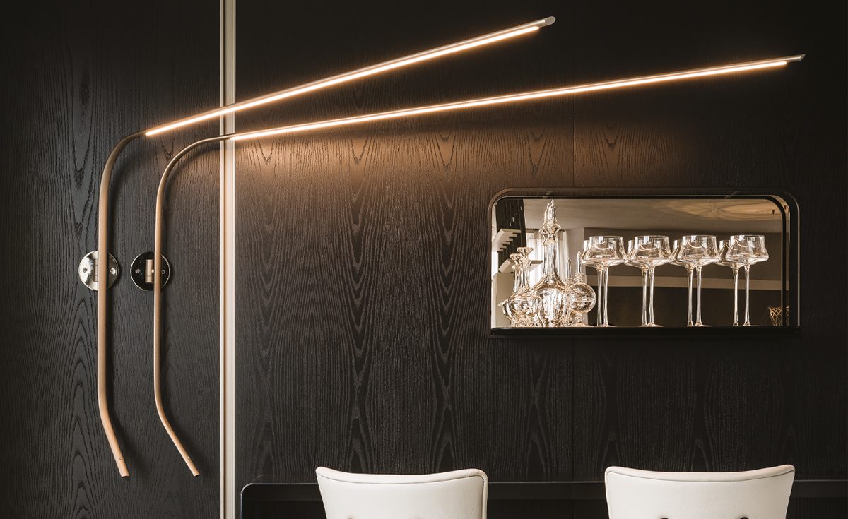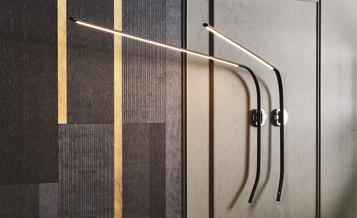 Adjustable wall lamp in titanium (GFM11) or black (GFM73) embossed lacquered steel frame. Wall plate in black chrome steel (06). Led lights.