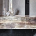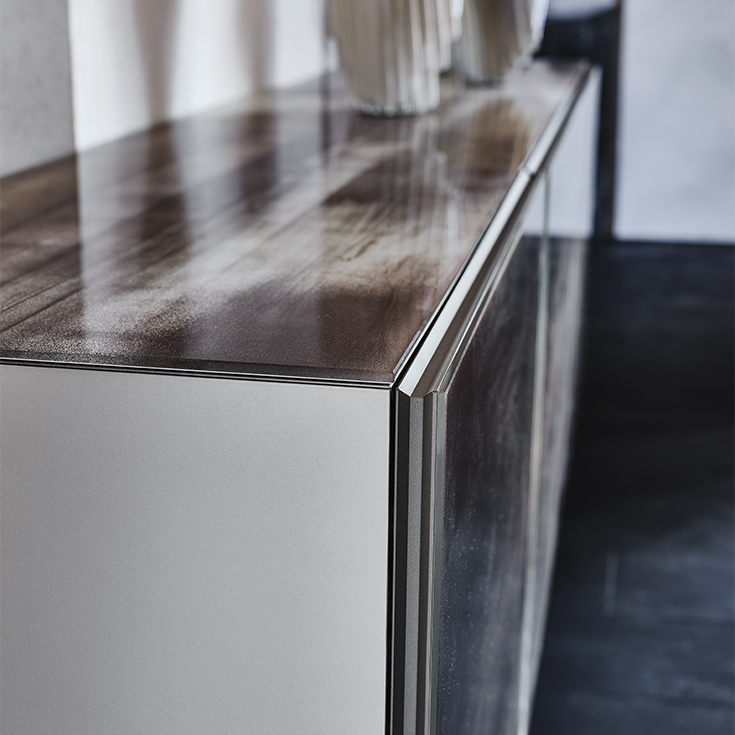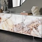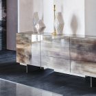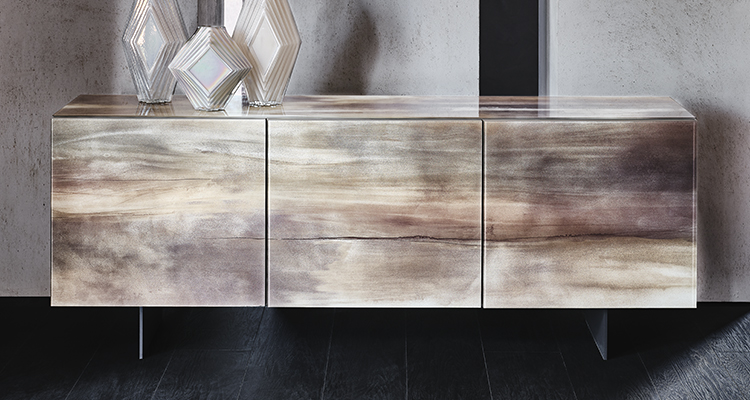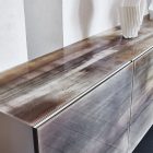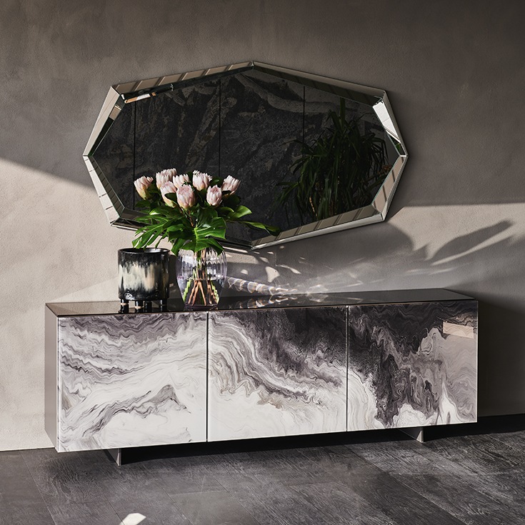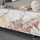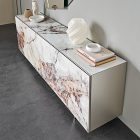 The Focus Crystalart version has been concieved with the purpose of enhancing the Crystalart printed glass decoration, previously developed for our glass table tops. This peculiar finish adds a marble-like look to the brightness of the crystal. It simultaneously adds a practical storage solution and a dazzling piece of decor to your home.